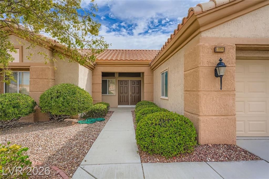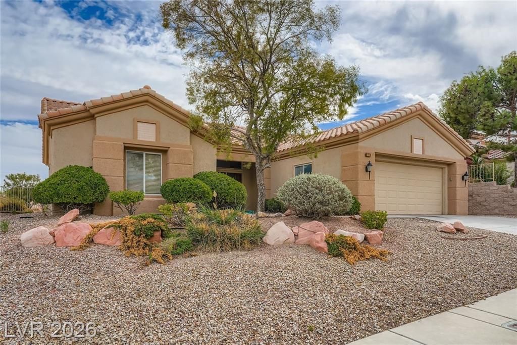 Charming Minden Model in Sun City Summerlin! This clean, colorful, and beautifully maintained 2-bedroom, 2-bath home with a 2-car garage sits on a raised, private lot, offering elevated backyard views and mountain views from the front. The thoughtfully designed floor plan features a bright, open kitchen with stainless steel appliances, granite countertops, ample cabinetry, and a pantry. The primary suite provides comfort with dual closets, including a walk-in, and a well-appointed primary bath with dual sinks. The guest bathroom has been upgraded with a granite countertop a modern, elegant sink. A new water heater adds peace of mind. Located in the premier 55+ Sun City Summerlin community, residents enjoy world-class amenities including multiple clubhouses, fitness centers, 3 golf courses, indoor & outdoor pools, pickleball courts, a softball field, & over 80 social clubs. This home offers the perfect blend of comfort, views, and an active lifestyle—don’t miss it!
