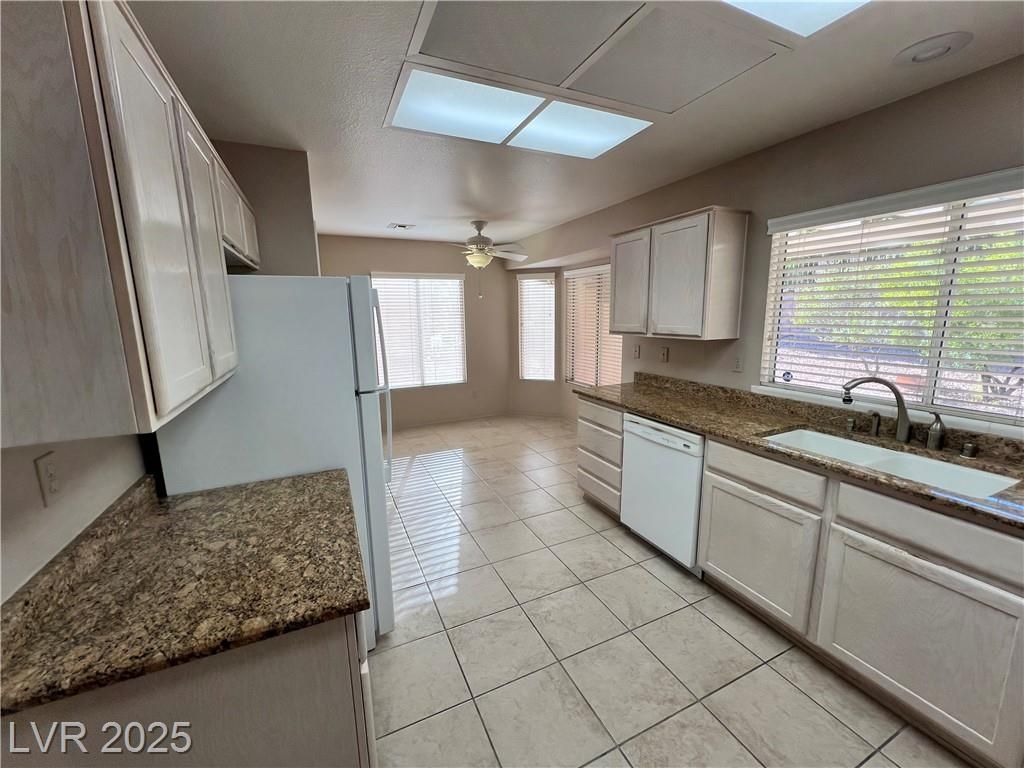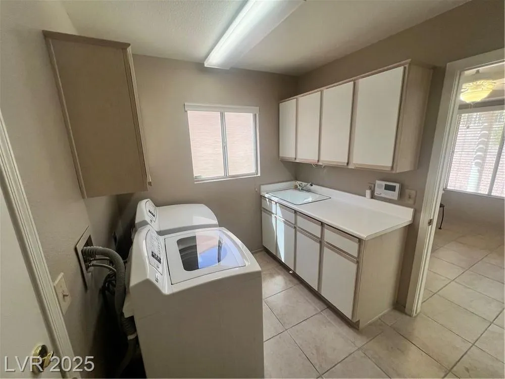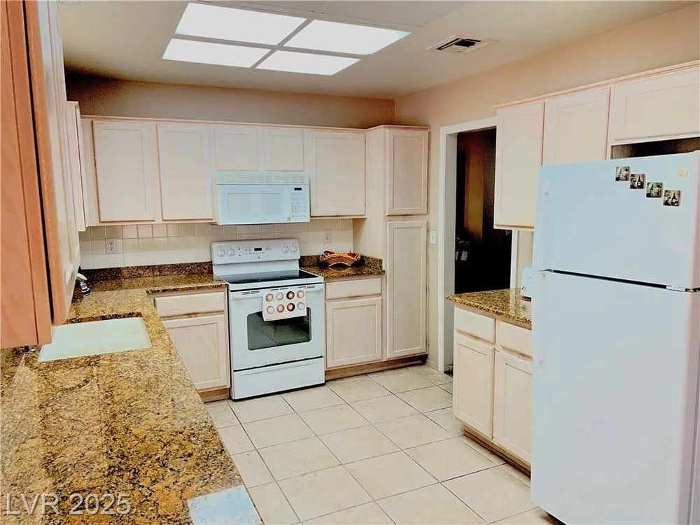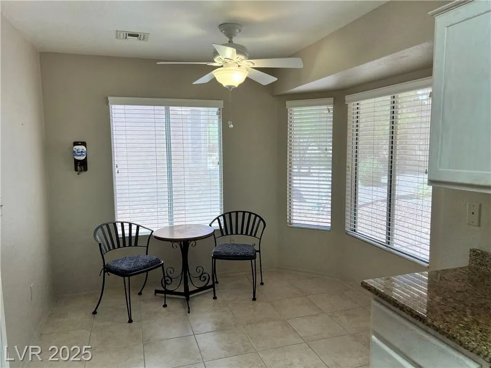 Beautiful Sun City Summerlin home located on a quiet street! This spacious two-bedroom, two-bath residence offers an ideal blend of comfort and convenience. The bright kitchen features granite countertops and a cozy breakfast nook, while the full laundry room includes a sink and built-in storage. All appliances are included for your convenience. The garage provides golf cart parking, additional built-in storage, and is looped for a water softener. Step outside to a beautifull backyard with a covered patio—perfect for relaxing. Enjoy all the charm and amenities of the Sun City Summerlin lifestyle in this wonderful home.