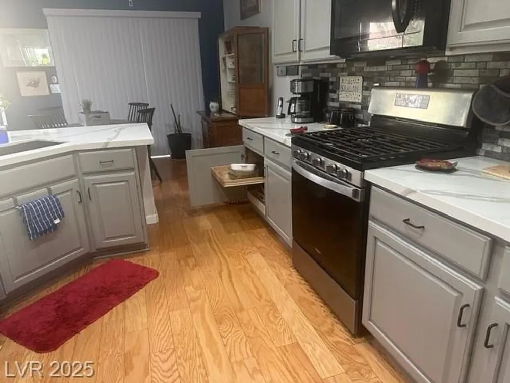 Beautiful one story house, spacious open floorplan, well organized with lots of storage, spacious 3 bedrooms, guest bathroom has new sink and toilet, primary bath has added toilet closet (not standard in this model), large primary closet with extra shelves, remodeled kitchen with extra storage, pull out shelves, beautiful quartz counter tops, new stainless steel appliances, beautiful hardwood flooring in all living spaces, tile flooring in bathrooms, carpet in bedrooms. New garage door with new opener and rails, extra storage cabinets and suspended shelves in garage. Energy efficient windows. Solar tubes skylights throughout the house for extra brightness, Water softener, newer water heater maintained yearly by contract, extended back patio with pebble stone coating, easy maintenance fully fenced backyard with turf and beautiful plants, front yard has desert shrubs and pebbles. Newer energy efficient HVAC system. Solar panels with pigeon grate (PPA) and more a must see to appreciate