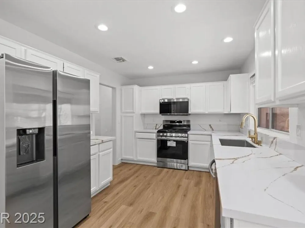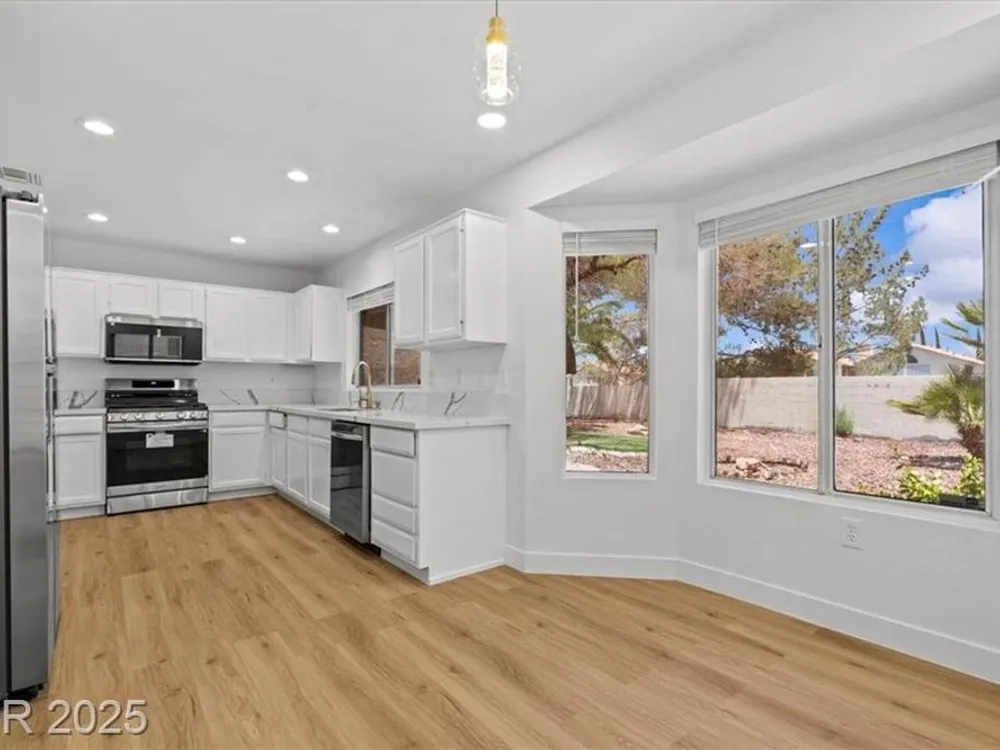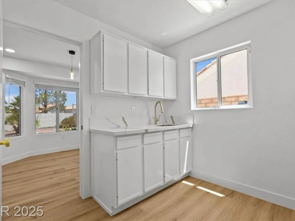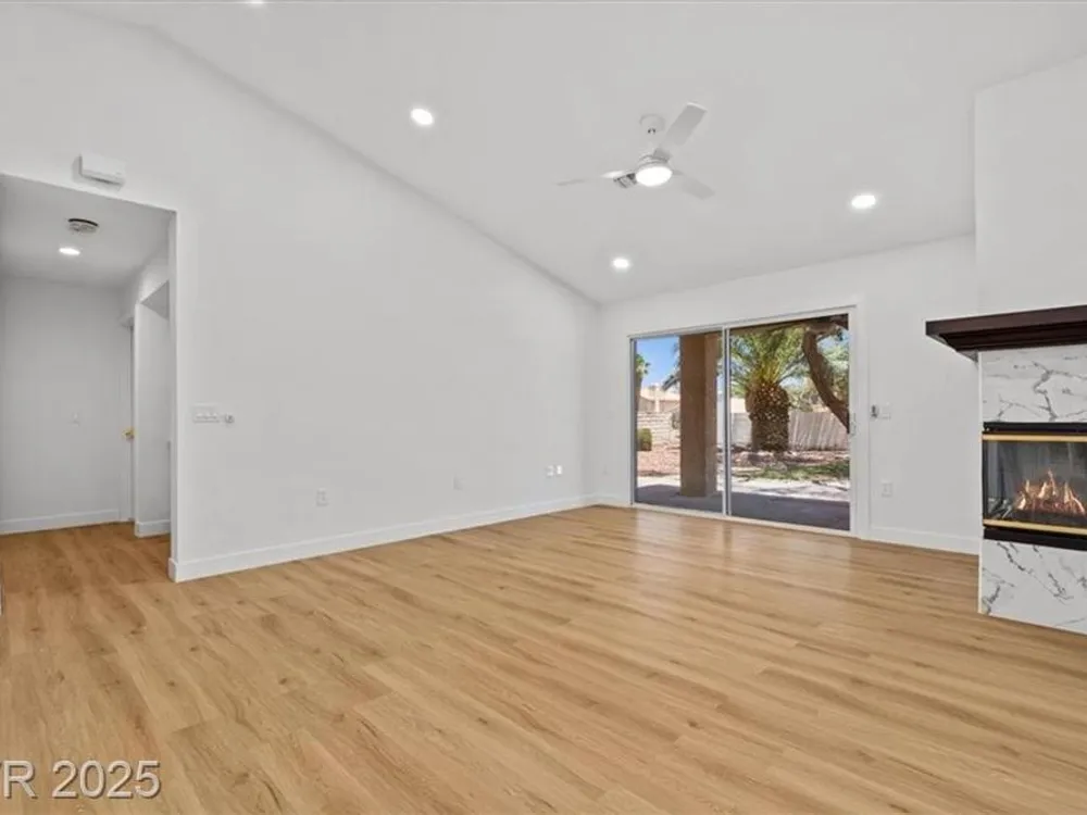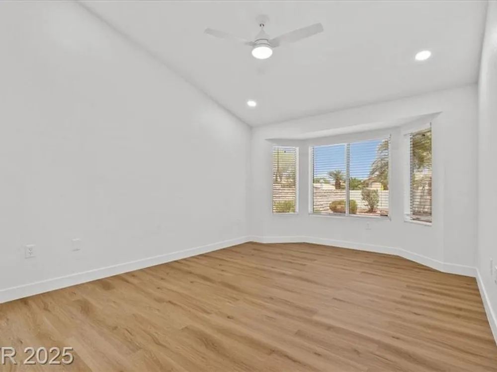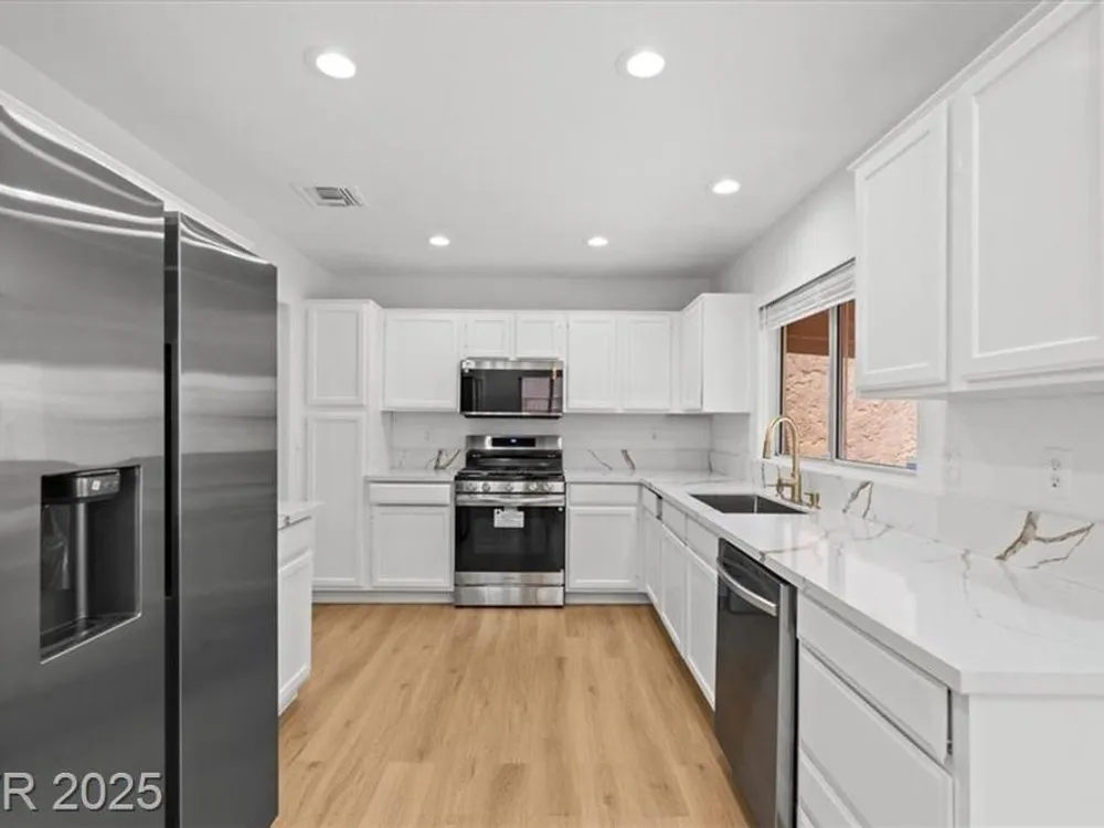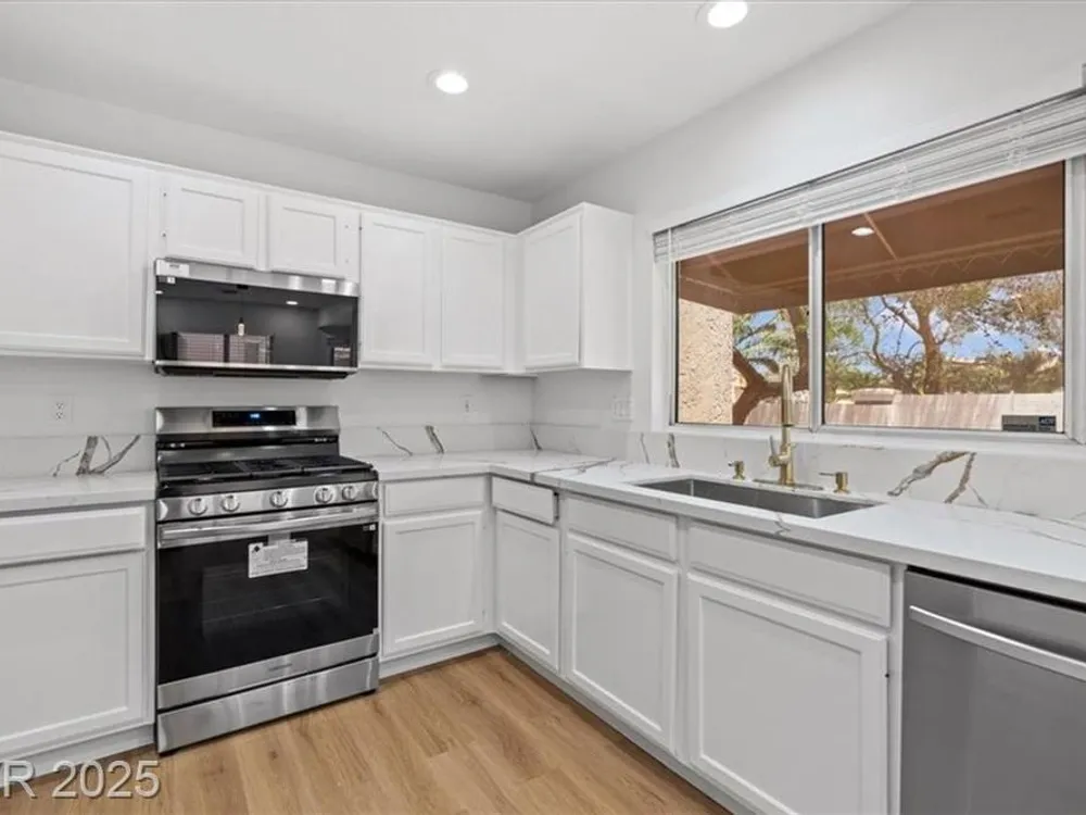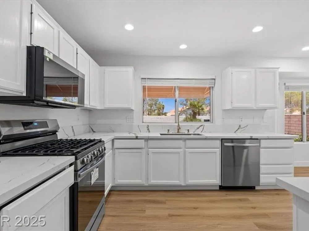 Immerse yourself in modern elegance at 2824 Morning Ridge Drive; a beautifully-renovated, single-story home in Sun City Summerlin. This 1,384 SF residence offers 2 bedrooms and 2 baths, designed with timeless style and comfort in mind. Inside, luxury vinyl plank flooring flows throughout, complemented by sleek quartz countertops in the kitchen and custom tile in the bathrooms. The kitchen shines with NEW stainless-steel appliances, and the spacious primary suite features a large custom closet with built-ins. Enjoy a huge lot with room to entertain and a garage outfitted with built-in storage. Nestled within Las Vegas’ premier 55+ community, residents enjoy world-class golf, fitness centers, pools, and social clubs—all surrounded by mountain views and mature landscapes. This is a rare opportunity to own a fully-modernized home in a vibrant, active-adult neighborhood.