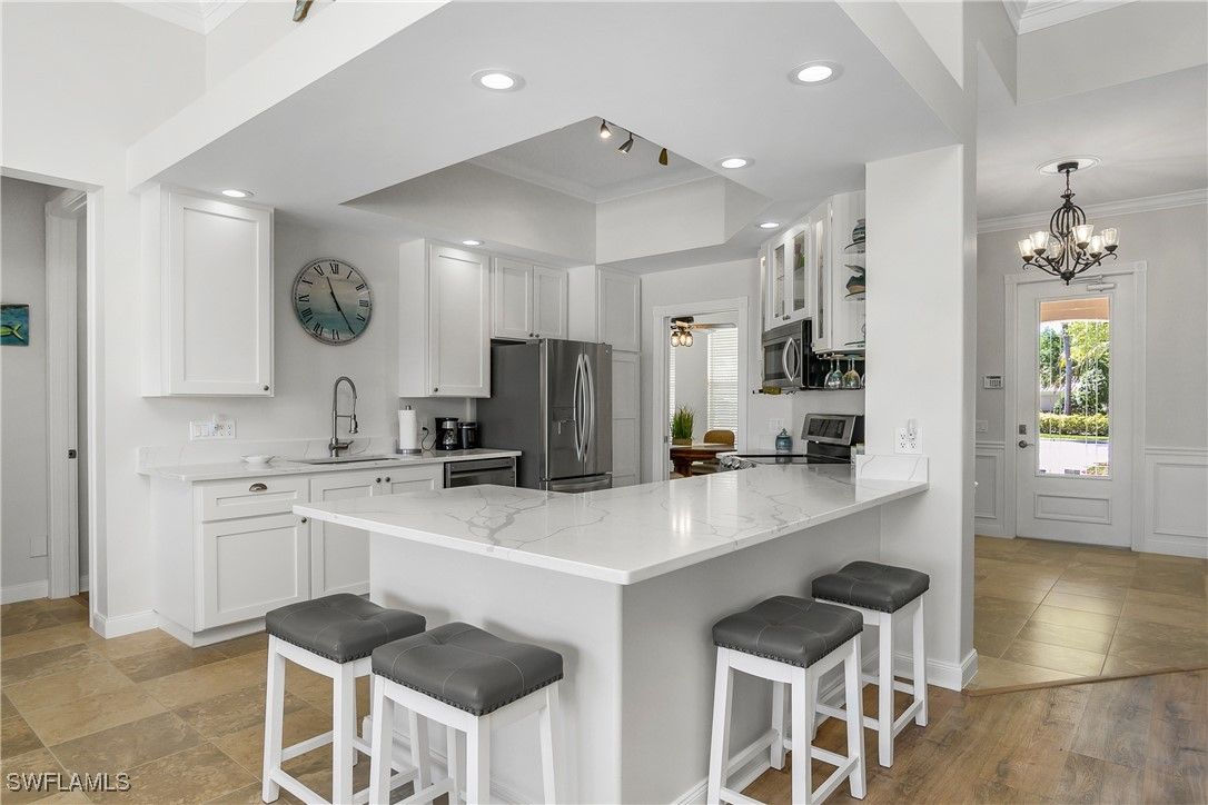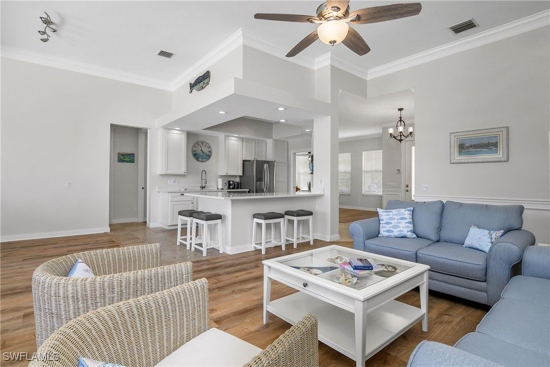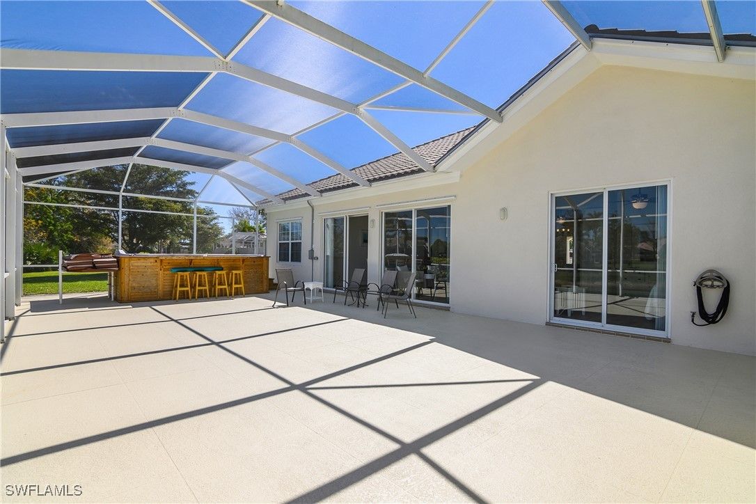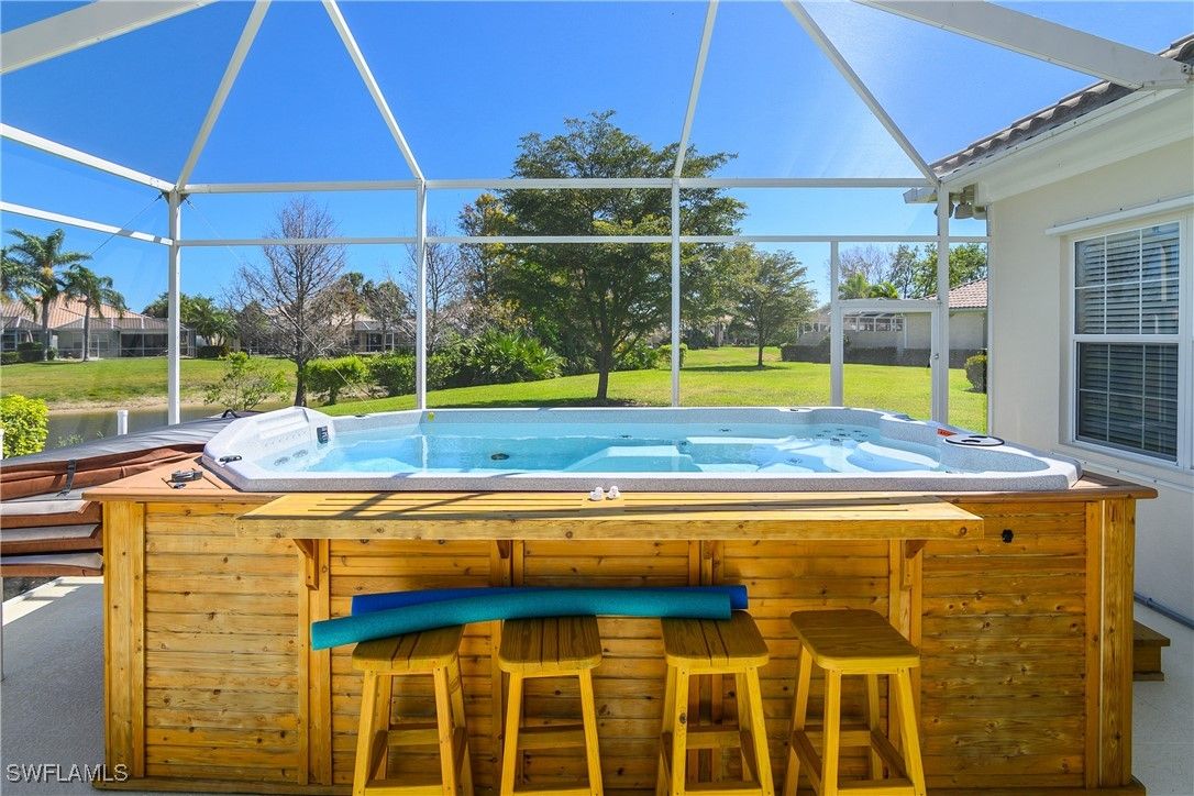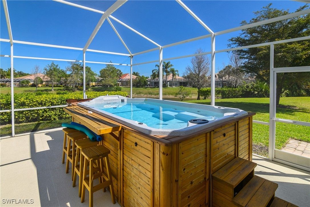 Waterview Lover? Then this is the one for you! Situated on a spacious lot in Village Walk, you have complete privacy from your lanai. If you are looking for Multi-Functional renovated rooms, check out this gem. The combination cannot be beaten. Nestled in the heart of Village Walk of Bonita Springs, this pristine home boasts one of the the largest lots in the complex, offering both space and elegance. Featuring five bedrooms, this residence awaits your personal touch – envision it as a blank slate where you can design your own floorplan to suit your lifestyle needs. If you are a front porch lover, here is where you will relax and enjoy the Florida lifestyle. But that is just the first visual of your new home. Once you open the door you will be awed by the fact that each room has been meticulously updated, showcasing the current owner’s configurations, who, despite being only two people, have utilized the five bedrooms to their advantage. This Classic Carlysle model is a must-see, with quality enhancements throughout that transforms it into its own model. How will you configure this home?. Say goodbye to carpets; this home features tile and luxury vinyl planks in every room, complemented by an abundance of ceiling fans. The bathrooms are equipped with high top counters, and elegant quartz with soft close doors that elevate the spaces. Custom doors on closets in each room add a dramatic change from the glass closet doors in the original Builders package. The updated kitchen is a chef’s dream, complete with modern amenities that add a touch of sophistication including Quartz counters, soft close doors, and Custom cabinetry that will wow you! When you look around, it will become obvious that this is THE ONE that has it all. The garage door is sealed and outfitted with a portable dehumidifier to maintain low humidity, ensuring a pristine environment. Unusual for most garages here in SWFL. At the back of the home where most of the living will be done, once outside, you step onto the expansive lanai, perfect for entertaining, and can't help but be amazed by the Swim Spa that overlooks the tranquil water. While it is a formidable structure, there is an immense lanai space to do with as you wish. Outdoor space here is not a problem. This home is truly a gem, offering both luxury and comfort in one of Bonita Springs’ most sought-after communities. If you have dreamed of owning an expansive water view home that has a unique floor plan and room for everyone, check the video and make an appointment to view this property