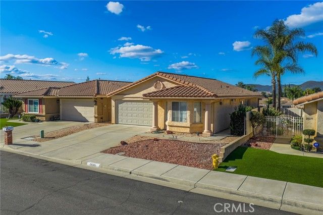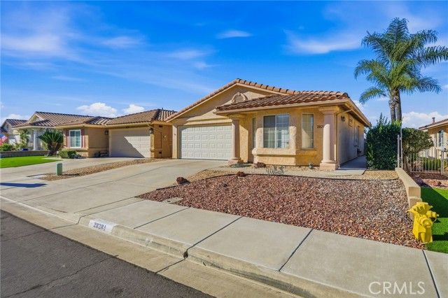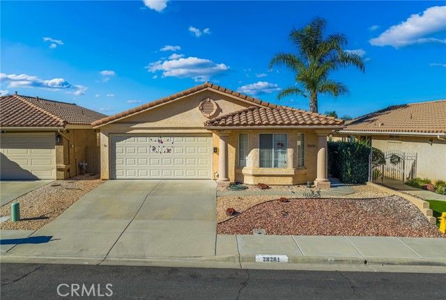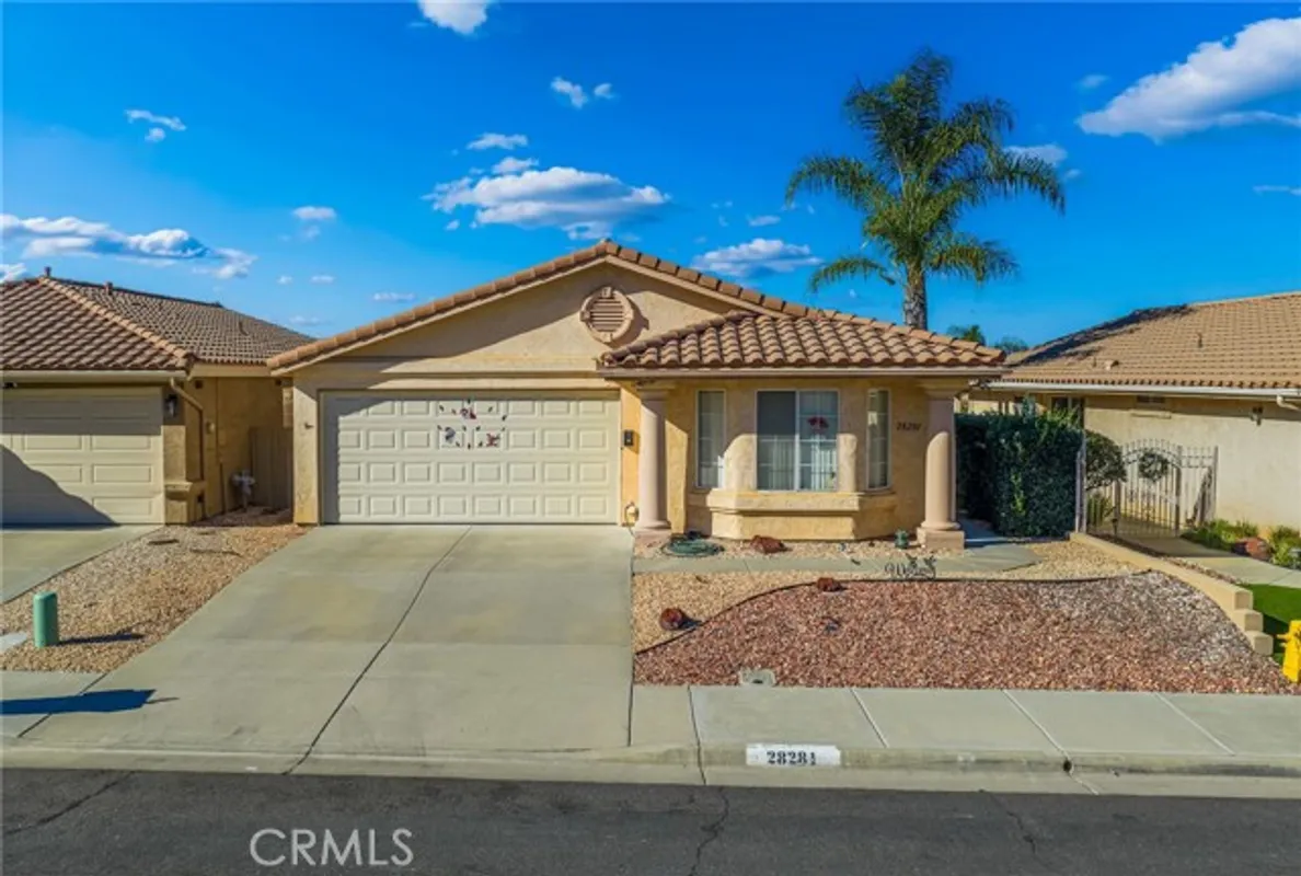 CASA BLANCA SENIOR LIVING AT ITS FINEST! Welcome to this charming 2-bedroom, 2-bathroom home located in one of Menifee's most popular 55+ subdivisions. This residence features a beautiful front elevation with enhanced exterior lighting and a private side-entrance for added security and curb appeal. The interior offers a functional kitchen with newer appliances, a gas cooktop, and a breakfast bar that opens directly to the living area-perfect for hosting friends and family. The floor plan is thoughtfully designed with bedrooms at opposite ends of the home to ensure guest privacy. Step outside and you'll find a pleasant, low-maintenance backyard. Equipped with an Alumawood patio cover, enjoy breathtaking local sunsets and mountain views. Residents enjoy premier community amenities just a short walk away, including an Olympic-size pool, spa, tennis courts, and a clubhouse featuring a massive outdoor fireplace and BBQ area. Perfectly situated near the ever-expanding Menifee Marketplace, shopping, dining, and easy I-215 freeway access. With its ideal location, "split-wing" bedroom privacy, and world-class community perks, 28281 Via Cascadita is more than just a house-it's an invitation to join a thriving, active community. Enjoy the peace of a well-lit, safe environment and the excite