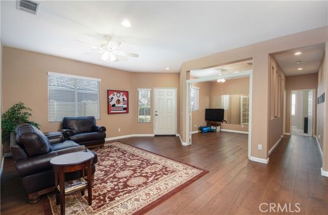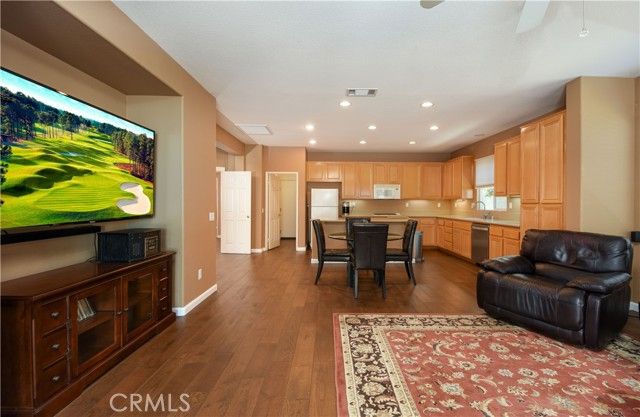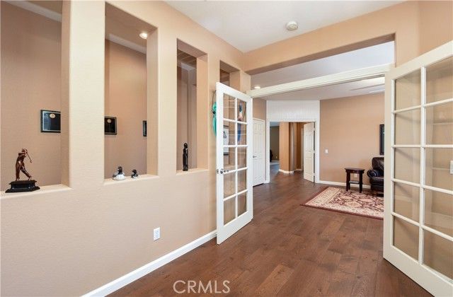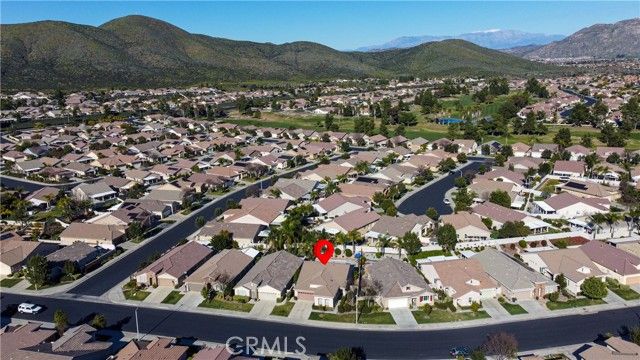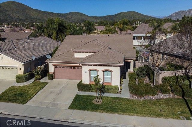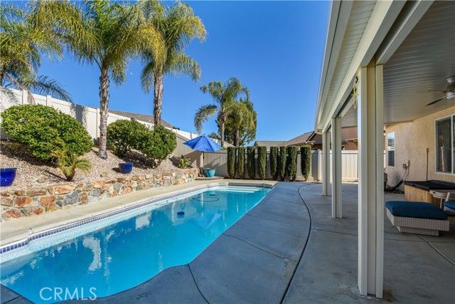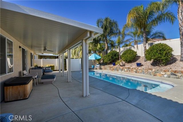 Welcome to the gated and guarded Oasis 55+ Golf Course Community, where this beautiful, move-in-ready 2-bedroom plus office home will not disappoint, offering custom engineered laminate wood flooring throughout with upgraded carpet in both bedrooms, custom ceiling fans, lighting, and window coverings, along with a gourmet kitchen featuring Corian counters, a center island, custom cabinetry, a pantry, white and stainless appliances, and custom drop-down lighting that opens to an expansive great room with a built-in custom gas fireplace; the elegant oversized primary suite includes custom window coverings, while the primary bath offers tile counters, upgraded lighting and plumbing fixtures, an elongated soaking tub, a separate step-in shower, a large walk-in closet, and a private commode area, with the guest bedroom and full bath conveniently located at the front of the home; additional highlights include an inground pool surrounded by river-rock planters, a full-length Alumawood patio cover with lighting, a custom concrete patio, amazing golf course and lake views, low-maintenance professional landscaping, and a fully finished oversized two-car garage with golf-cart parking and built-in storage, while the HOA covers front yard maintenance and trash service, all just minutes from new shopping, medical facilities, restaurants, golf, and a short drive to the famous Temecula Valley Wine Country.