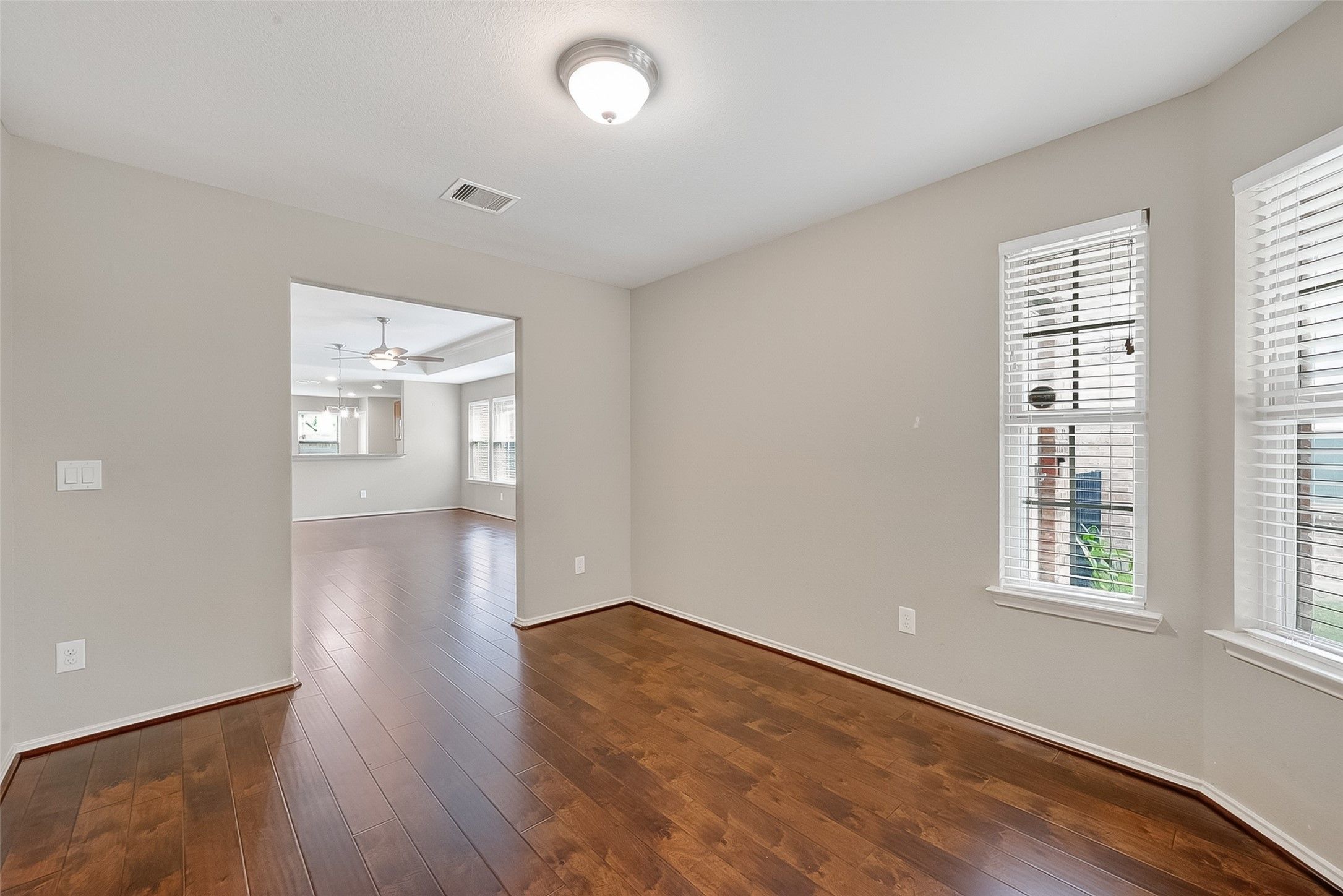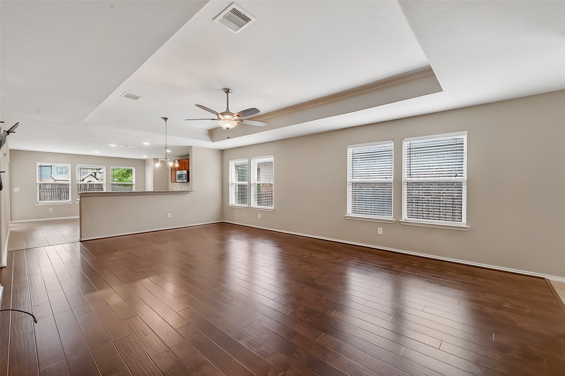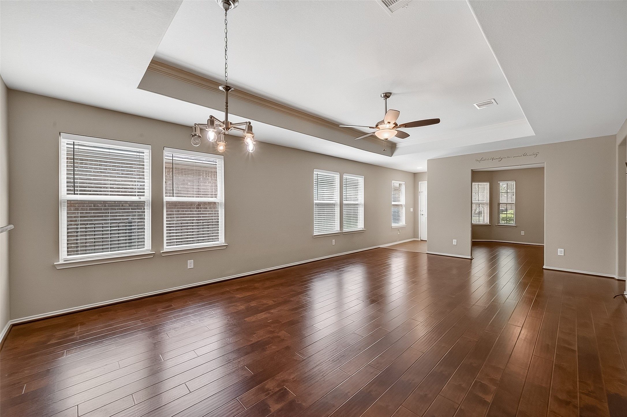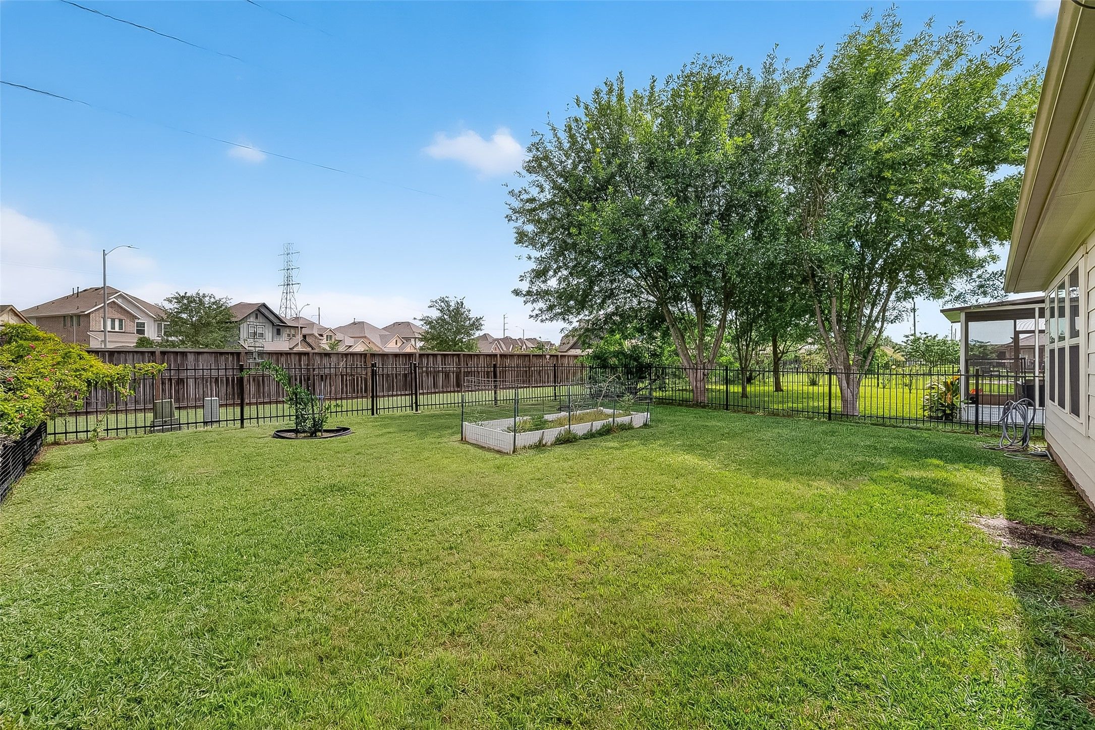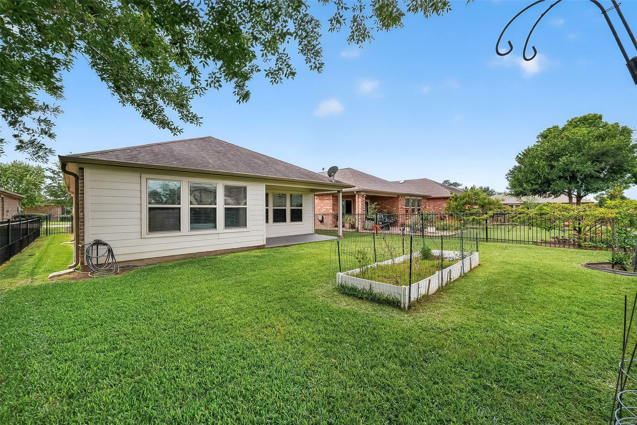 Walking distance to Del Webb Sweetgrass clubhouse • No rear neighbors • Back gate to green space • Epoxy garage floor • Gas range Single-story home in Del Webb Sweetgrass (55+ community) with 1,549 sqft on a 5,476 sqft lot, built in 2012. Kitchen includes granite countertops, stainless steel appliances, gas freestanding range, and breakfast bar, open to living and dining areas for a connected layout. Wood flooring extends through main living areas and bedrooms. Living room and primary bedroom feature tray ceilings; living room includes TV mount and pass-through cabling. Dedicated office with bay window. Primary suite includes ample closet space and oversized tiled shower. Laundry room in home. Garage includes epoxy-coated floor and bike storage. Fully fenced backyard with garden area, patio, no rear neighbors, and direct gate access to green space.