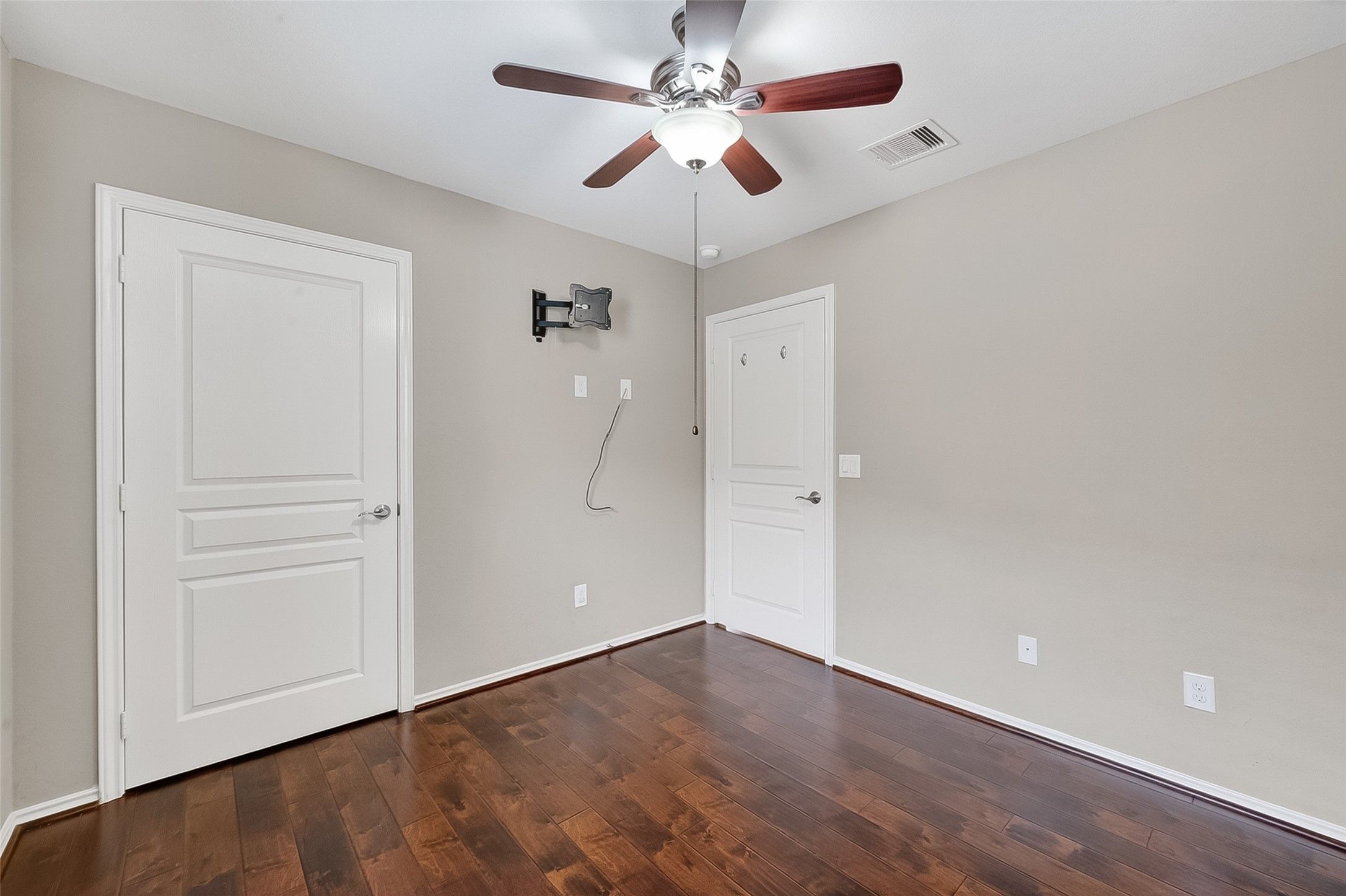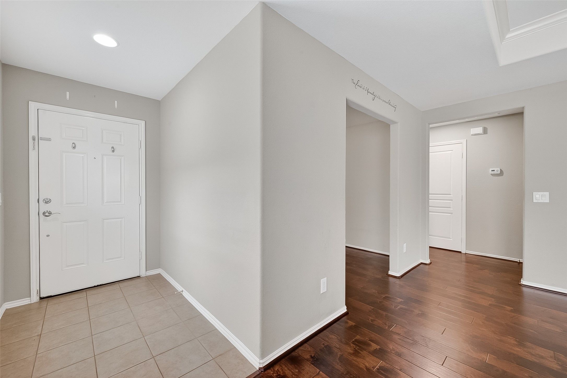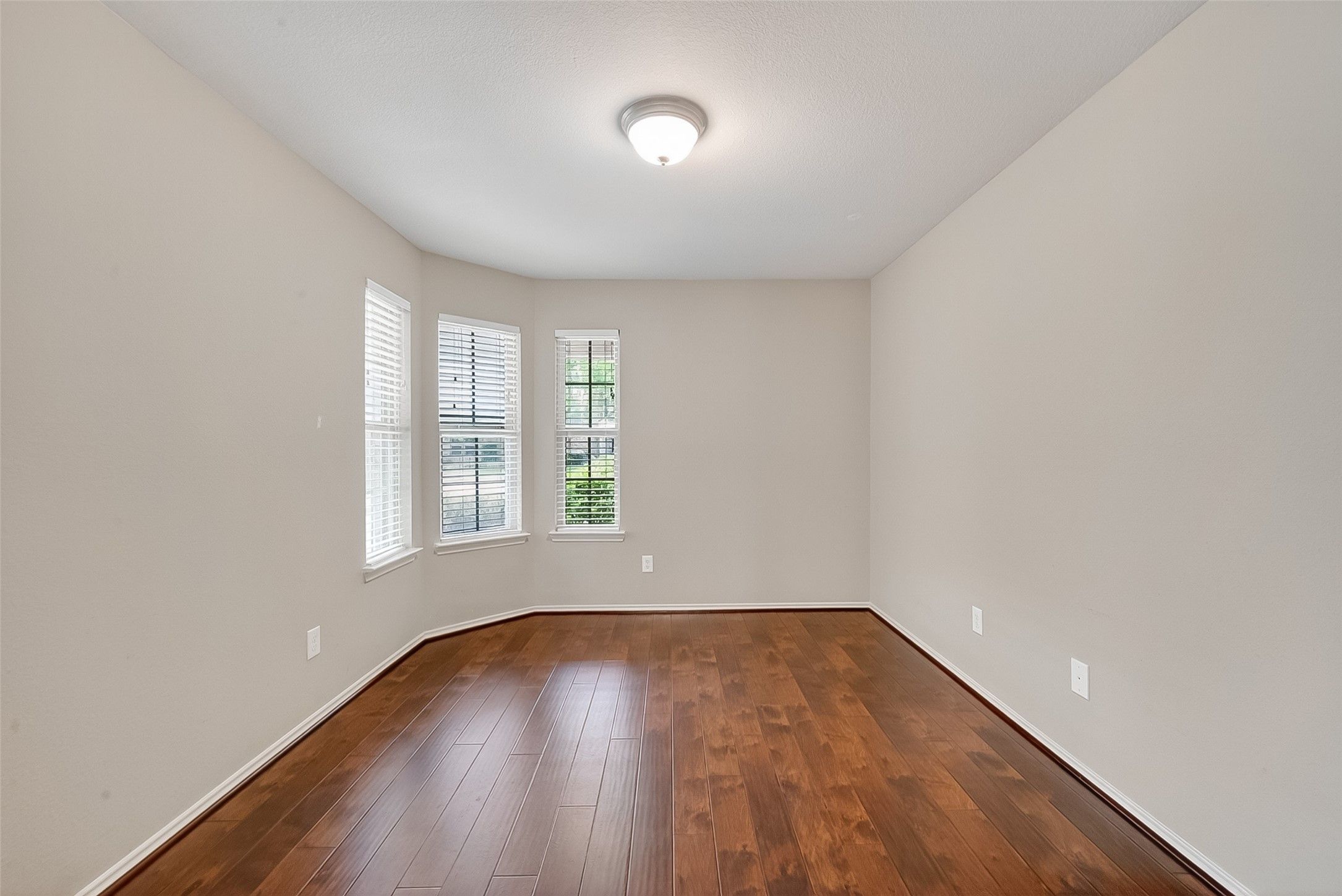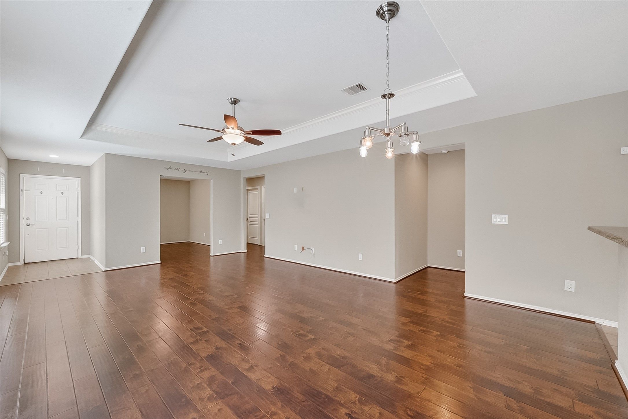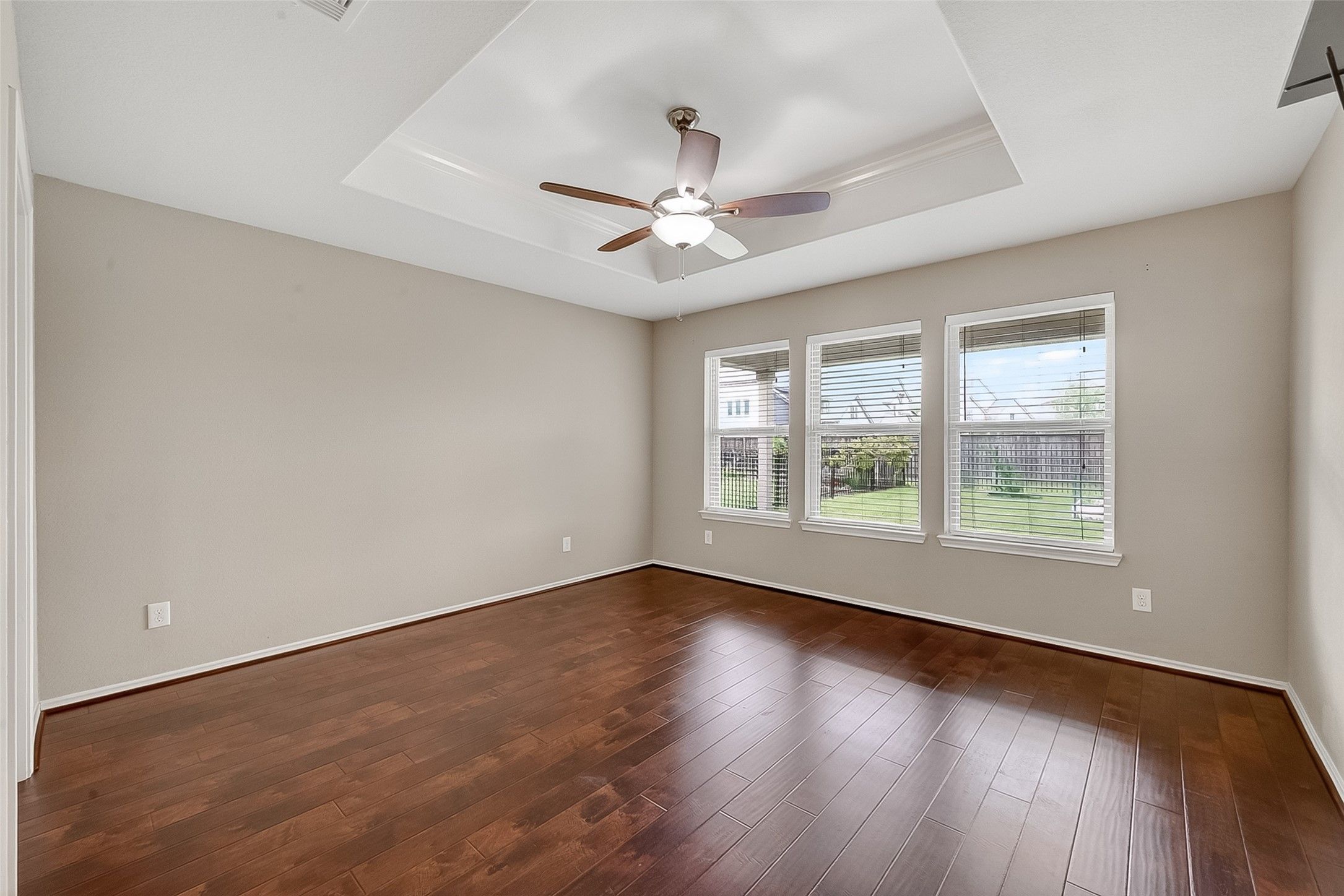 Walking distance to Del Webb Sweetgrass clubhouse • No rear neighbors • Back gate to green space • Epoxy garage floor • Gas range Single-story home in Del Webb Sweetgrass (55+ community) with 1,549 sqft on a 5,476 sqft lot, built in 2012. Kitchen includes granite countertops, stainless steel appliances, gas freestanding range, and breakfast bar, open to living and dining areas for a connected layout. Wood flooring extends through main living areas and bedrooms. Living room and primary bedroom feature tray ceilings; living room includes TV mount and pass-through cabling. Dedicated office with bay window. Primary suite includes ample closet space and oversized tiled shower. Laundry room in home. Garage includes epoxy-coated floor and bike storage. Fully fenced backyard with garden area, patio, no rear neighbors, and direct gate access to green space.