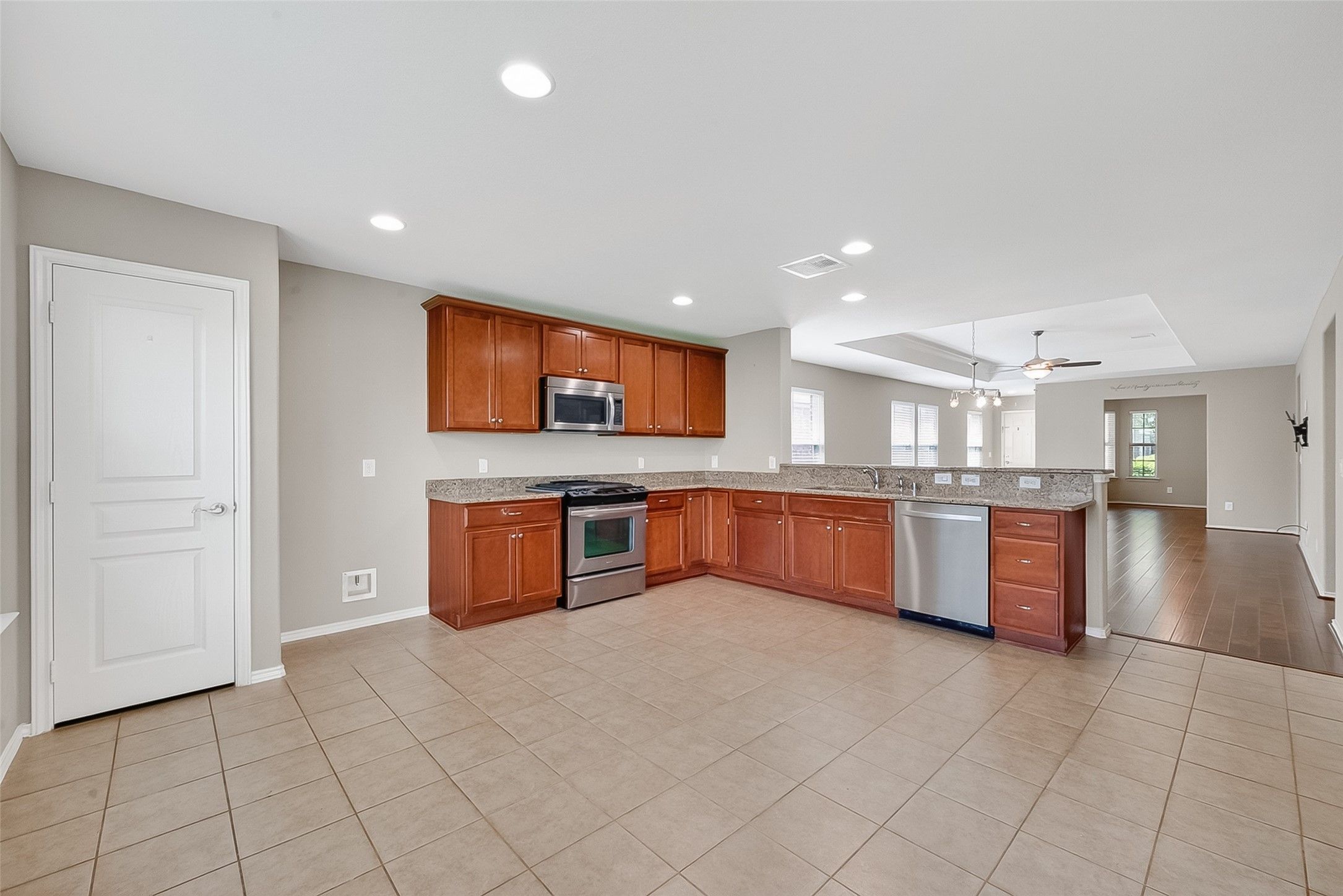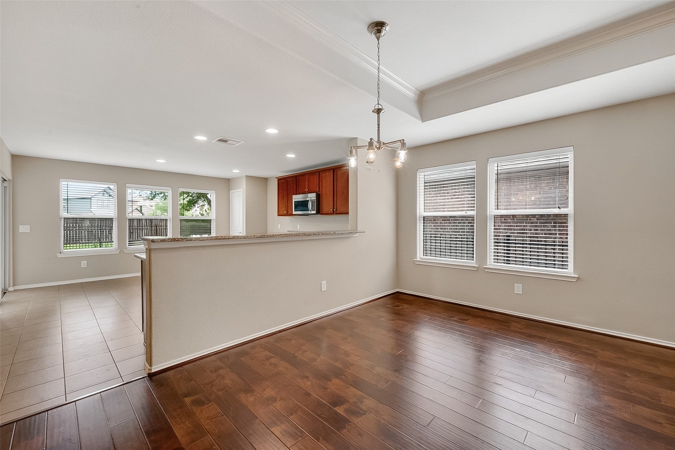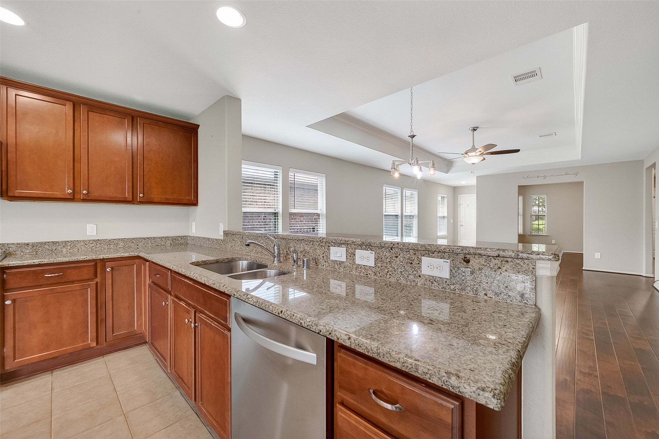 - Breakfast Bar, Crown Molding, Granite Counters, Handicap Access, High Ceilings, Kitchen/Family Room Combo, Pantry, Tub Shower, Window Treatments, Ceiling Fan(s), Kitchen/Dining Combo, Living/Dining Room, Programmable Thermostat
