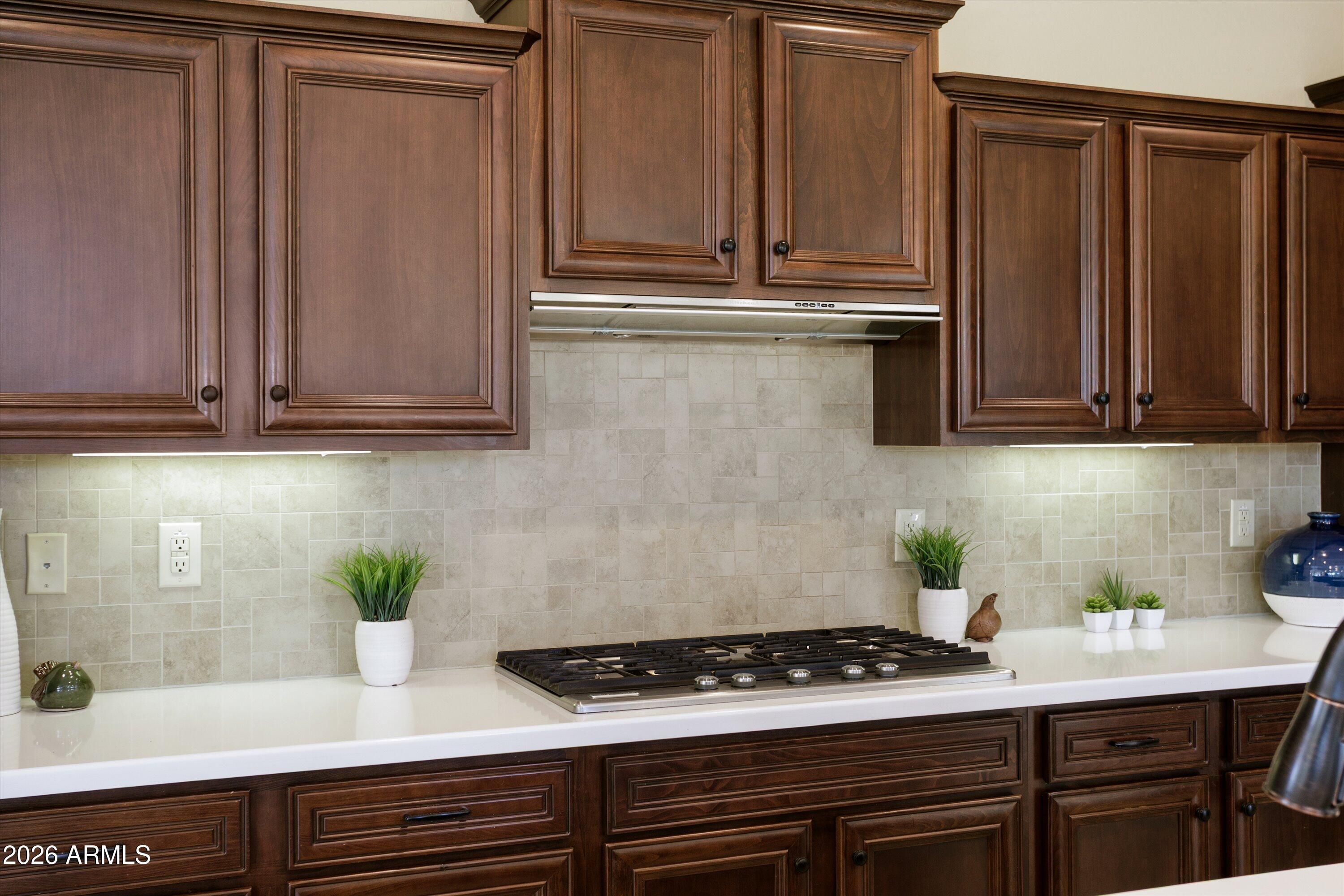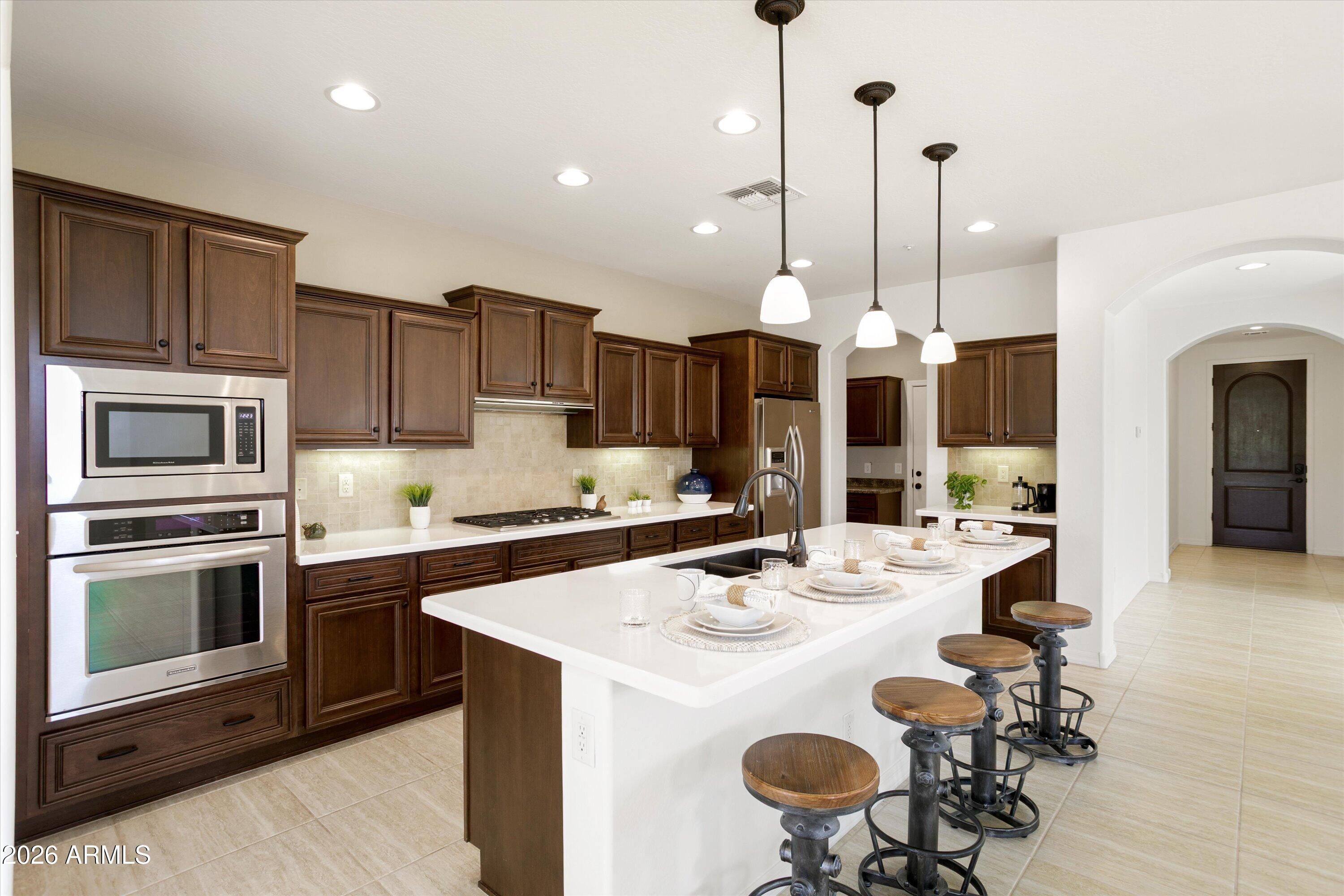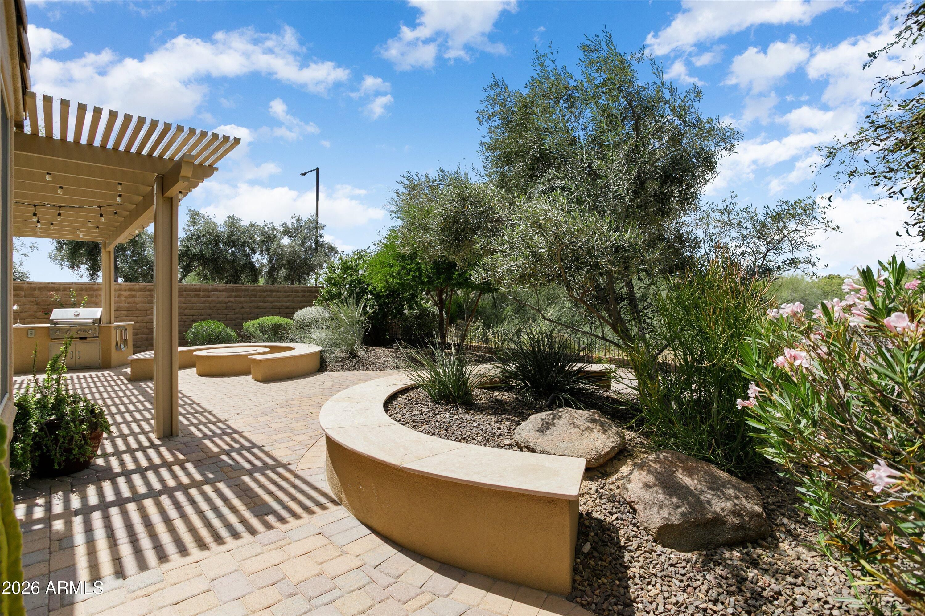 A highlight of this property lies beyond the sliding glass doors--a SPECTACULAR BACKYARD RETREAT that has been meticulously designed. Located on a WASH LOT, the outdoor space offers enhanced PRIVACY and INCREDIBLE SUNSET VIEWS. The extended patio, finished with elegant pavers, gas firepit, built-in rotisserie grill, water fountain and pergola provides ample room for lounging, dining, and entertaining. The kitchen is a centerpiece with QUARTZ countertops, a large center island, and premium staggered cabinetry. Equipped with high-end KitchenAid stainless appliances and gas cooktop, this space is perfectly suited for the serious or casual cook. The kitchen flows into the great room where a built-in media niche anchors the space and sliding glass doors open to the backyard, for an indoor-outdoor living experience. The extended primary suite has a bay window & custom closet organizing system. Both bathrooms are nicely upgraded. The Smart Space enhances the home's versatility, featuring upper and lower cabinetry along with two built-in desks, LG washer and dryer, and a walk-in pantry. Garage features a 4ft extension and built-in cabinetry with ample room for storage, hobbies, or workspace. The home's premium stone elevation enhances the curb appeal. Freshly painted interior in 2026 and exterior in 2025. This property is more than just a home--it's a lifestyle. The seamless integration of indoor and outdoor spaces allows for effortless entertaining & everyday enjoyment. Located in award-winning gated, 55+ Trilogy at Vistancia with 5-star-resort style amenities at the 35,000 SF Kiva Club with indoor & outdoor pools, fitness center, day spa, cafe, billiards, meeting rooms, library, tennis courts, pickle ball, bocce ball, events & a plethora of activities to choose from. Outstanding Gary Panks-designed golf course is woven throughout the neighborhood. The Mita Club has additional community amenities. Easy access from Trilogy to the 303, shopping, restaurants, entertainment, Lake Pleasant & Paloma Park.