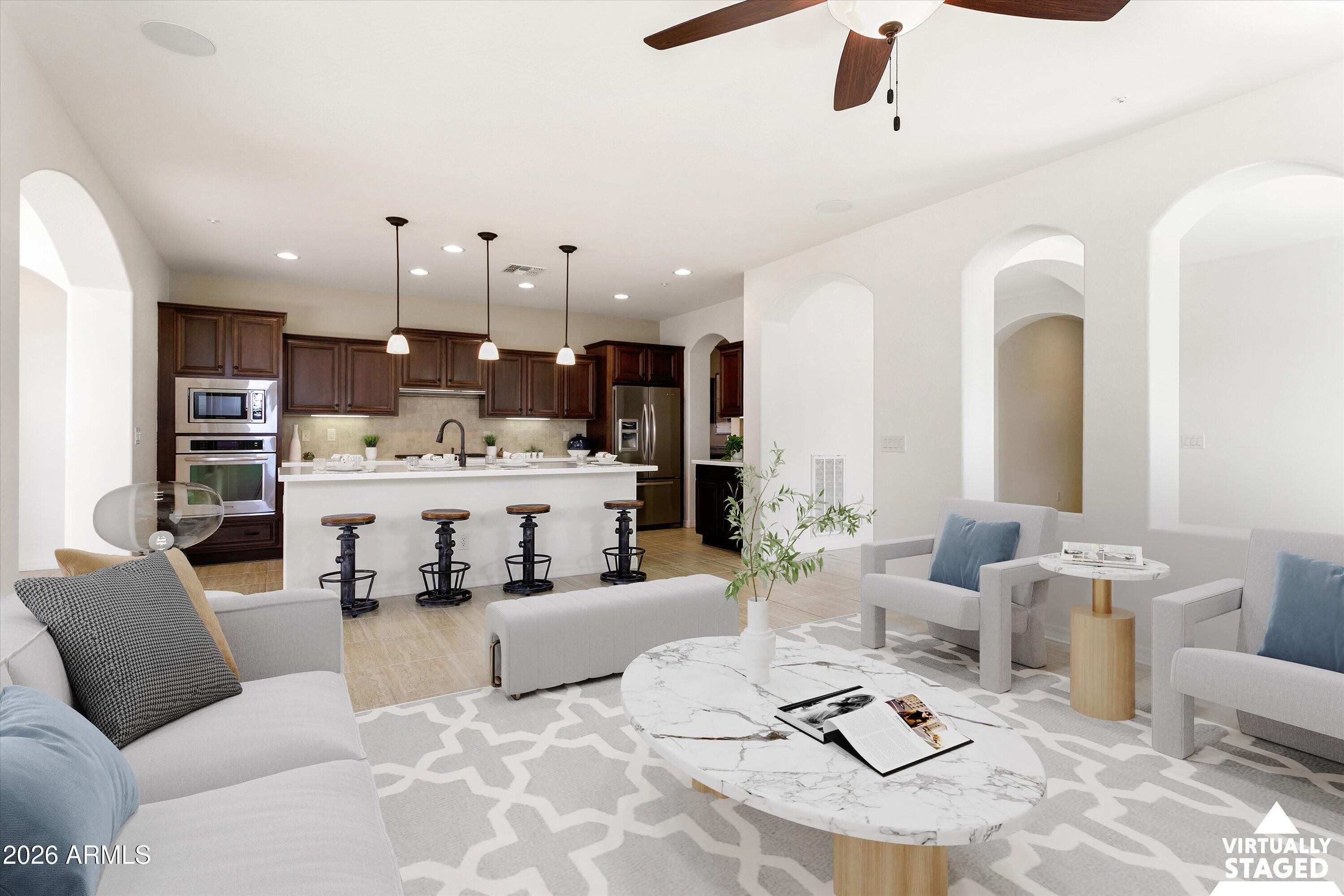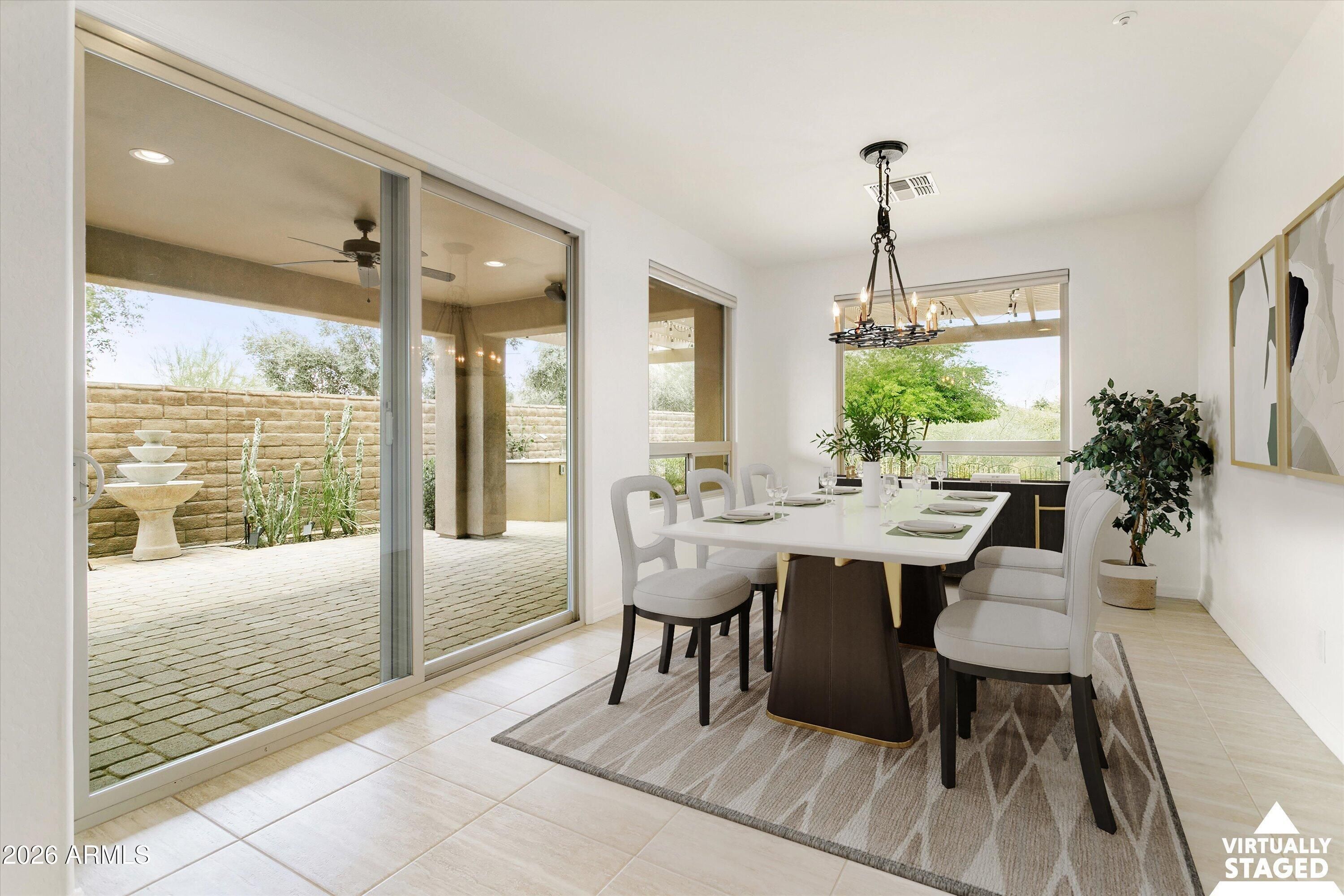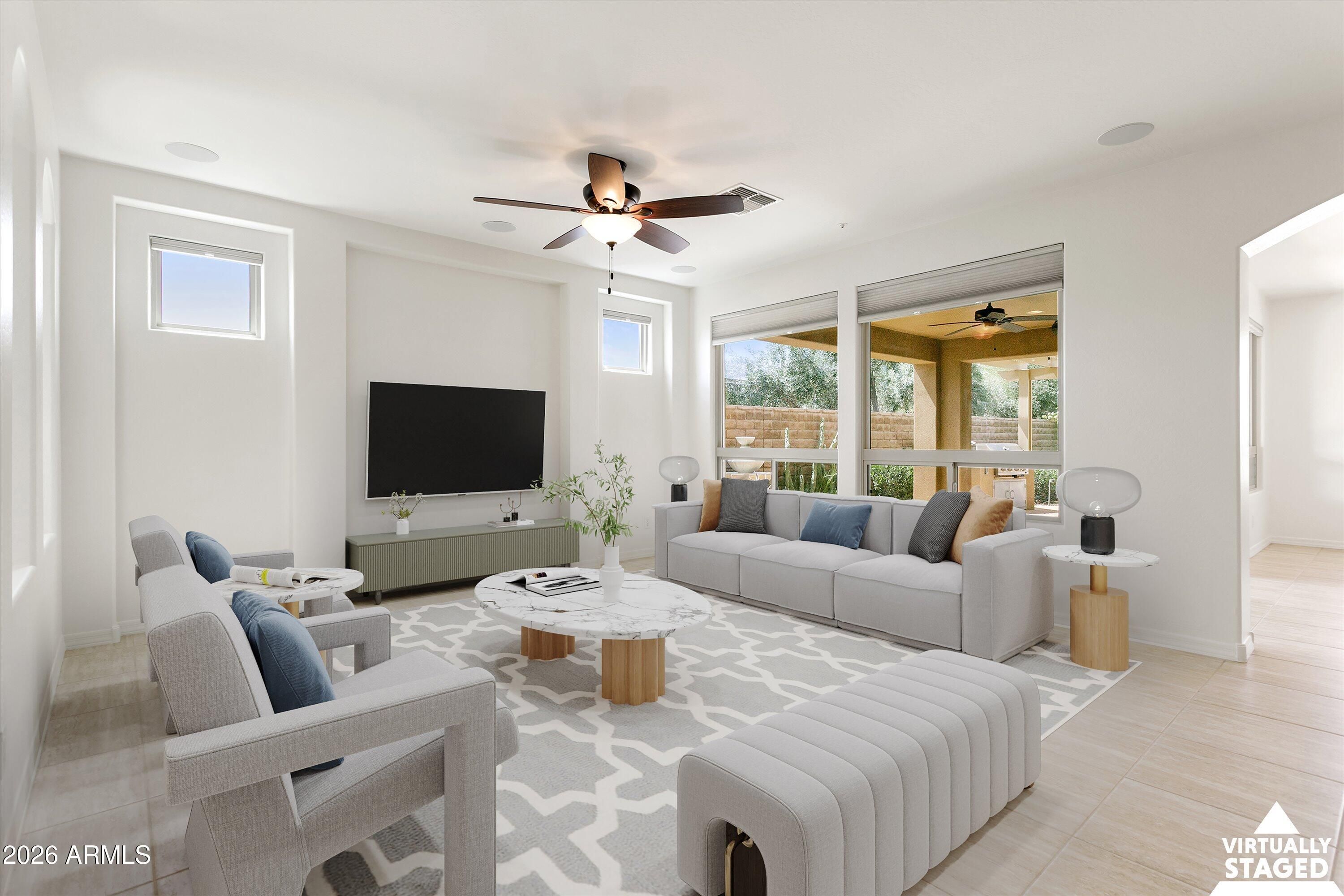 A highlight of this property lies beyond the sliding glass doors--a SPECTACULAR BACKYARD RETREAT that has been meticulously designed. Located on a WASH LOT, the outdoor space offers enhanced PRIVACY and INCREDIBLE SUNSET VIEWS. The extended patio, finished with elegant pavers, gas firepit, built-in rotisserie grill, water fountain and pergola provides ample room for lounging, dining, and entertaining. The kitchen is a centerpiece with QUARTZ countertops, a large center island, and premium staggered cabinetry. Equipped with high-end KitchenAid stainless appliances and gas cooktop, this space is perfectly suited for the serious or casual cook. The kitchen flows into the great room where a built-in media niche anchors the space and sliding glass doors open to the backyard, for an indoor-outdoor living experience. The extended primary suite has a bay window & custom closet organizing system. Both bathrooms are nicely upgraded. The Smart Space enhances the home's versatility, featuring upper and lower cabinetry along with two built-in desks, LG washer and dryer, and a walk-in pantry. Garage features a 4ft extension and built-in cabinetry with ample room for storage, hobbies, or workspace. The home's premium stone elevation enhances the curb appeal. Freshly painted interior in 2026 and exterior in 2025. This property is more than just a home--it's a lifestyle. The seamless integration of indoor and outdoor spaces allows for effortless entertaining & everyday enjoyment. Located in award-winning gated, 55+ Trilogy at Vistancia with 5-star-resort style amenities at the 35,000 SF Kiva Club with indoor & outdoor pools, fitness center, day spa, cafe, billiards, meeting rooms, library, tennis courts, pickle ball, bocce ball, events & a plethora of activities to choose from. Outstanding Gary Panks-designed golf course is woven throughout the neighborhood. The Mita Club has additional community amenities. Easy access from Trilogy to the 303, shopping, restaurants, entertainment, Lake Pleasant & Paloma Park.