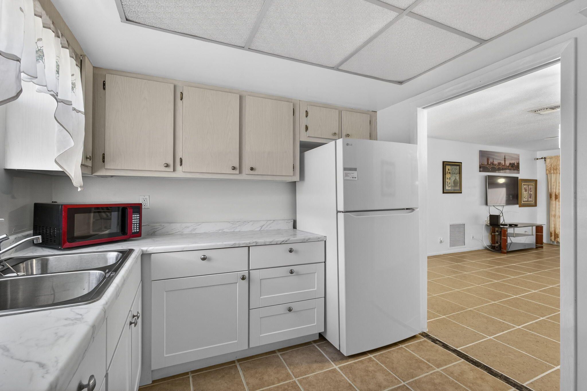 Welcome home to this inviting residence featuring tile floors & interior that enhances the open living and dining room combination—perfect for everyday living and entertaining. The partially updated kitchen offers updated lower cabinets and countertops, along with a newer LG refrigerator. The home features one full bathroom with an updated commode and a tub/shower combination. The guest bedroom includes a ceiling fan and laminate flooring, while the primary bedroom showcases classic parquet flooring. Major upgrades include a newer Ameristar air-conditioning system, a replaced water heater (2020), and an updated General Electric electrical panel, offering peace of mind. Enjoy the enclosed screened patio with a convenient storage closetm leading to a paved backyard area.