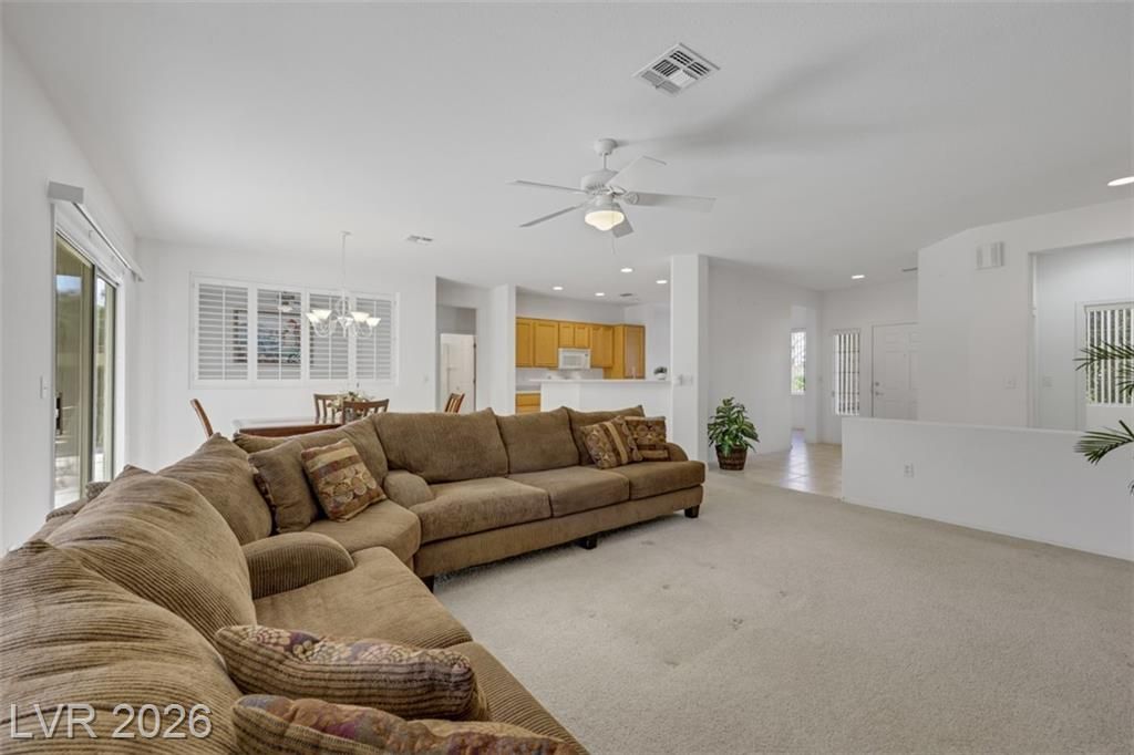 An extended Independence model with 2 master suites, one study, and three baths. It has a very functional floor plan with bedrooms on opposite sides of the property for added privacy. The study has shutters that open to the great room. It can easily be made into a third bed room. Kitchen has a bar counter and a spacious dining area with windows that brings in lots of light. The backyard has an extended covered patio and is nicely landscaped. Come live in this wonderful community and enjoy all the amenities that Sun City Anthem has to offer. This includes three recreation and fitness centers, five swimming pools, tennis and pickle balls courts, walking trails, and a very diverse social calendar.