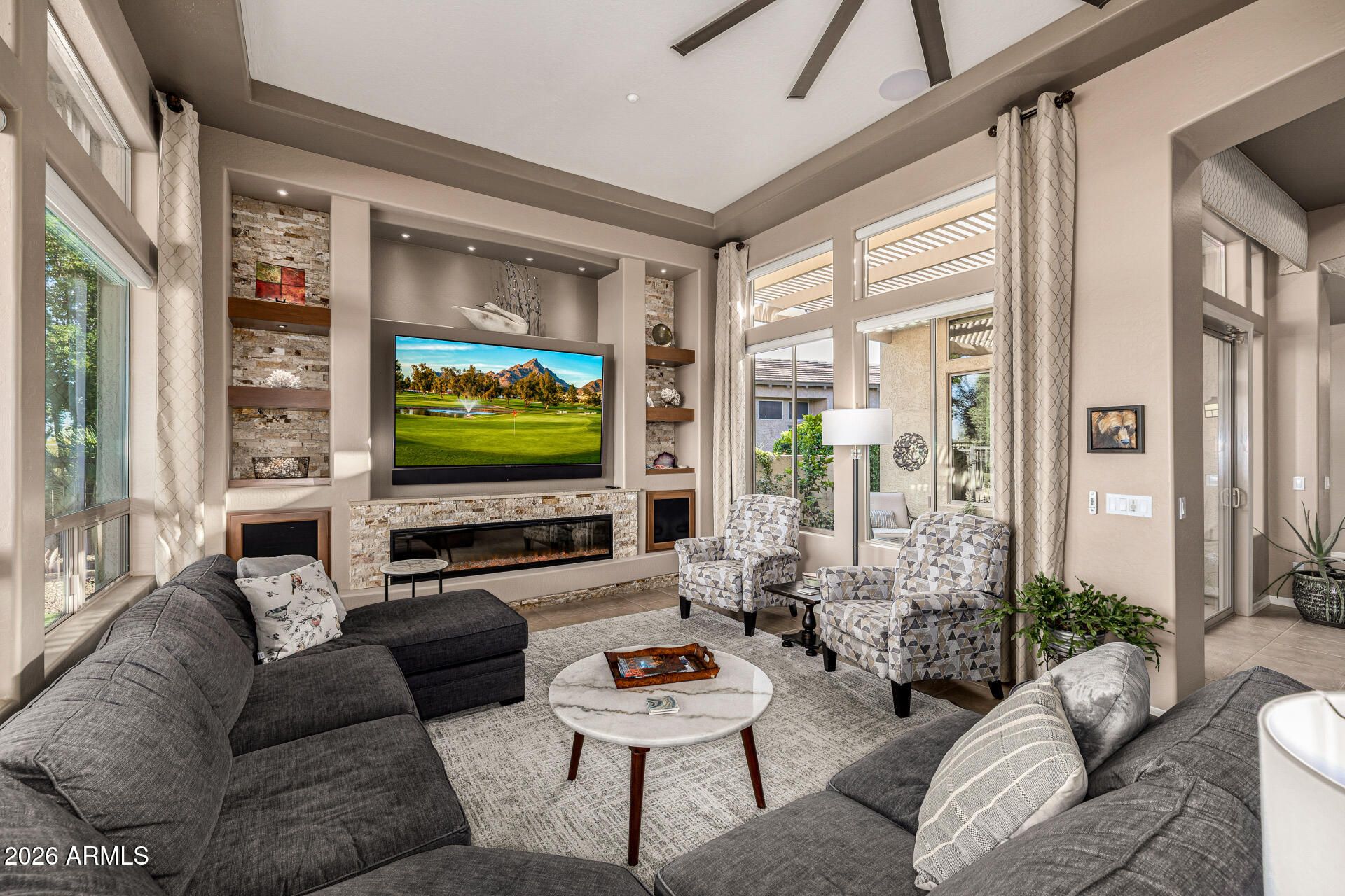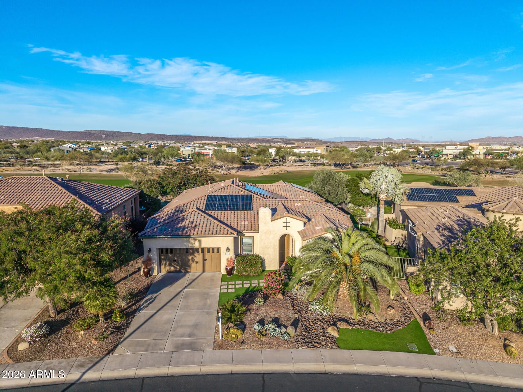 PANORAMIC 180° GOLF COURSE VIEWS on the 10th Fairway with OVER $200,000 IN UPGRADES and a rare 9,386 SQ. FT. OVERSIZED LOT in Trilogy at Vistancia. This spectacular Aurora floorplan is an entertainer's home, offering sweeping east-facing views of the 10TH FAIRWAY AND GREEN, blending LUXURY FINISHES with thoughtful modernization throughout. The dramatic Great Room features soaring 12-FOOT TRAY CEILLING and a stunning $35,000 CUSTOM MEDIA WALL with 74'' FIREPLACE, stacked travertine stone, custom shelving, and accent lighting. The gourmet kitchen has been refreshed with newly painted WHITE CABINETRY AND DESIGNER BACKSPLASH, and includes DUAL ISLAND, TWO SINKS, luxury countertops, built-in stainless appliances with GAS COOKTOP, and ROLL-OUT SHELVES. The exceptional primary suite show fully REMODELED SPA-STYLE BATH (APPROX. $30K), CUSTOM CLOSETS (APPROX. $10K), and a rare oversized bonus room ideal for a media room, private retreat, office, fitness space, or potential third bedroom. Major upgrades include OWNED SOLAR with updated PowerCore battery module, 2 NEWER A/C UNITS, TANKLESS WATER HEATER, Tesla charger, REMODELED GUEST BATH AND POWDER ROOM, and water softener replaced Summer 2025. Outdoor living features an expansive paver patio with CUSTOM WATERFALL AND POND, BREATHTAKING GOLF COURSE VIEWS, plus a private ENCLOSED COURTYARD WITH PERGOLA just off the kitchen. Located across from green space and minutes to Kiva Club, V's Taproom, and the golf shop, this is resort-style living at its finest. Welcome to the active adult community of Trilogy at Vistancia where you will find outstanding amenities, including 2 clubhouses, pickleball, tennis, bocce ball, fitness centers, swimming & golf, just to name a few! Trilogy is part of the community of Vistancia, a master-planned development that includes beautiful homes, parks & hiking trails, award-winning community centers & golf courses, commercial & retail shops, along with incredible rolling hills & desert landscape all around! The future 320-acre 5 North at Vistancia commercial core is coming soon, home to the new ALA K-12 charter school. Vistancia has ranked as the #1 Master Planned Community in AZ for 12 years in a row (2013-2024)! Resort-style living at its best. Come & see why!