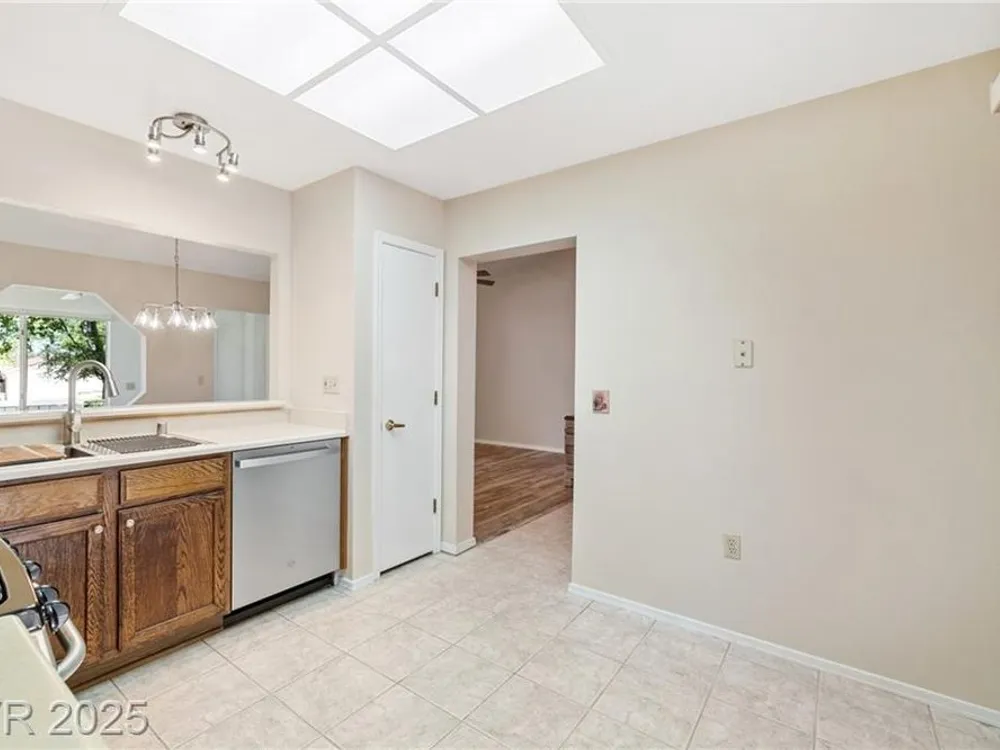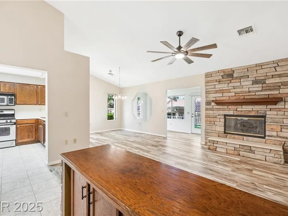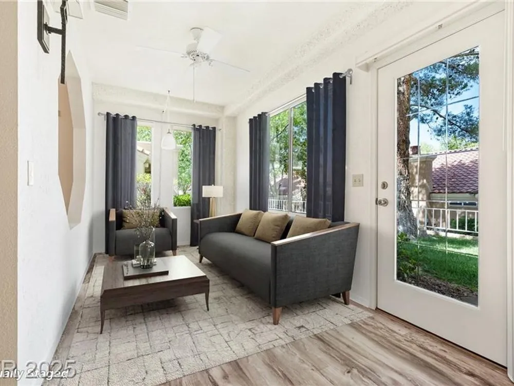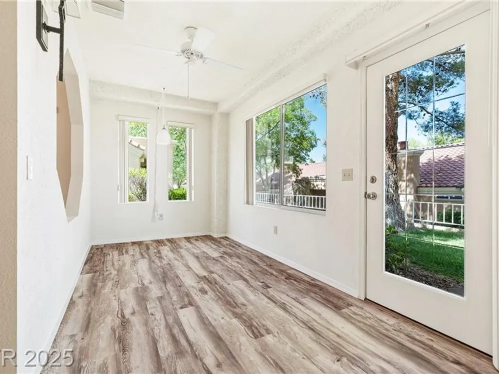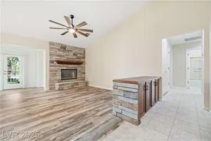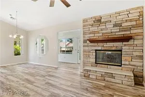 Beautiful 2bd, 2ba 1323sq/ft townhome in Sun City Summerlin 55+ is perfectly designed w/ vaulted ceilings in living & dining areas. New laminate flooring in living, dining & bedrooms, w/ new paint throughout making it clean & inviting. The stunning fireplace w/ cultured stone & travertine hearth is perfect for cozy evenings. Kitchen has new Kohler sink w/ sleek Moen faucet & new GE stainless dishwasher. Primary bath has new tile floor, toilet, faucet & new trim in shower & tub. The front & rear feature motion-activated porch lights for added security & convenience; new ceiling fans & light fixtures throughout the home ensure a comfortable climate year-round. Garage features new epoxy flooring that’s both durable & easy to maintain. The garage door can be conveniently operated via an exterior keyed switch & wall pad, providing effortless access. Additionally, 2 smart-key entries on garage door, new water heater & Hotpoint clothes washer ensures this home is ready for years of enjoyment.