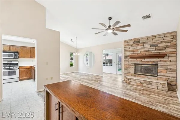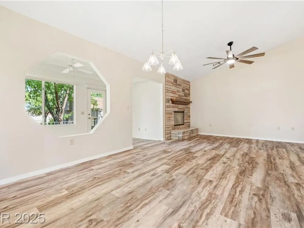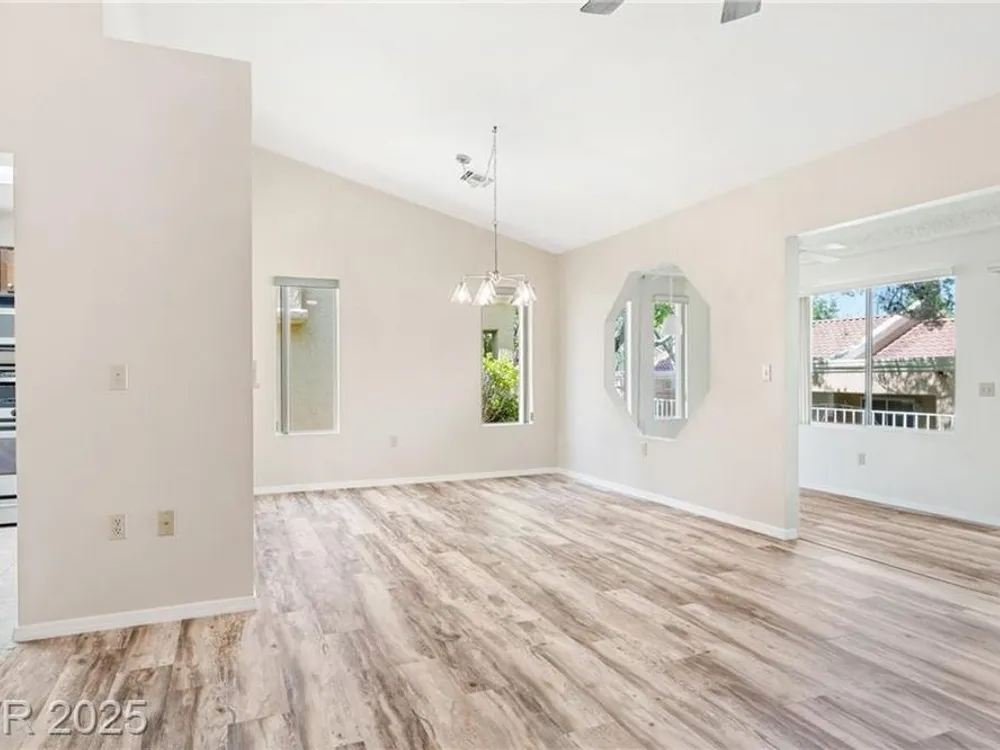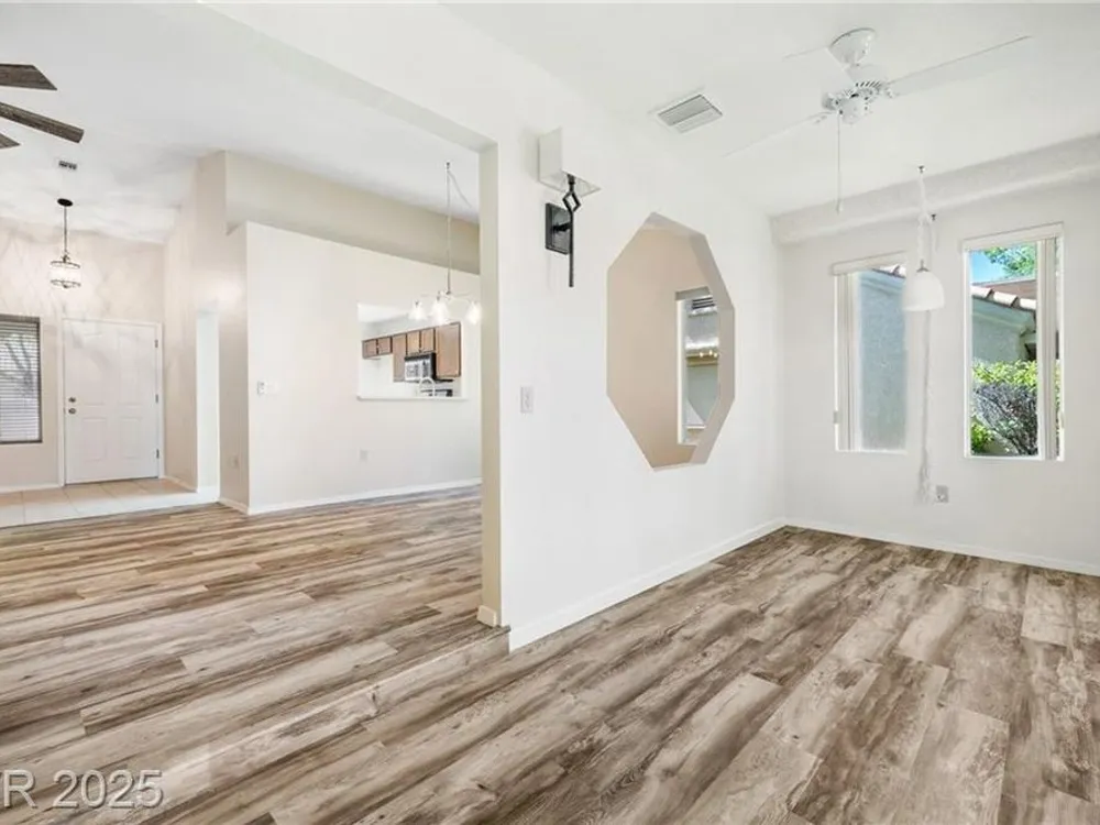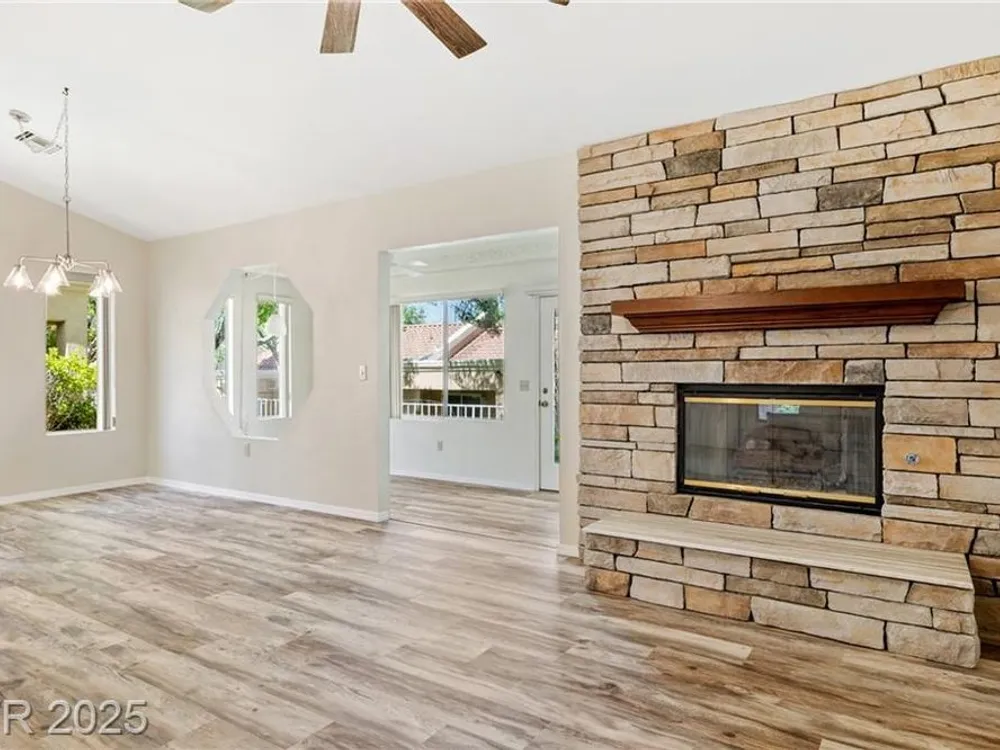 Beautiful 2bd, 2ba 1323sq/ft townhome in Sun City Summerlin 55+ is perfectly designed w/ vaulted ceilings in living & dining areas. New laminate flooring in living, dining & bedrooms, w/ new paint throughout making it clean & inviting. The stunning fireplace w/ cultured stone & travertine hearth is perfect for cozy evenings. Kitchen has new Kohler sink w/ sleek Moen faucet & new GE stainless dishwasher. Primary bath has new tile floor, toilet, faucet & new trim in shower & tub. The front & rear feature motion-activated porch lights for added security & convenience; new ceiling fans & light fixtures throughout the home ensure a comfortable climate year-round. Garage features new epoxy flooring that’s both durable & easy to maintain. The garage door can be conveniently operated via an exterior keyed switch & wall pad, providing effortless access. Additionally, 2 smart-key entries on garage door, new water heater & Hotpoint clothes washer ensures this home is ready for years of enjoyment.