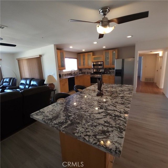 Best in Show! Stunning 55+ View Home in Menifee’s Sun City! Discover unparalleled curb appeal and prime location in this breathtaking 2-bed, 2-bath masterpiece, nestled on a sprawling lot with RV parking potential in a vibrant 55+ community. This home is a rare gem, blending modern elegance with an unbeatable lifestyle! Step into an open-concept haven featuring a bright living room, dining area, cozy family room with a fireplace, and a theater/media room with built-in speakers and sliders to a covered patio—perfect for entertaining. The updated kitchen dazzles with granite counters, a large freestanding island/breakfast bar with cabinetry and wine cooler, sleek frosted glass cabinets, and newer stainless steel appliances. Newer flooring and ceiling fans flow throughout, stained glass entry door and new vinyl windows, sliding doors and recessed lighting enhancing the home’s fresh, modern vibe. Marvel at stunning views through the family room’s expansive picture window, and unwind in the serene ambiance of no rear neighbors. The spacious, air-conditioned two-car garage and huge laundry/utility room add convenience and versatility. Outside, a low-maintenance front yard leads to a charming covered porch courtyard with a rock wall, ideal for relaxing in this peaceful neighborhood. The large side yard includes a large storage shed with a fenced in dog run and ample space for RV storage, in the rear yard enjoy that gorgeous view from a covered patio and there is a large water feature and plenty of space for a pool. Other features is the updated AC and furnace unit and a Moen water system to prevent flooding. Perfectly situated on one of Sun City’s best streets, you’re minutes from grocery stores, shopping centers, restaurants, easy access to the 215 Freeway, biking trails and the Sun City Civic Center, boasting two pools, spa, fitness center, a pickleball court, shuffleboard, billiard hall, etc and a lively clubhouse with endless activities. This is the 55+ home you’ve been dreaming of—don’t wait! Submit your offer and seize this rare opportunity before it’s gone!
