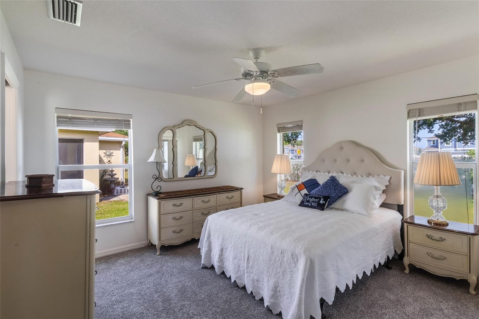Located in the desirable 55+ gated community of Chalet Estates on Lake Suzanne, this well-appointed 2-bedroom, 2-bath home offers comfort, style, and functionality. The open-concept floor plan is perfect for entertaining, featuring a spacious living room with vaulted ceilings, decorative arched entryways, and oversized glass sliding doors that lead to the Florida room. The galley-style kitchen is outfitted with rich cherry wood cabinetry, an upgraded stainless steel appliance package, a closet pantry, recessed lighting, and a charming breakfast nook. The formal dining room is accented by an elegant arched window that fills the space with natural light. The generously sized primary bedroom suite includes wall-to-wall carpeting, a large walk-in closet, and private access to the Florida room through sliding glass doors. The primary bathroom features a comfort-height vanity, built-in makeup desk, linen closet, and a walk-in shower with built-in benches for added convenience. The Florida room offers a serene space to relax and unwind, with views of the manicured backyard. Additional features include: a Laundry room with washer and dryer, Screened-in front porch, Irrigation system, Paved walkway, Gutters, Gas water heater, Decorative stone edging, Hurricane shutters, Exterior carriage lighting, Freshly Painted Exterior, Keyless garage door entry pad and One-car garage with automatic door opener. Enjoy low HOA fees of only $200 per month, covering lawn care, private roads, and access to clubhouse amenities. This picturesque active adult community features a waterfront clubhouse with a heated pool, fitness center, patio area, and direct access to scenic Lake Suzanne. Conveniently located near shopping, restaurants, Legoland, and major roadways, this charming home blends resort-style living with everyday comfort.