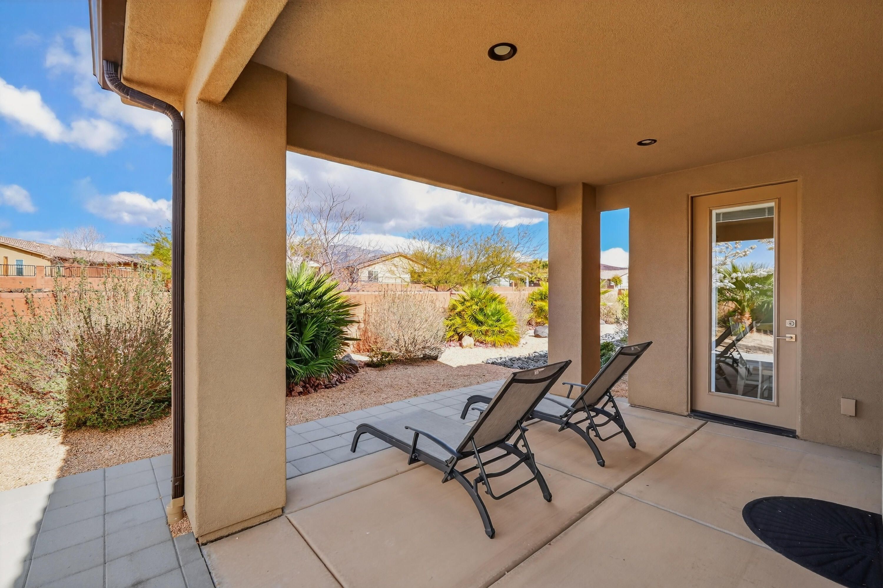 Thoughtfully designed for comfort and accessibility, this home features LVP flooring throughout, tall ceilings, 8' doors, and a tall entry. The living room showcases a tray ceiling and cozy gas fireplace. The kitchen offers thick granite countertops, white cabinetry, tile backsplash, wall oven, gas cooktop with hood, and a spacious dining area with mountain views. The large primary suite also captures mountain views and includes his and her walk-in closets, double vanity, walk-in shower, and private toilet room. Laundry room with shelving and plumbing for a sink. Extended patio for outdoor living. Furniture available.
