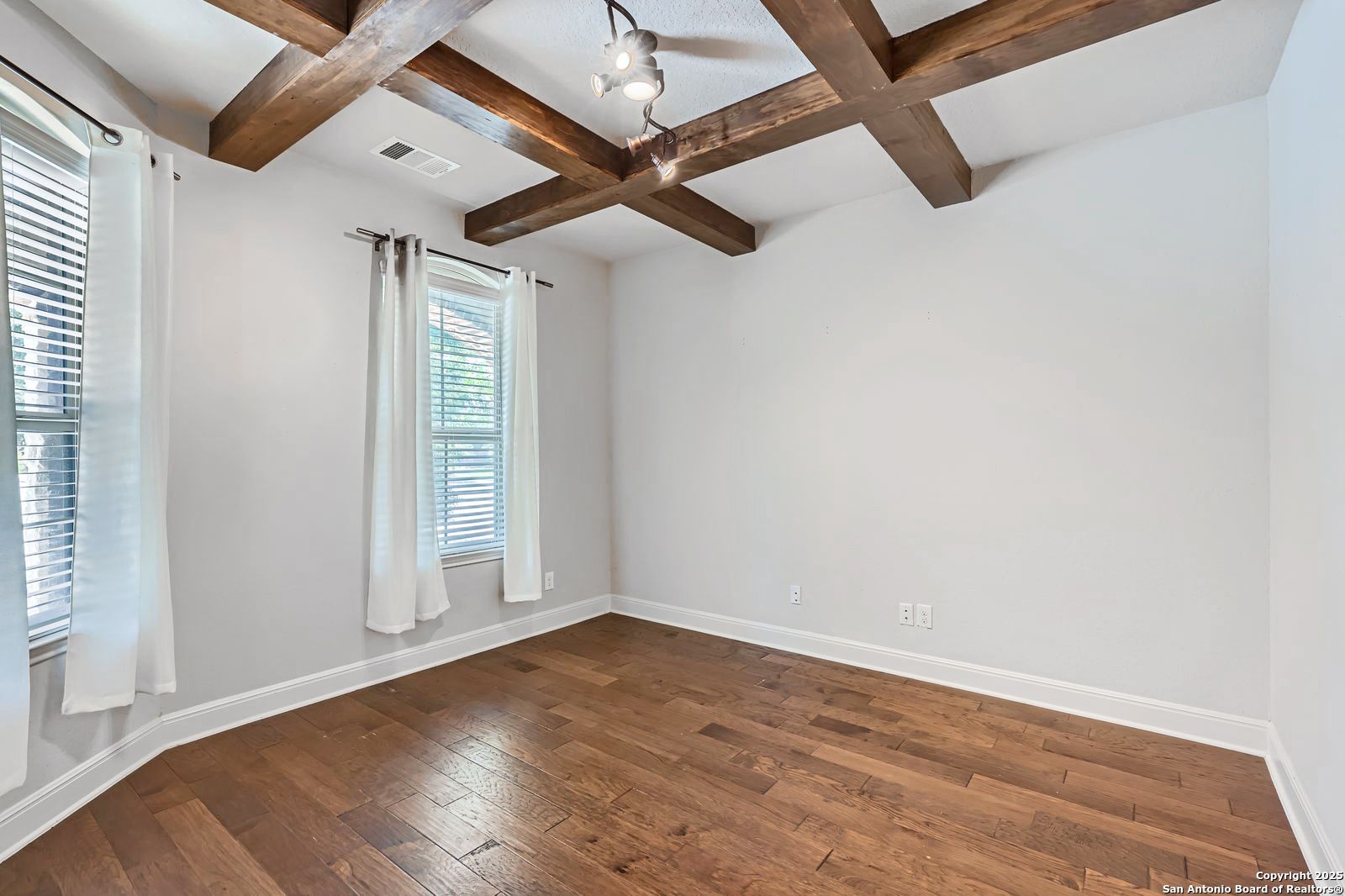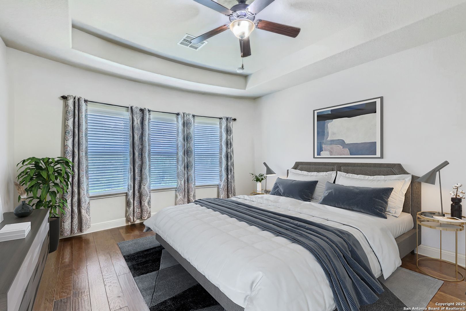 Assumable VA Loan at an incredible 3.25% interest rate! This rare 1.5-story, 4-bedroom, 3-full bath w/ a dedicated study & formal dining area is ideal for multigenerational living. The upstairs features a spacious loft, large bedroom, and full bathroom , creating a private retreat perfect for guests, in-laws, or older children seeking comfort and independence. This thoughtfully crafted home features an open floor plan with tall ceilings throughout, and select rooms enhanced by elegant tray designs and rich beam accents, neutral paint, beautiful wood floors throughout (NO Carpet), and stone accents that add character. The open-concept kitchen boasts granite counters, built-in double ovens, a five-burner stove, stainless steel appliances, ample cabinetry, and a large island with bar seating. The primary suite includes dual vanities, a garden tub, and a spacious wall-to-wall tiled shower. All-brick and stone exterior, outdoor fireplace, water softener, tankless water heater, and eco-friendly, paid-off solar panels keep electricity bills under $150, highlighting the home's exceptional efficiency and quality, all in a highly desirable area zoned for acclaimed schools. Schedule today!