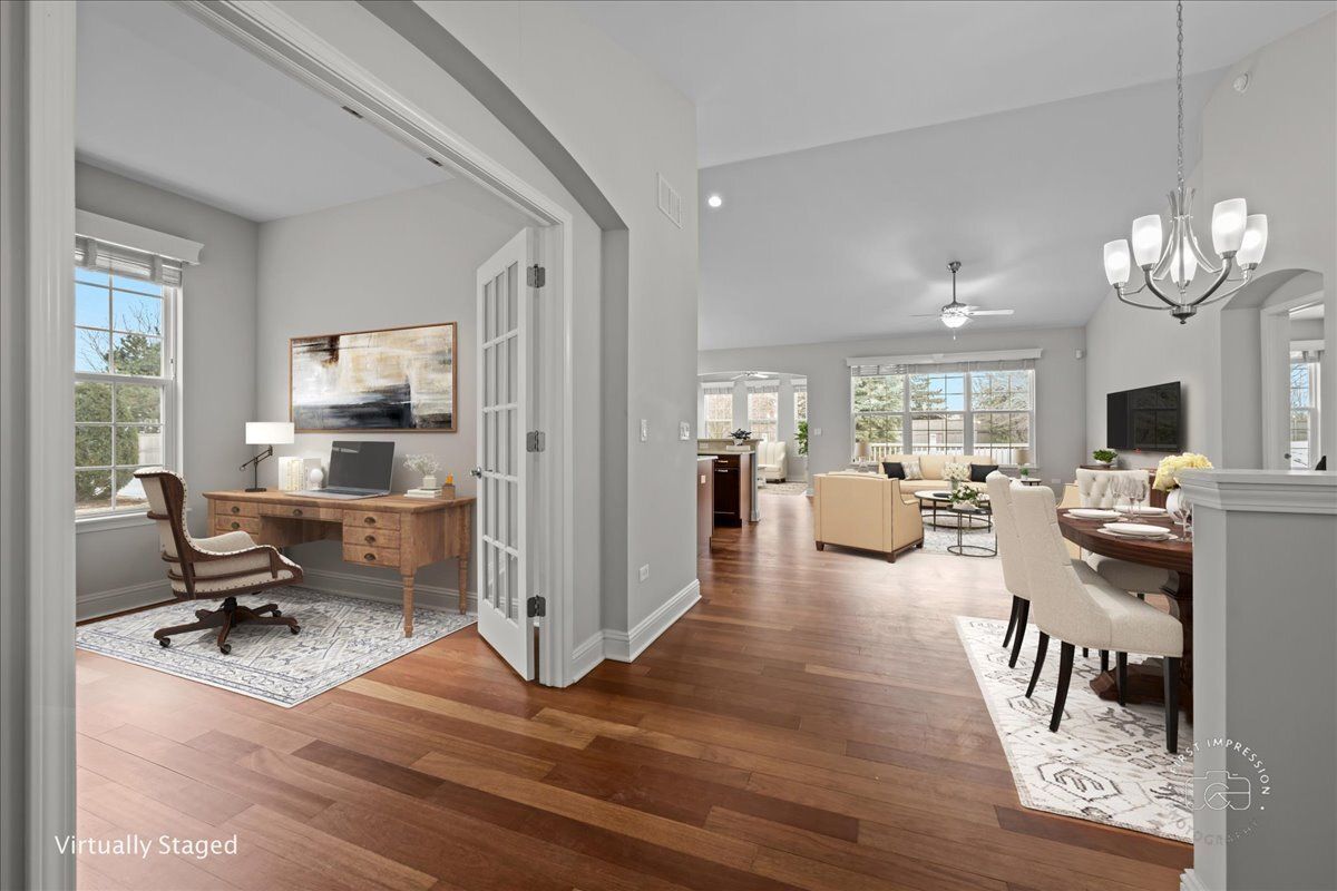 Smart buyers don't just buy the house, they buy the location. This popular Monte Carlo ranch with a full basement is nestled in Naperville's established 55+ community of Carillon Club. An abundance of natural light fills this home featuring Brazilian cherry hardwood floors, soaring ceilings, and an open-concept layout connecting the living room, dining room, breakfast area, and sunroom. The kitchen offers 42" cabinets, quartz countertops, stainless steel appliances, and a center island. Both the primary and second bedrooms include ensuite baths and walk-in closets, giving everyone privacy and comfort. The full, plumbed-in basement provides endless future possibilities. Set on a premium lot with abundant green space, enjoy beautifully landscaped grounds on all sides, flowering trees, perennials, a Trex deck, sprinkler system, and invisible fence, perfect for low-maintenance living. Residents of Carillon Club enjoy a gated entrance, an impressive 18,000 sq. ft. clubhouse, indoor and outdoor pools, fitness center, ballroom, hobby studios, tennis, bocce, walking and biking trails, scenic lakes, and a 3-hole par-3 golf course. Another convenient amenity, just one block away, you'll find a second outdoor pool, designated for homeowners and their guests' faimilies. Minutes from expressways, shopping, and dining. When you find the home that offers the perfect blend of comfort, community, and convenience, that's a smart buy. Homes in Carillon of Naperville sell fast, schedule your showing today.