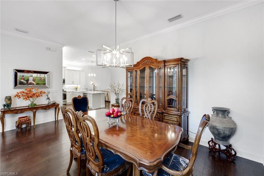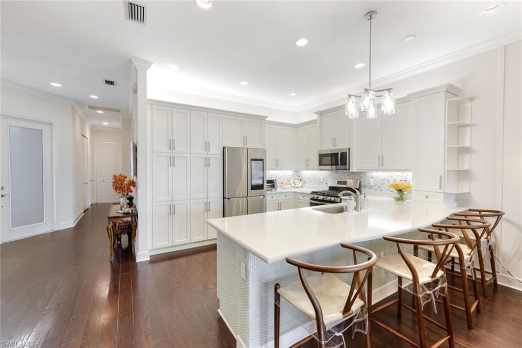 Immaculate “Nantucket" Villa in Valencia Bonita, Southwest Florida’s premier 55+ resort-style community. Offering 1,734 sq ft under air, this thoughtfully designed residence features 2 bedrooms, 2 baths, a den/office, 2-car garage, and a private screened lanai with a water view.The gourmet kitchen is appointed with quartz countertops, white cabinetry, natural gas cooktop, mosaic tile on peninsula, glass tile backsplash, a breakfast bar, and seating for four—seamlessly flowing into the open-concept dining and great room with sliding doors to the lanai. The primary suite showcases a coffered ceiling, two walk-in closets, and the bath features dual vanities, quartz counters, shower, and oversized mirrors. The guest bedroom has a walk-in closet with custom shelving, while the den/office offers flexibility. Additional upgrades include an etched glass front door, crown molding, plantation shutters, 8 foot doors, hardwood flooring throughout main living areas and bedrooms. The garage has an insulated garage door, ceiling shelving, and epoxy flooring. The lanai offers a peaceful retreat with roll down storm screens and view of the lake.Valencia Bonita’s 45,000 sq ft clubhouse delivers an unmatched lifestyle with a grand social hall, indoor/outdoor restaurant and bar, spa and nail salon, resort-style pool, lap and resistance pools, cabanas, fitness center, and a full array of racquet sports including tennis, pickleball, and bocce. Residents also enjoy a pro shop, dog parks, billiards, card rooms, pottery studio, cooking studio, and approximately 50 clubs and activities curated by a dedicated lifestyle director.Quarterly HOA fees cover cable, high-speed internet, landscaping, irrigation, pest control, exterior maintenance including roof cleaning and painting, plus full access to amenities and reserves.Ideally located just a short stroll to the clubhouse and minutes from beaches, RSW airport, downtown Bonita Springs, Naples, Estero, Fort Myers, and premier shopping and dining—this home offers the best of Southwest Florida living.