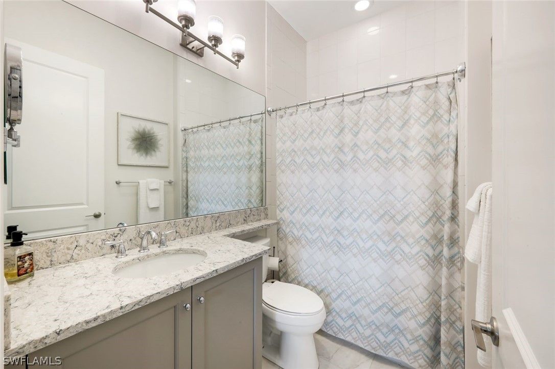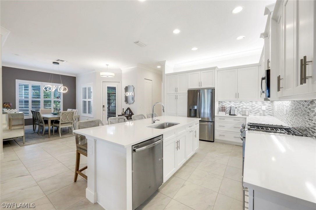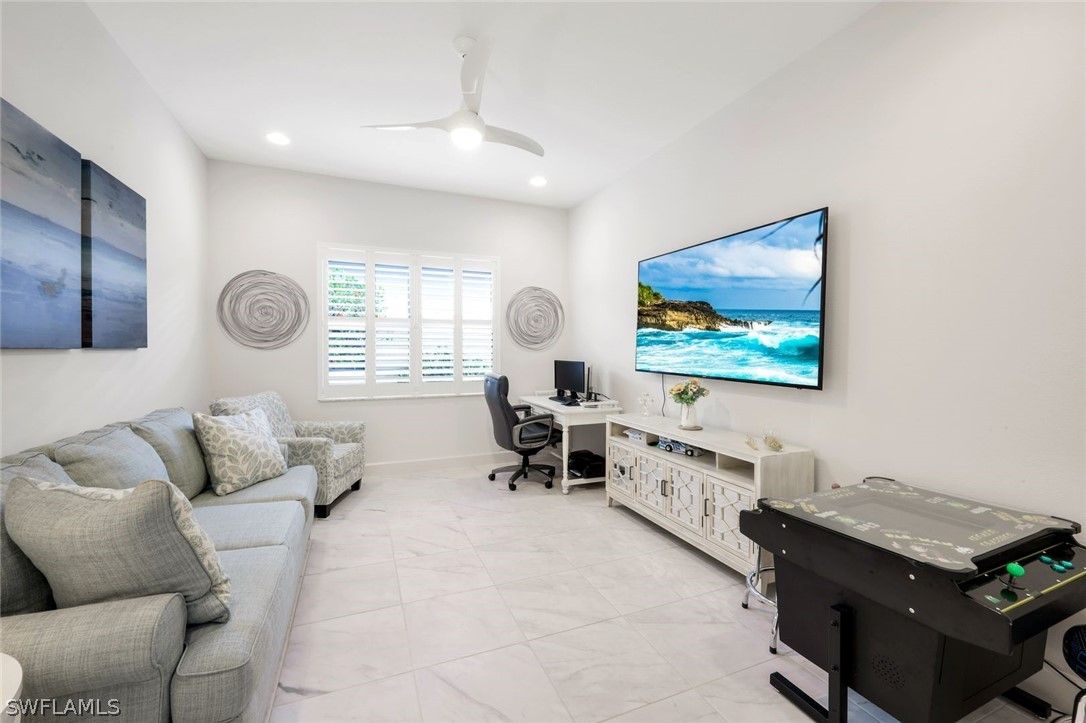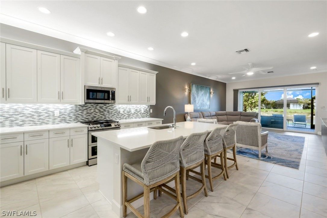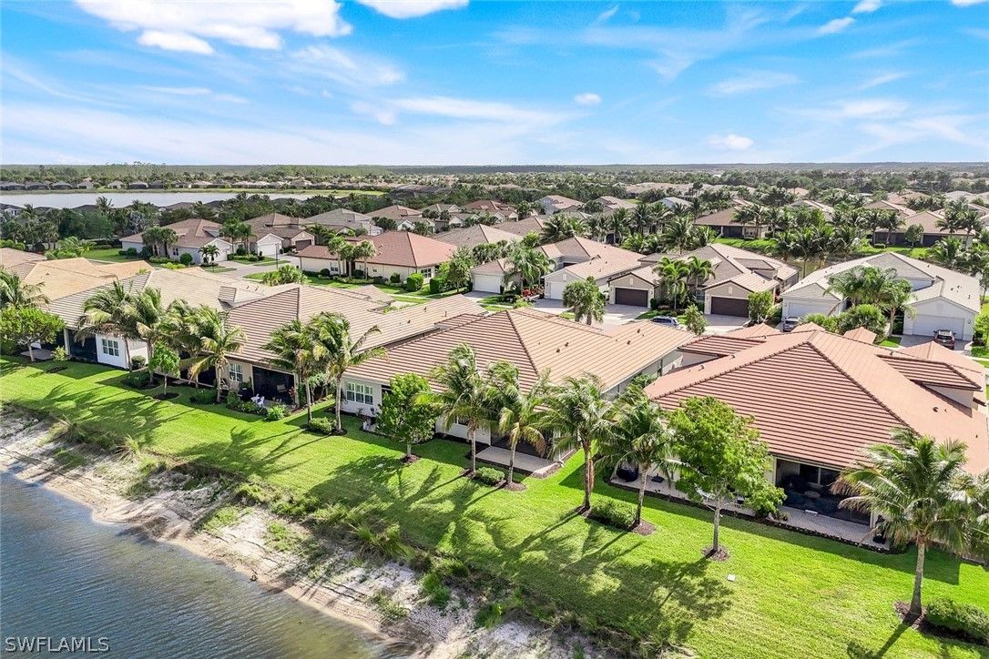 Welcome to this exquisite, highly sought-after York floor plan villa home, offering 2 spacious bedrooms, a large den, and 2.5 bathrooms, spanning over 2,000 square feet of open living space. Porcelain tile flows throughout, giving the home a polished, clean aesthetic that is easy to maintain. Thoughtful details such as fresh interior paint, crown molding, and custom decorator touches, including a built-in floating entertainment center in the great room, elevate the space. The chef's kitchen is a true standout, featuring white shaker cabinets, natural gas cooking, quartz countertops, ambient lighting, and stainless-steel appliances. You will appreciate the ample storage, including a pantry, multiple drawers, pull-outs in cabinets, and a deep single sink with an upgraded faucet. The large kitchen island is perfect for gathering with friends and family. The primary suite, with a serene lake view, is a true retreat, offering two walk-in closets with custom built-ins and a private en suite bath. The spacious guest room, complete with its own en suite bathroom, provides ultimate comfort for visitors. The oversized den offers endless possibilities, from a home office to a cozy entertainment room. Step outside to your screened lanai, where you can watch the sunset over the sparkling lake, a truly breathtaking view that changes with every season. The tranquil waters provide the perfect backdrop for relaxation and the "no-see-em" picture screen ensures you can enjoy the outdoors in comfort. Additional features include a finished laundry room with sink and cabinets, a screened front porch, plantation shutters, decorator lighting, ceiling fans, EV charger & extra high-hat lighting throughout. This home offers enhanced protection with hurricane impact windows and doors. Additionally, the lanai is equipped with an electric hurricane screen, offering an added layer of security & peace of mind. This home offers the perfect blend of space, function, and the coastal lifestyle you’ve been dreaming of. Located in Valencia Bonita which is more than just a community; it's a vibrant 55+ resort lifestyle where every day feels like a vacation. Nestled in Bonita Springs, this exclusive GL Homes community offers exceptional amenities, including a 45,000-square-foot clubhouse with a gourmet restaurant, poolside bar, and resort-style pool, as well as a lap pool and resistance pool. Enjoy a wide variety of activities, from tennis, pickleball, and bocce to more tranquil pursuits like yoga, art classes, and cooking studio sessions. Stay active in the state-of-the-art fitness center, unwind in the salon or socialize in the sports lounge and card rooms. For entertainment, the community features a theater with live performances, ensuring there's always something exciting to enjoy. With a dynamic calendar of events, a dog park, and a social hall, there's always something happening at Valencia Bonita. Visit today and see for yourself why this house is the perfect place to call home.
