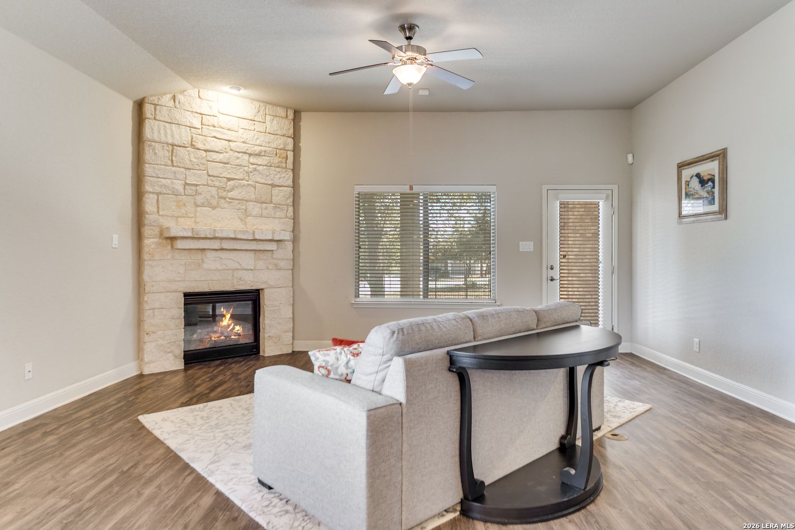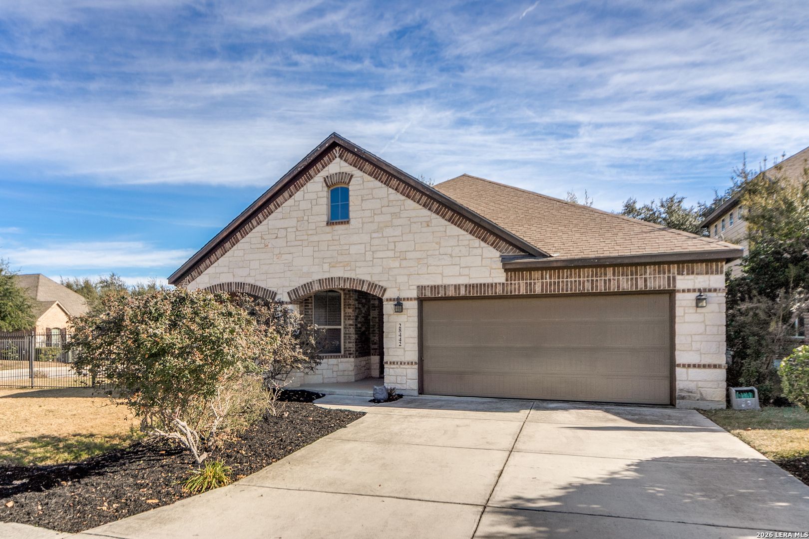 Welcome home to this beautifully maintained 3-bedroom, 2-bath residence located on an oversized corner lot within the sought-after gated community of Willis Ranch. Mature landscaping and charming curb appeal set the tone from the moment you arrive. Inside, you're greeted by a formal dining room that seamlessly flows into the kitchen and main living area, creating an inviting open-concept floor plan ideal for both everyday living and entertaining. The kitchen features granite countertops, abundant cabinet space, and a walk-in pantry, all overlooking the spacious living room highlighted by a stunning floor-to-ceiling stone gas fireplace. The private primary suite offers a relaxing retreat with a generous layout and a full en-suite bath complete with separate vanities, a soaking tub, and a glass-enclosed walk-in shower. Two additional bedrooms share a well-appointed secondary bathroom. Additional highlights include a separate office, dedicated laundry room, and a 2-car garage. Step outside to enjoy the covered patio, surrounded by mature trees-perfect for outdoor relaxation. This home combines comfort, functionality, and style in one of the area's most desirable communities.