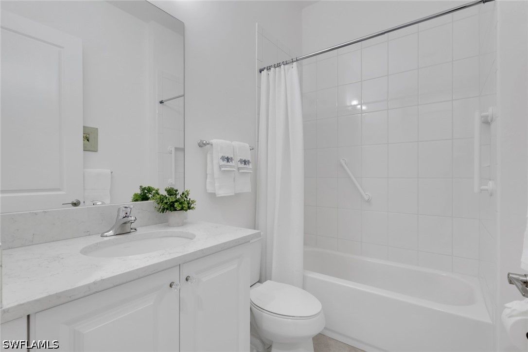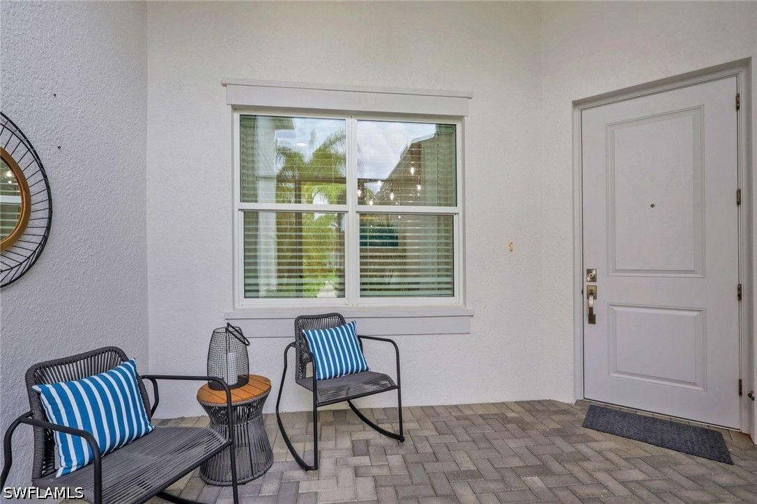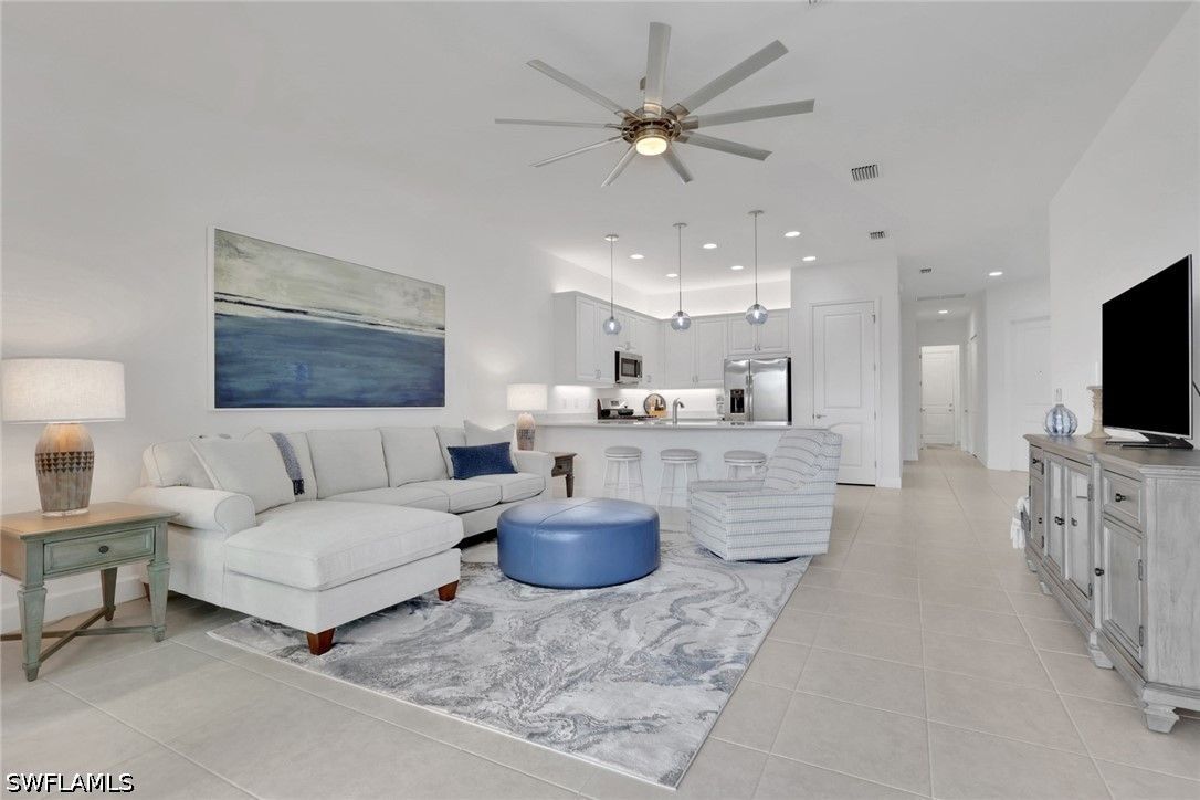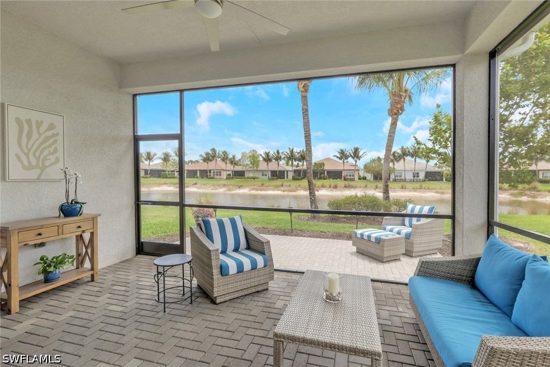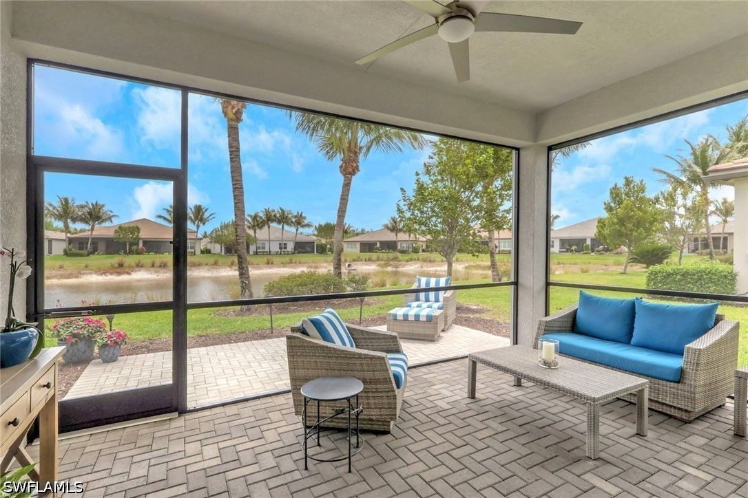 Immaculate “Nantucket” villa in Valencia Bonita, Southwest Florida’s premier 55+ resort-style community. Perfectly positioned on a premium, oversized lakefront lot with an expanded driveway, this residence offers exceptional curb appeal with lush, low-voltage landscape lighting and a welcoming screened entry. Built with IMPACT GLASS throughout, this thoughtfully designed home offers 1,734 square feet under air, featuring 2 bedrooms, 2 baths, a den/office, and a 2-car garage. The private rear screened lanai showcases serene water views—ideal for relaxing or entertaining. The gourmet kitchen is beautifully appointed with quartz countertops, white cabinetry, natural gas cooktop, mosaic tile accents on the peninsula and a breakfast bar with seating for four. The open-concept design flows seamlessly into the dining area and great room, highlighted by sliding glass doors leading to the lanai. The primary suite is a true retreat, featuring a coffered ceiling, tranquil lake views, and two spacious walk-in closets with pocket doors. The en-suite bath offers dual vanities with quartz countertops and a walk-in shower with grab bars. Additional highlights include a guest bedroom with walk-in closet, a den/office with French doors, high-hat lighting, and ceiling fans throughout. Valencia Bonita’s 45,000-square-foot clubhouse delivers an unmatched lifestyle with a grand social hall, indoor/outdoor restaurant and bar, spa and nail salon, resort-style pool, lap and resistance pools, cabanas, and a state-of-the-art fitness center. Residents enjoy tennis, pickleball, bocce, a pro shop, dog parks, billiards, card rooms, a pottery studio, cooking studio, and approximately 50 clubs and activities curated by a full-time lifestyle director.