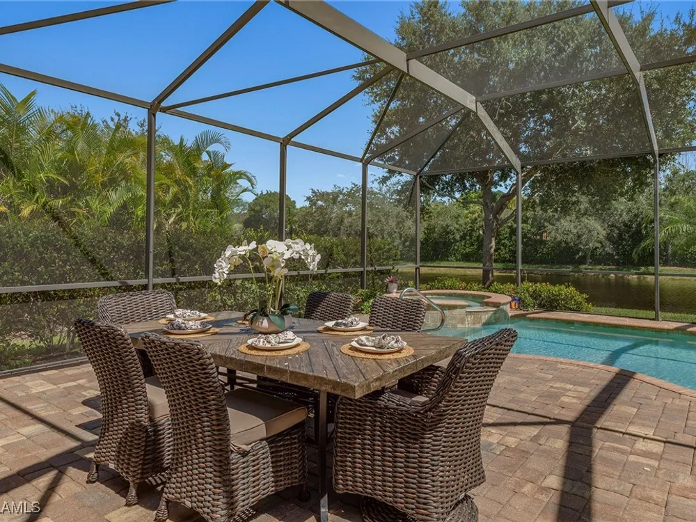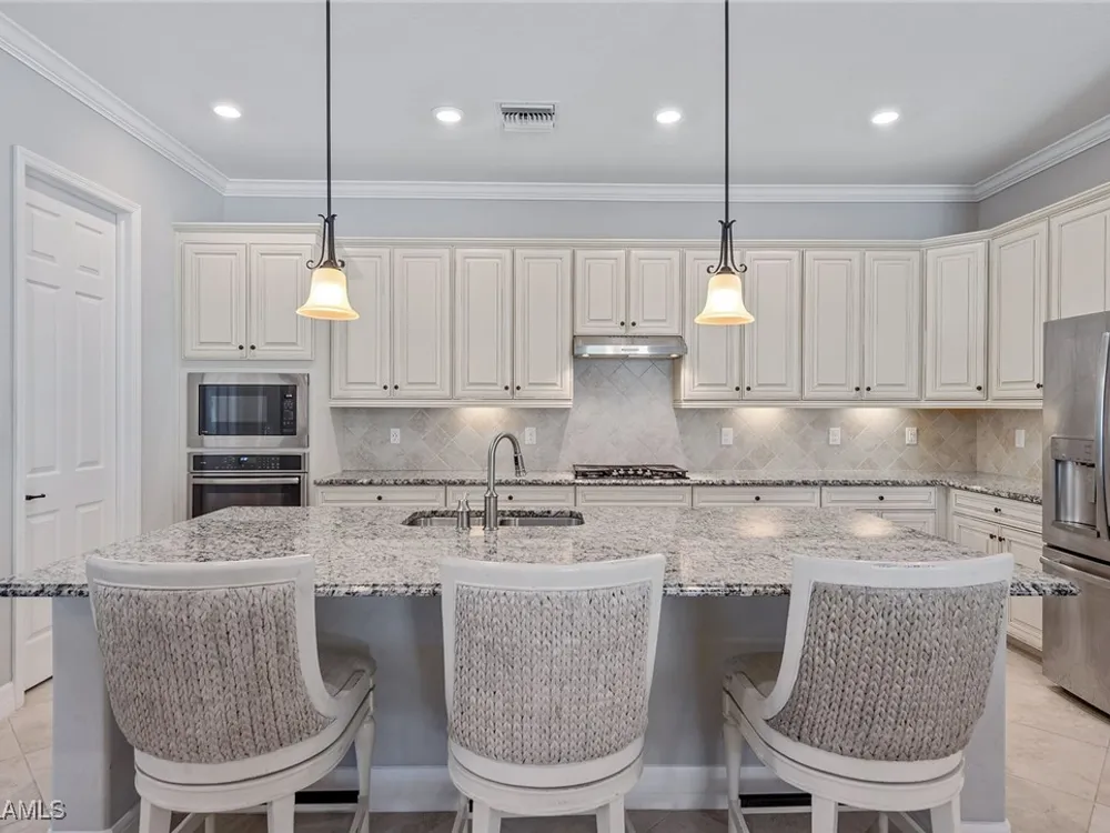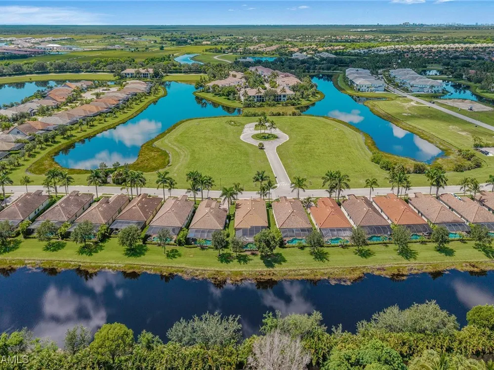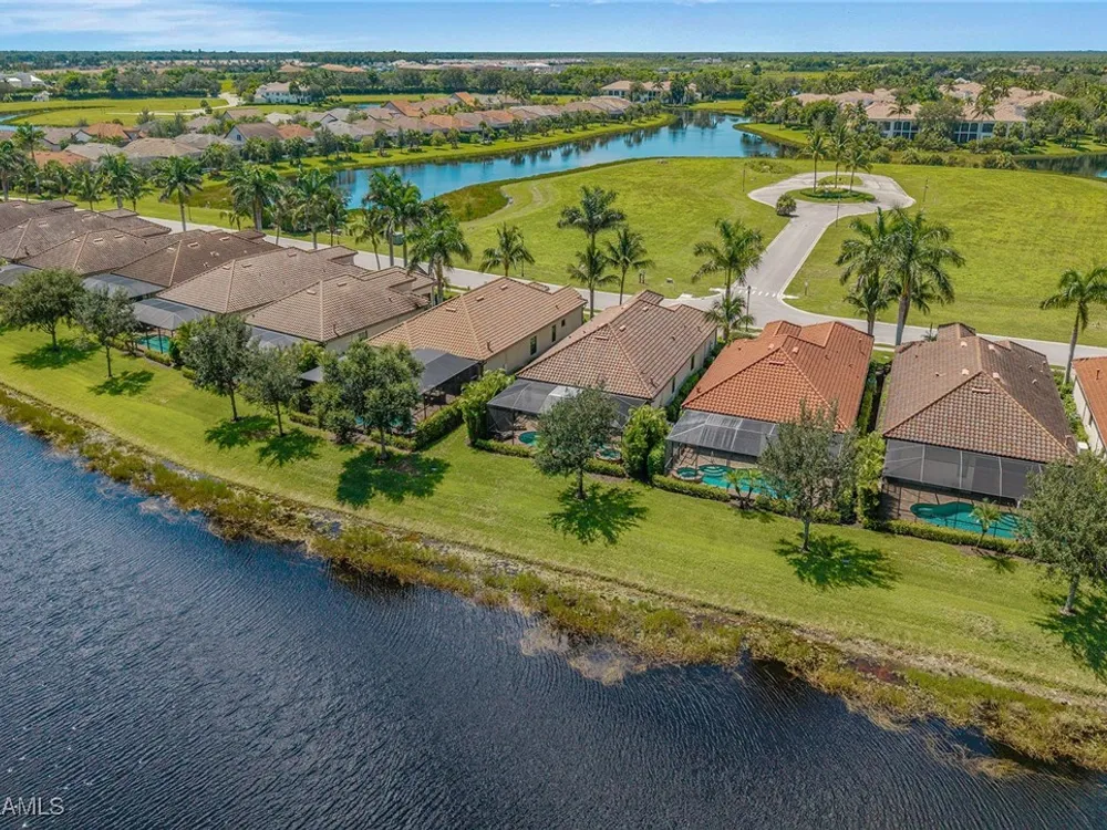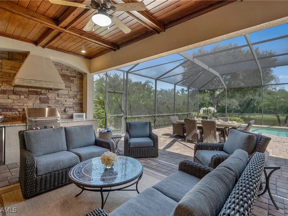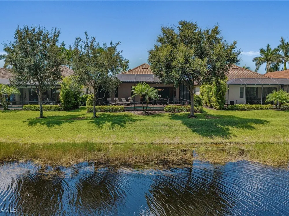 Private lake views framed by lush tropical landscaping create a serene backdrop for this beautifully designed Maria floor plan home in the award-winning community of Fiddler’s Creek. Offered furnished and with the CDD bond paid in full, this four-bedroom, three-full bath, two-car garage residence blends elegance with comfort, highlighted by impact-rated doors and windows, crown molding, diagonal tile flooring, LED recessed lighting and soaring nearly 11-foot ceilings throughout. The open-concept layout flows seamlessly, anchored by a gourmet kitchen with light cabinetry with under-cabinet lighting, granite countertops, an island with pendant lighting and bar seating, tile backsplash, and a walk-in pantry with wood shelving. Stainless steel GE Profile appliances include a built-in convection wall oven, microwave, natural gas cooktop with five burners, French door refrigerator with Keurig® K-Cup® brewing system and a top-control dishwasher. A spacious dining area is enhanced by a striking chandelier and mirrored wall accent, while the living room features a custom built-in entertainment center with quartz countertop, cabinets and glass shelving. The owner’s suite is a private retreat with a tray ceiling, lanai access, dual closets, an electric shade for slider doors and an en-suite bath with granite dual vanities, a makeup counter, soaking tub and a frameless glass walk-in shower. One guest bedroom offers an en-suite bath with a walk-in shower, while two additional guest bedrooms, one with pocket doors ideal as an office or den, share a full bath with tub/shower combo and sliding glass doors. Designed for year-round enjoyment, the expansive no-see-um screened lanai boasts a gas-heated pool and spa, paver pool deck, wood-accent ceiling with fan and a fully equipped outdoor kitchen featuring a GE Monogram grill with rotisserie and side burners, granite countertops, stone backsplash, Zephyr exhaust hood and a GE Monogram indoor/outdoor refrigerator. Additional highlights include a 2024 Lennox HVAC system, security system, epoxy garage floor, and a well-appointed laundry room with cabinets, sink, and GE washer and dryer. Residents enjoy access to the spectacular 54,000-square-foot club and spa offering casual and fine dining, resort-style pools with waterfalls and slides, a fitness center with classes and personal training, active tennis and pickleball programs, bocce, spa services, sauna, steam room and an extremely active social calendar, with exciting renovations underway. Optional memberships are available for The Tarpon Club with beach and marina privileges and The Golf Club with its recently renovated course and new clubhouse. Just minutes from Marco Island, downtown Naples, world-class dining, shopping, executive airport and beaches, this home captures the essence of the desired Florida resort lifestyle.