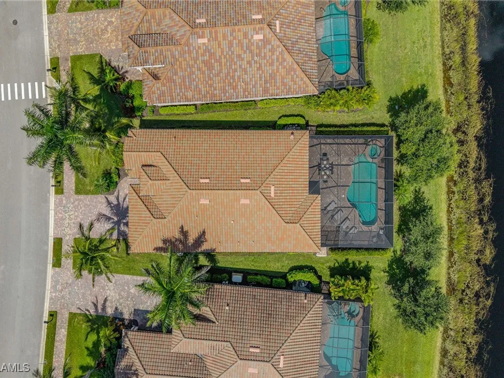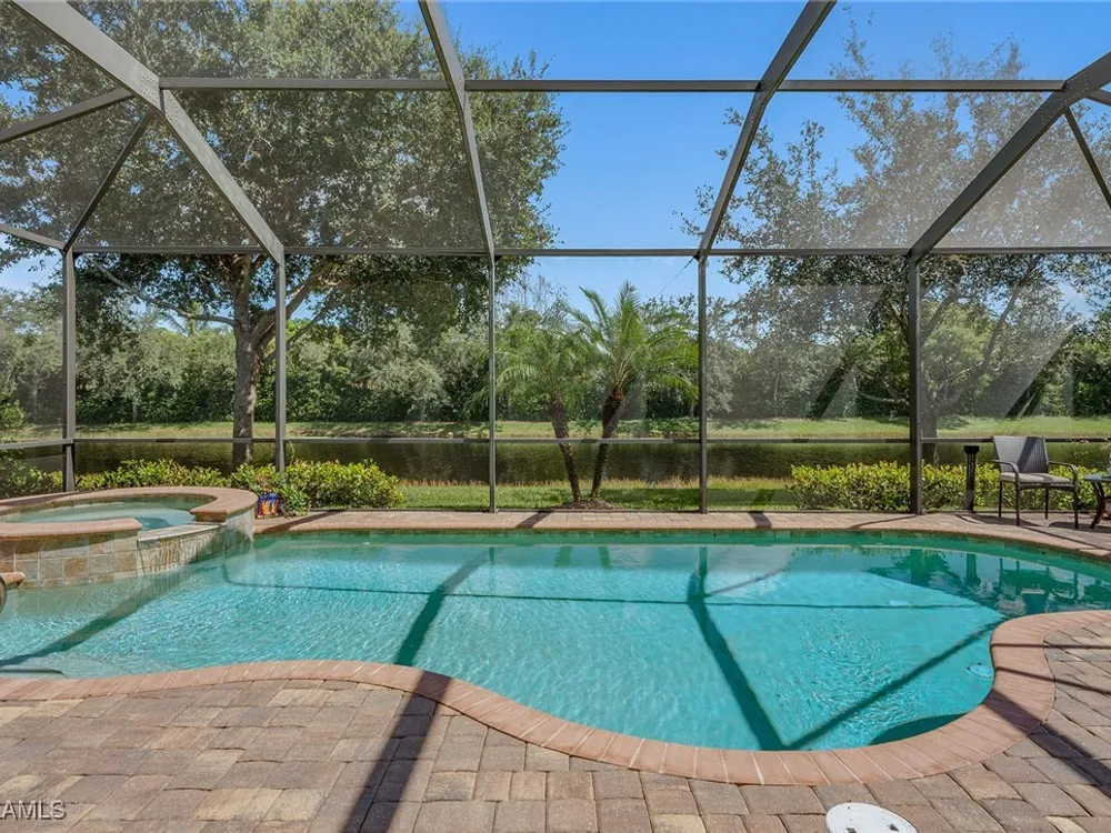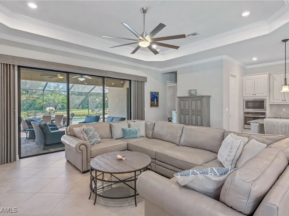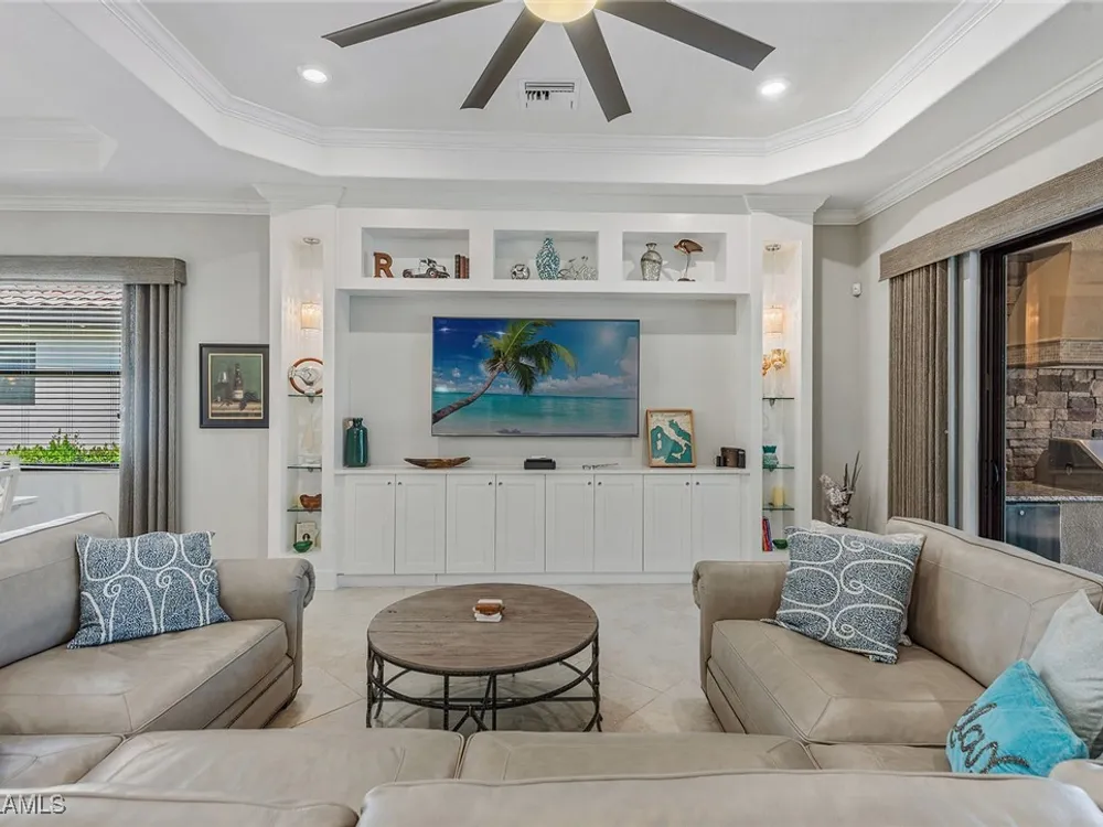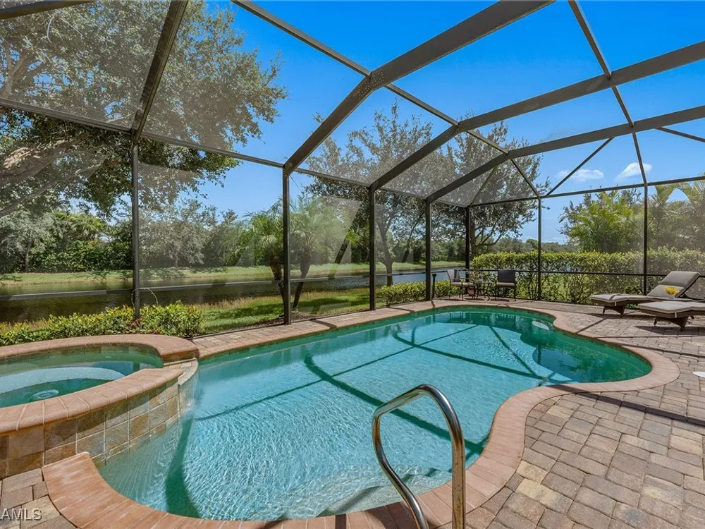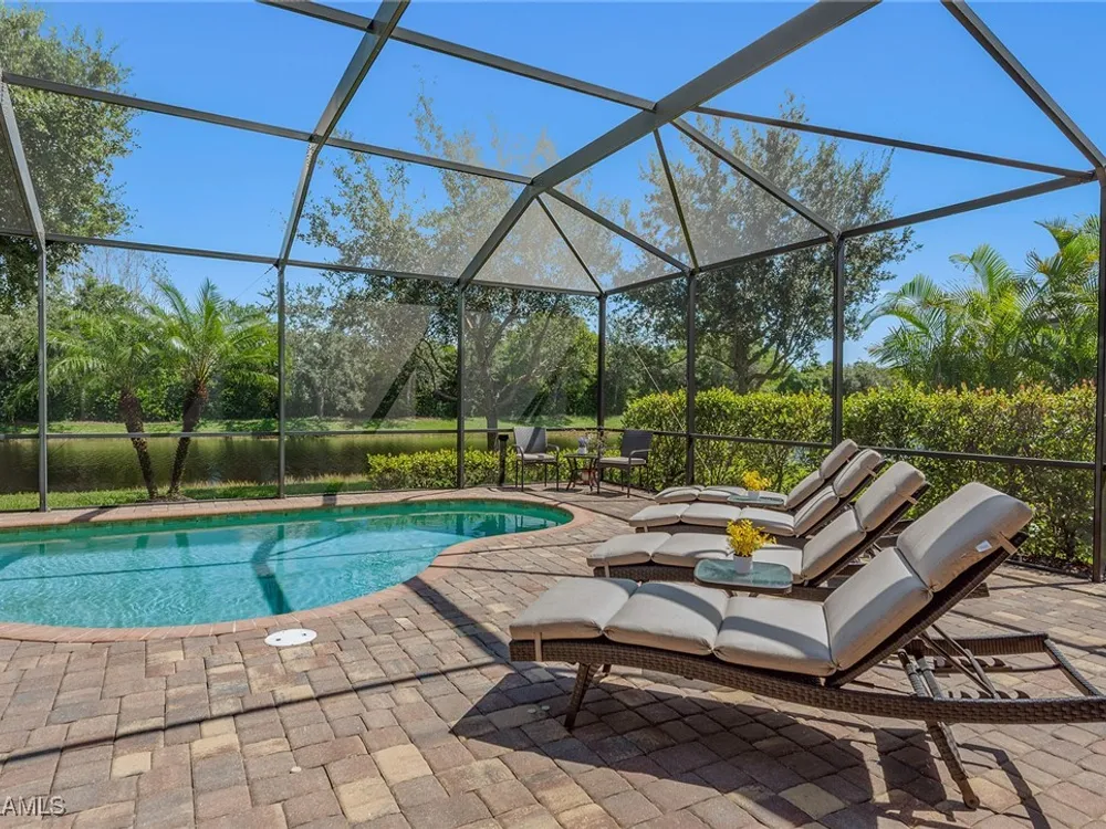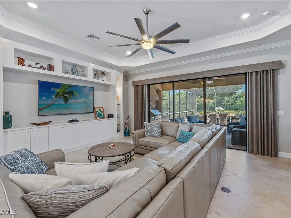 Private lake views framed by lush tropical landscaping create a serene backdrop for this beautifully designed Maria floor plan home in the award-winning community of Fiddler’s Creek. Offered furnished and with the CDD bond paid in full, this four-bedroom, three-full bath, two-car garage residence blends elegance with comfort, highlighted by impact-rated doors and windows, crown molding, diagonal tile flooring, LED recessed lighting and soaring nearly 11-foot ceilings throughout. The open-concept layout flows seamlessly, anchored by a gourmet kitchen with light cabinetry with under-cabinet lighting, granite countertops, an island with pendant lighting and bar seating, tile backsplash, and a walk-in pantry with wood shelving. Stainless steel GE Profile appliances include a built-in convection wall oven, microwave, natural gas cooktop with five burners, French door refrigerator with Keurig® K-Cup® brewing system and a top-control dishwasher. A spacious dining area is enhanced by a striking chandelier and mirrored wall accent, while the living room features a custom built-in entertainment center with quartz countertop, cabinets and glass shelving. The owner’s suite is a private retreat with a tray ceiling, lanai access, dual closets, an electric shade for slider doors and an en-suite bath with granite dual vanities, a makeup counter, soaking tub and a frameless glass walk-in shower. One guest bedroom offers an en-suite bath with a walk-in shower, while two additional guest bedrooms, one with pocket doors ideal as an office or den, share a full bath with tub/shower combo and sliding glass doors. Designed for year-round enjoyment, the expansive no-see-um screened lanai boasts a gas-heated pool and spa, paver pool deck, wood-accent ceiling with fan and a fully equipped outdoor kitchen featuring a GE Monogram grill with rotisserie and side burners, granite countertops, stone backsplash, Zephyr exhaust hood and a GE Monogram indoor/outdoor refrigerator. Additional highlights include a 2024 Lennox HVAC system, security system, epoxy garage floor, and a well-appointed laundry room with cabinets, sink, and GE washer and dryer. Residents enjoy access to the spectacular 54,000-square-foot club and spa offering casual and fine dining, resort-style pools with waterfalls and slides, a fitness center with classes and personal training, active tennis and pickleball programs, bocce, spa services, sauna, steam room and an extremely active social calendar, with exciting renovations underway. Optional memberships are available for The Tarpon Club with beach and marina privileges and The Golf Club with its recently renovated course and new clubhouse. Just minutes from Marco Island, downtown Naples, world-class dining, shopping, executive airport and beaches, this home captures the essence of the desired Florida resort lifestyle.