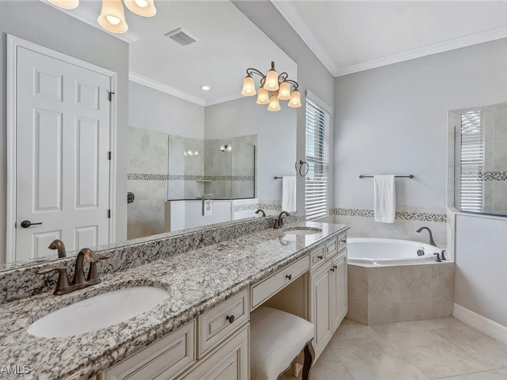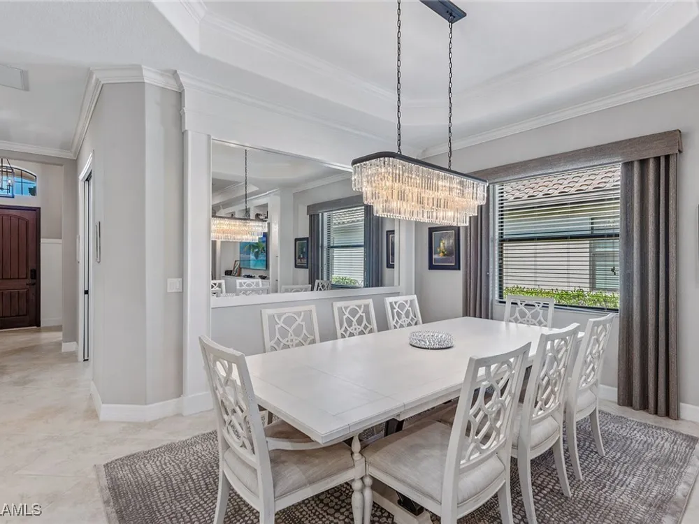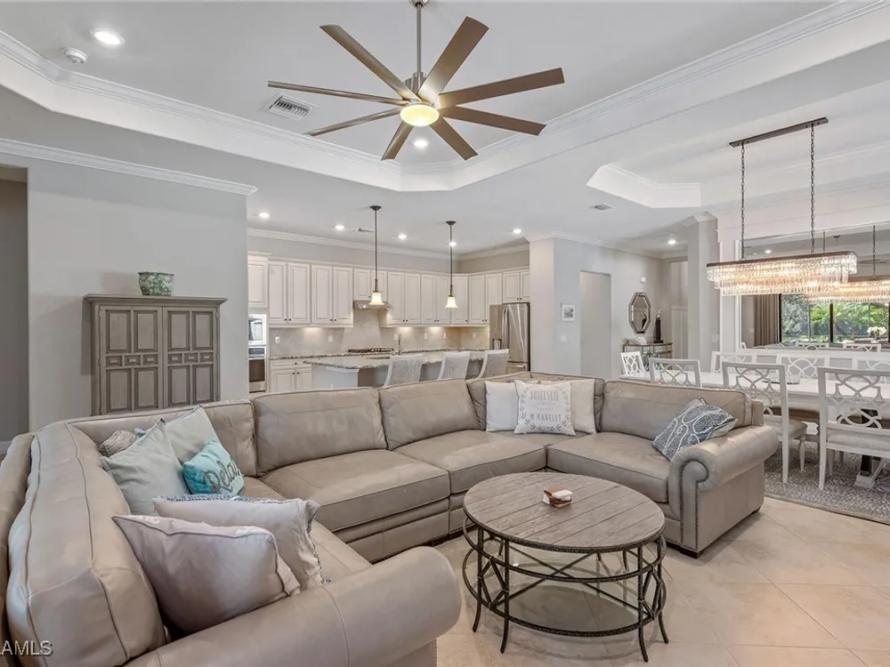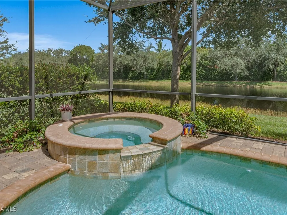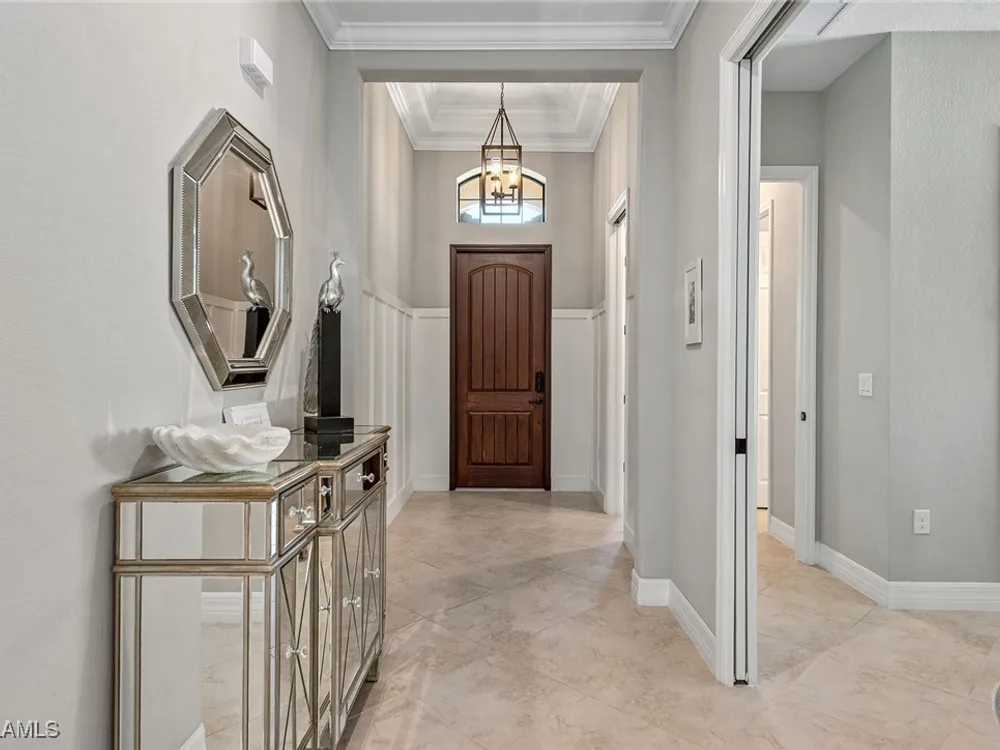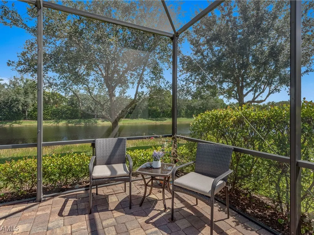 Private lake views framed by lush tropical landscaping create a serene backdrop for this beautifully designed Maria floor plan home in the award-winning community of Fiddler’s Creek. Offered furnished and with the CDD bond paid in full, this four-bedroom, three-full bath, two-car garage residence blends elegance with comfort, highlighted by impact-rated doors and windows, crown molding, diagonal tile flooring, LED recessed lighting and soaring nearly 11-foot ceilings throughout. The open-concept layout flows seamlessly, anchored by a gourmet kitchen with light cabinetry with under-cabinet lighting, granite countertops, an island with pendant lighting and bar seating, tile backsplash, and a walk-in pantry with wood shelving. Stainless steel GE Profile appliances include a built-in convection wall oven, microwave, natural gas cooktop with five burners, French door refrigerator with Keurig® K-Cup® brewing system and a top-control dishwasher. A spacious dining area is enhanced by a striking chandelier and mirrored wall accent, while the living room features a custom built-in entertainment center with quartz countertop, cabinets and glass shelving. The owner’s suite is a private retreat with a tray ceiling, lanai access, dual closets, an electric shade for slider doors and an en-suite bath with granite dual vanities, a makeup counter, soaking tub and a frameless glass walk-in shower. One guest bedroom offers an en-suite bath with a walk-in shower, while two additional guest bedrooms, one with pocket doors ideal as an office or den, share a full bath with tub/shower combo and sliding glass doors. Designed for year-round enjoyment, the expansive no-see-um screened lanai boasts a gas-heated pool and spa, paver pool deck, wood-accent ceiling with fan and a fully equipped outdoor kitchen featuring a GE Monogram grill with rotisserie and side burners, granite countertops, stone backsplash, Zephyr exhaust hood and a GE Monogram indoor/outdoor refrigerator. Additional highlights include a 2024 Lennox HVAC system, security system, epoxy garage floor, and a well-appointed laundry room with cabinets, sink, and GE washer and dryer. Residents enjoy access to the spectacular 54,000-square-foot club and spa offering casual and fine dining, resort-style pools with waterfalls and slides, a fitness center with classes and personal training, active tennis and pickleball programs, bocce, spa services, sauna, steam room and an extremely active social calendar, with exciting renovations underway. Optional memberships are available for The Tarpon Club with beach and marina privileges and The Golf Club with its recently renovated course and new clubhouse. Just minutes from Marco Island, downtown Naples, world-class dining, shopping, executive airport and beaches, this home captures the essence of the desired Florida resort lifestyle.