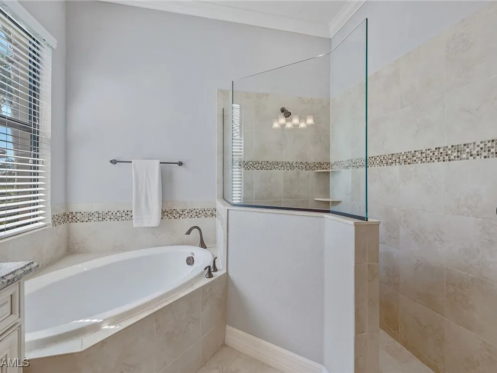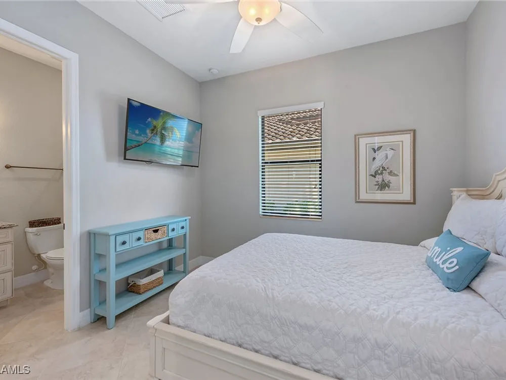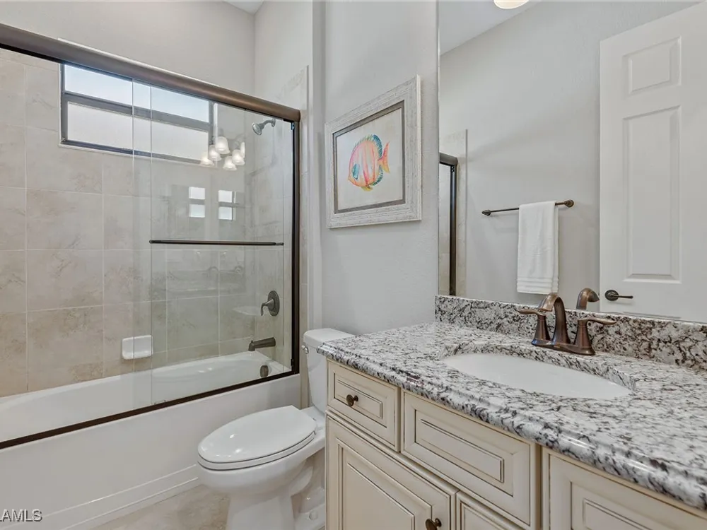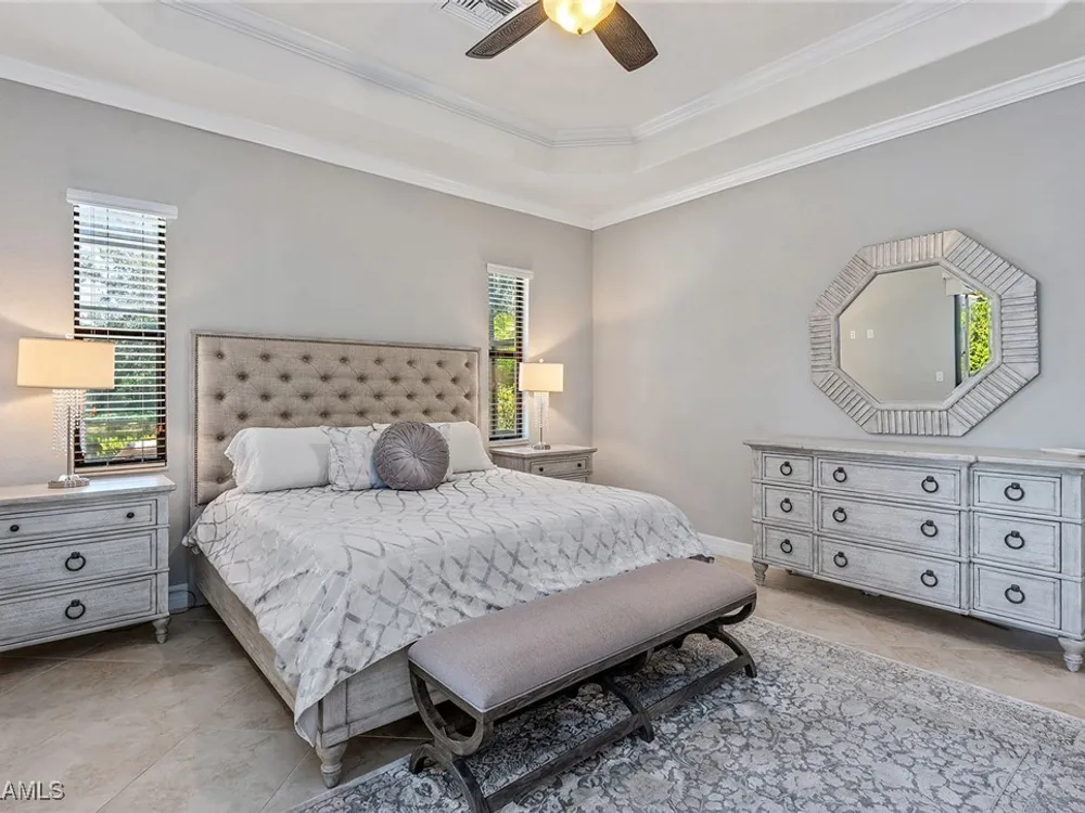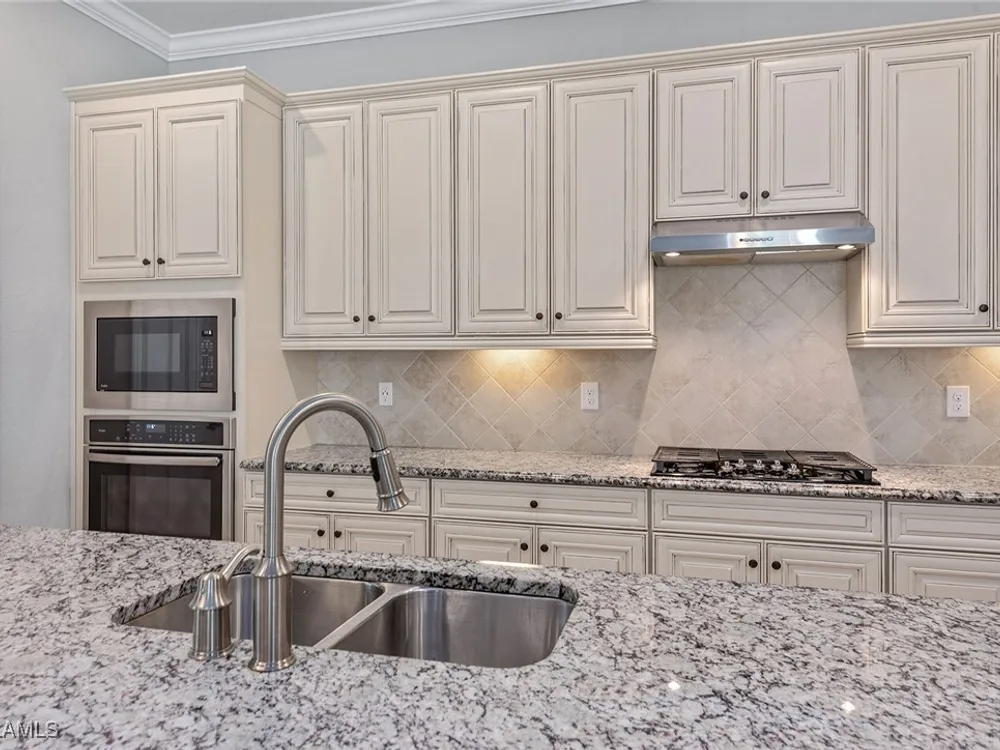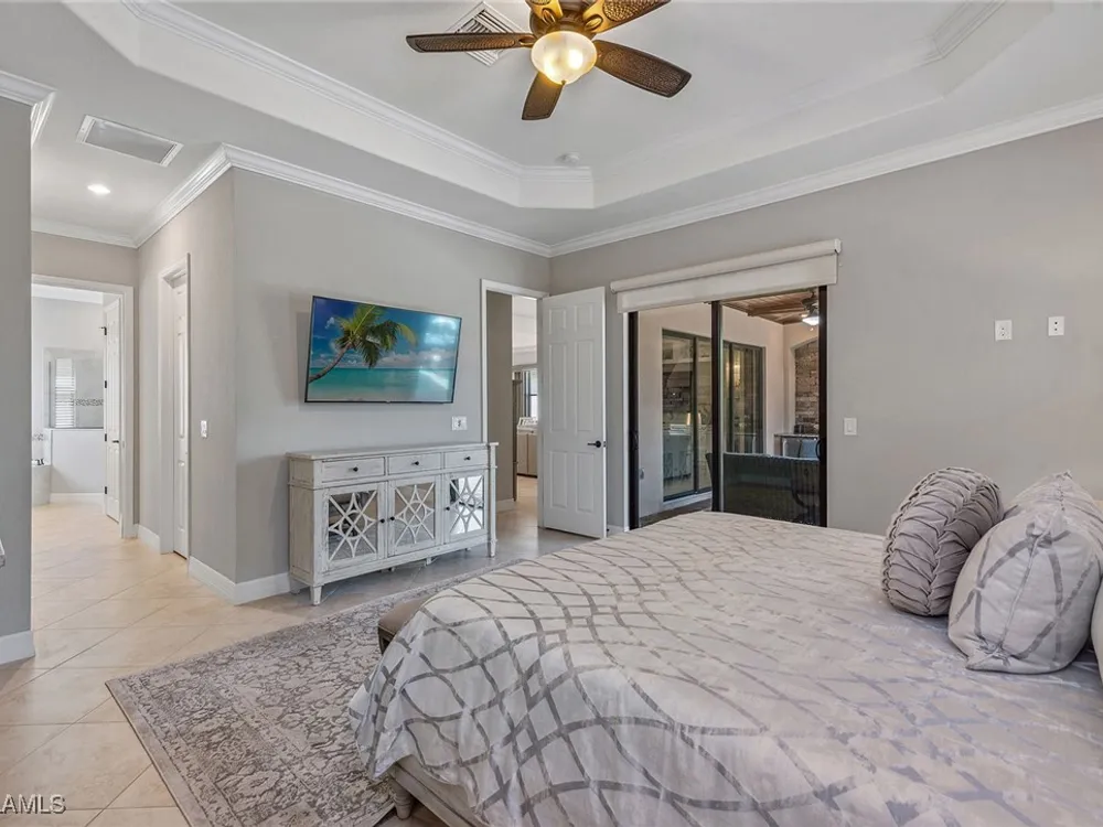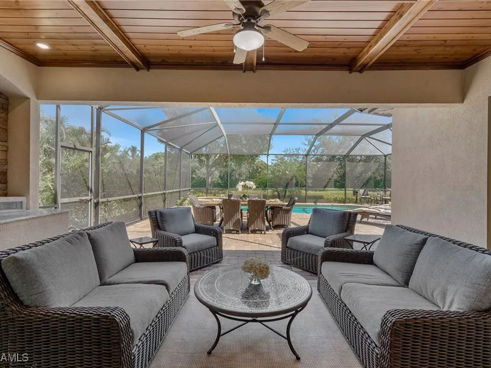Private lake views framed by lush tropical landscaping create a serene backdrop for this beautifully designed Maria floor plan home in the award-winning community of Fiddler’s Creek. Offered furnished and with the CDD bond paid in full, this four-bedroom, three-full bath, two-car garage residence blends elegance with comfort, highlighted by impact-rated doors and windows, crown molding, diagonal tile flooring, LED recessed lighting and soaring nearly 11-foot ceilings throughout. The open-concept layout flows seamlessly, anchored by a gourmet kitchen with light cabinetry with under-cabinet lighting, granite countertops, an island with pendant lighting and bar seating, tile backsplash, and a walk-in pantry with wood shelving. Stainless steel GE Profile appliances include a built-in convection wall oven, microwave, natural gas cooktop with five burners, French door refrigerator with Keurig® K-Cup® brewing system and a top-control dishwasher. A spacious dining area is enhanced by a striking chandelier and mirrored wall accent, while the living room features a custom built-in entertainment center with quartz countertop, cabinets and glass shelving. The owner’s suite is a private retreat with a tray ceiling, lanai access, dual closets, an electric shade for slider doors and an en-suite bath with granite dual vanities, a makeup counter, soaking tub and a frameless glass walk-in shower. One guest bedroom offers an en-suite bath with a walk-in shower, while two additional guest bedrooms, one with pocket doors ideal as an office or den, share a full bath with tub/shower combo and sliding glass doors. Designed for year-round enjoyment, the expansive no-see-um screened lanai boasts a gas-heated pool and spa, paver pool deck, wood-accent ceiling with fan and a fully equipped outdoor kitchen featuring a GE Monogram grill with rotisserie and side burners, granite countertops, stone backsplash, Zephyr exhaust hood and a GE Monogram indoor/outdoor refrigerator. Additional highlights include a 2024 Lennox HVAC system, security system, epoxy garage floor, and a well-appointed laundry room with cabinets, sink, and GE washer and dryer. Residents enjoy access to the spectacular 54,000-square-foot club and spa offering casual and fine dining, resort-style pools with waterfalls and slides, a fitness center with classes and personal training, active tennis and pickleball programs, bocce, spa services, sauna, steam room and an extremely active social calendar, with exciting renovations underway. Optional memberships are available for The Tarpon Club with beach and marina privileges and The Golf Club with its recently renovated course and new clubhouse. Just minutes from Marco Island, downtown Naples, world-class dining, shopping, executive airport and beaches, this home captures the essence of the desired Florida resort lifestyle.