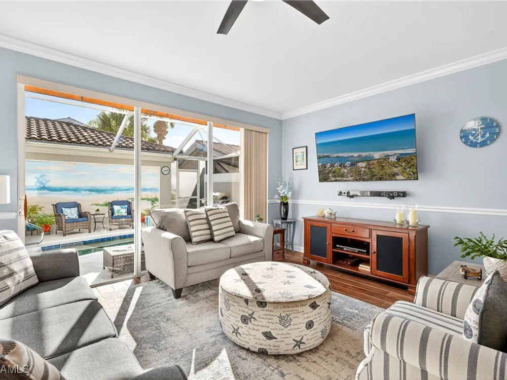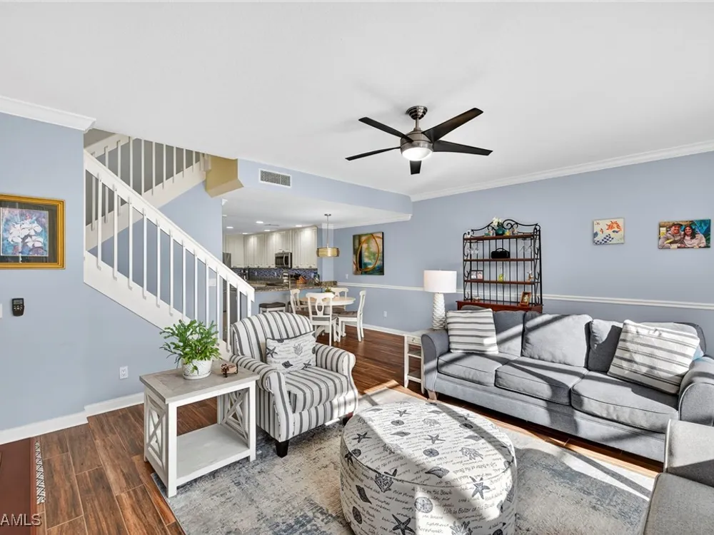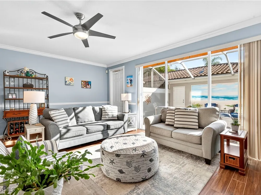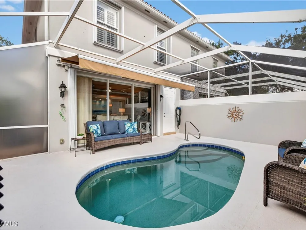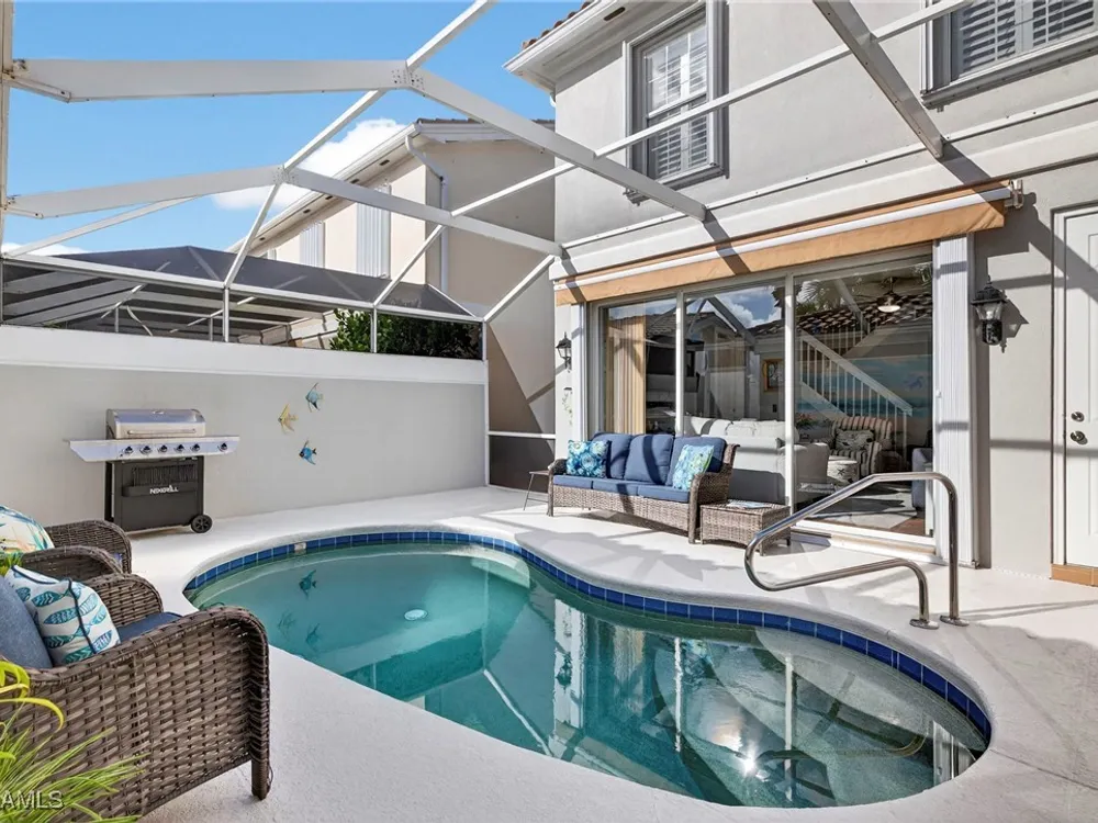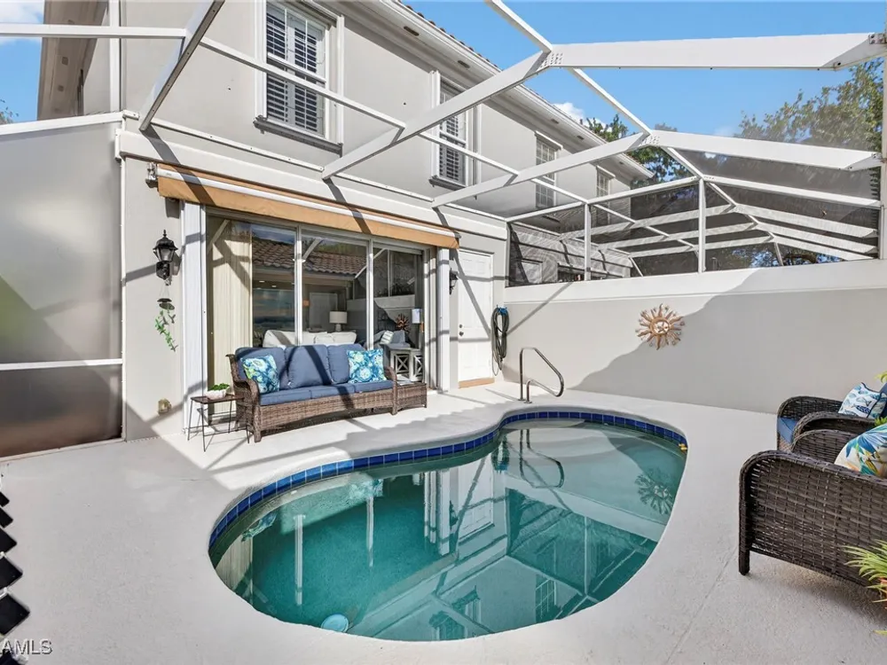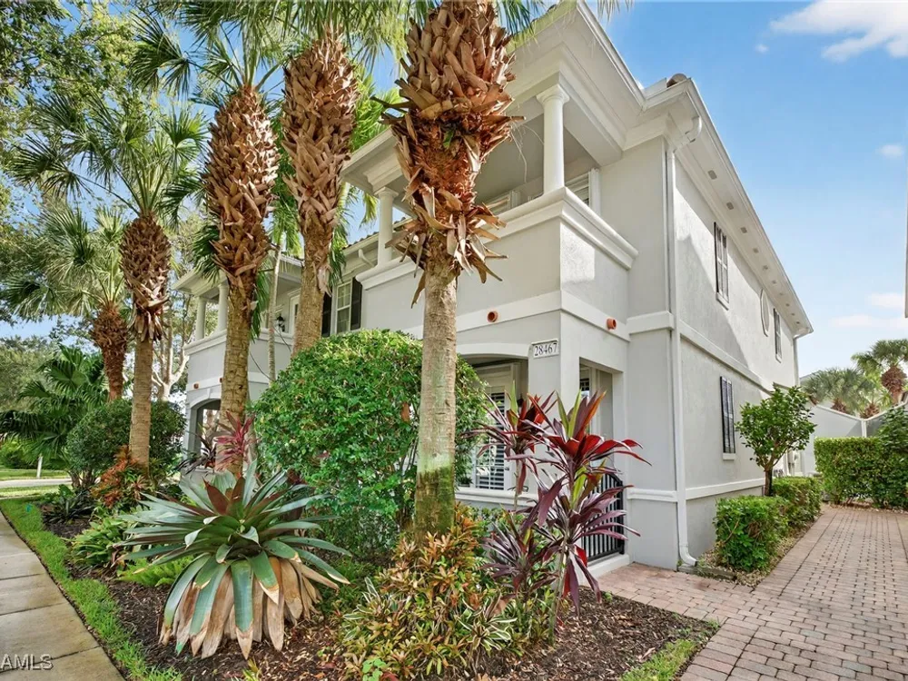 Discover your dream home in sunny Southwest Florida! This beautifully maintained “Cayman” townhouse offers three spacious bedrooms—including a convenient ground-floor suite with a built in Murphy bed and a private porch entry and two upstairs master suites, one featuring its own balcony, 3 full bathrooms and a two-car garage. This property is move-in ready for you to start enjoying the Florida lifestyle. Step inside to find easy to maintain ceramic tile floors on the 1st floor, plantation shutters, and a welcoming Florida color palette accented by crown and chair rail molding. Decorative ceiling fans and stylish light fixtures add comfort and charm throughout the home. The kitchen is perfect for entertaining and family gatherings, boasting island-style granite countertops, ample cabinetry, stainless steel appliances, a modern backsplash, and undercounter lighting for a warm ambiance. The welcoming great room features oversized glass sliding doors leading to the screened lanai, which displays a beautifully hand-painted coastal mural. This space is ideal for enjoying our delightful weather, entertaining guests, relaxing in the heated pool, or unwinding in the shade beneath the electric retractable awning while hosting gatherings with family and friends. Storage is never an issue, thanks to three large walk-in closets with modular organizers, under-stair storage, and plenty of cabinetry in the laundry room. Outside, enjoy fresh paint completed in 2024 and peace of mind with hurricane-ready accordion shutters. To keep you cool new HVAC in 2024. VillageWalk Blvd. is just a short walk, bike or golf cart ride to the amenity rich town center that offers something for everyone: resort style & lap pools, 24/7 fitness center, lighted Har-Tru tennis courts, pickleball center and bocce all with active leagues. In addition, there is a lighted basketball court, tot lot, full-service restaurant w/indoor and outdoor dining, beauty salon, bagel shop, spa, ice cream shop, and lots of planned activities by the full-time activities director. VillageWalk of Bonita is unique with it’s pretty butterfly gardens, miles of lakes, sidewalks, walkways over connecting bridges and impressive wildlife. It’s a great location to our beautiful sandy beaches, SW Florida International Airport, shopping and entertainment destinations. Guard gated, golf cart and pet friendly. Don’t miss your chance to experience the best of Southwest Florida living in this exceptional home!