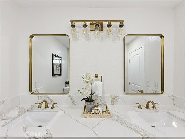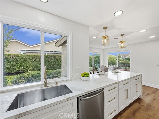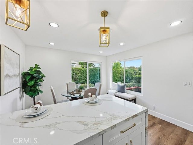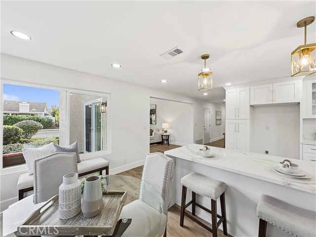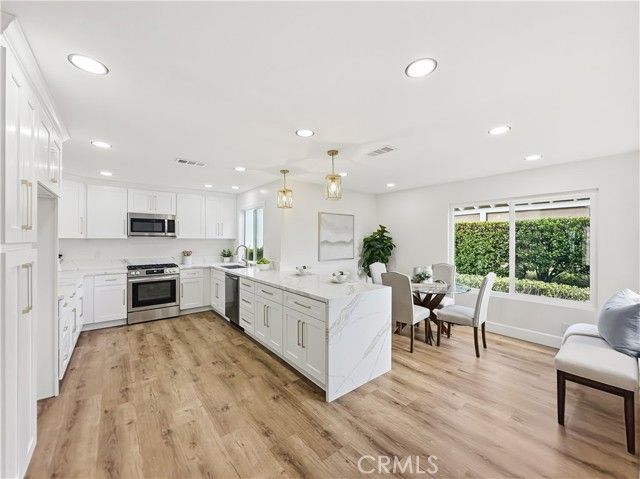 Welcome to 28495 Barbosa – a beautifully remodeled single-story residence nestled in the highly sought-after 55+ gated community of Casta Del Sol. Offering 1,279 square feet of thoughtfully reimagined living space, this stunning 2-bedroom, 2-bath home seamlessly blends timeless elegance with modern sophistication. Step inside to discover a bright, open-concept layout designed for both comfort and style. At the heart of the home is the show-stopping kitchen, fully renovated with soft-close cabinetry, brushed gold hardware, gorgeous quartz countertops, and premium stainless steel appliances—a perfect space for both everyday living and entertaining. The spacious living area centers around a custom-tiled fireplace, framed by double-pane windows and sliding doors that fill the space with natural light while offering a tranquil ambiance. The primary suite serves as a private retreat, featuring ample closet space and a luxurious en-suite bathroom with a dual-sink quartz vanity and a designer-tiled walk-in shower. Additional highlights include new luxury vinyl plank flooring, LED recessed lighting, upgraded electrical fixtures, and tasteful designer finishes that reflect quality craftsmanship throughout. Step outside to the beautifully designed stamped-concrete patio—an inviting space ideal for relaxing or entertaining in peace and privacy. Residents of Casta Del Sol enjoy a true resort-style lifestyle, complete with two recreation centers offering swimming pools, spas, pickleball and tennis courts, a fitness center, clubhouse, billiards room, and more—all set amid 484 acres of rolling hills and mature landscaping. HOA amenities include front yard maintenance, exterior painting, and trash service for effortless living. You’ll also enjoy exclusive access to Lake Mission Viejo, where you can enjoy boating, fishing, picnicking, and scenic walking trails. Don’t miss this rare opportunity to own a move-in-ready gem in one of Mission Viejo’s most desirable active adult communities