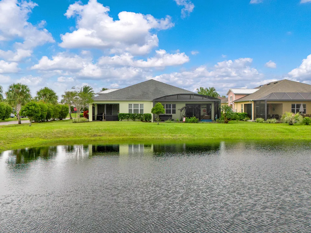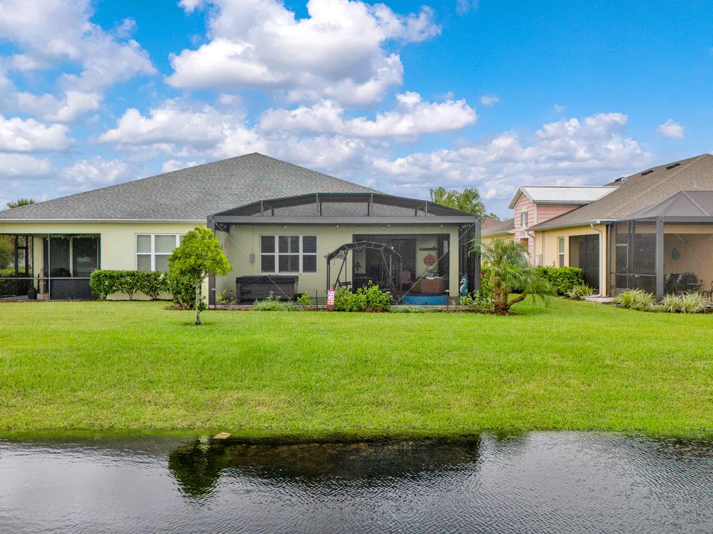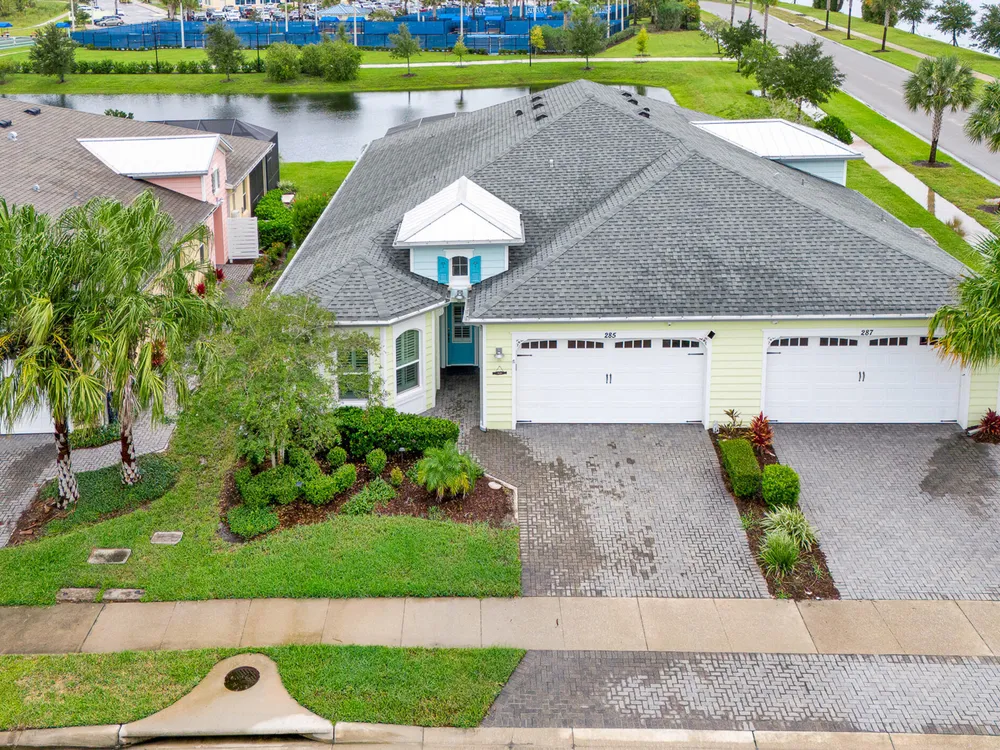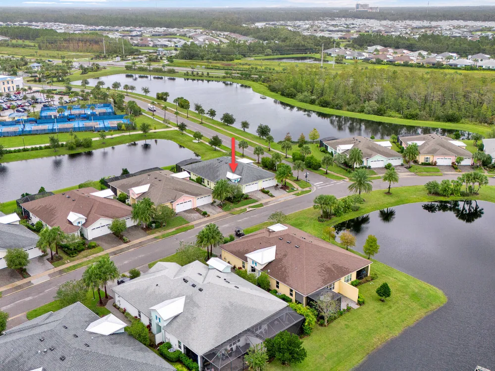 Beautiful Nevis located in Phase 1!! If you're concerned about parking for big event at town center, don't be, you can walk!! This sought after model is equipped w/many upgrades. Open the retractable screen at frt door & enjoy the beautiful breeze. Home has plank tile flrs throughout. Kitchen has 42'' white cabinets w/crown mldg, qtz ctrtops, SS appl incl slide in range w/dble oven. Main area has motorized shade on sliders. Plantation shutters in all rooms & ceiling fans. Both BAs have qtz ctrtops, flr to ceiling tile & grab bars. Main BR has a custom closet, BA has seamless shower encl. Step out onto the 20/20 full view screen encl & soak in relaxing hot tub or just sit on swing & enjoy the beautiful day! Lanai also has trav. flrng raised to height of sliders & to top it off, motorized hurricane screens will give you piece of mind. This community offers amazing amenities to incl fitness ctr, restaurant, resort style pool, & beach club just to mention a few!! Furniture negotiable