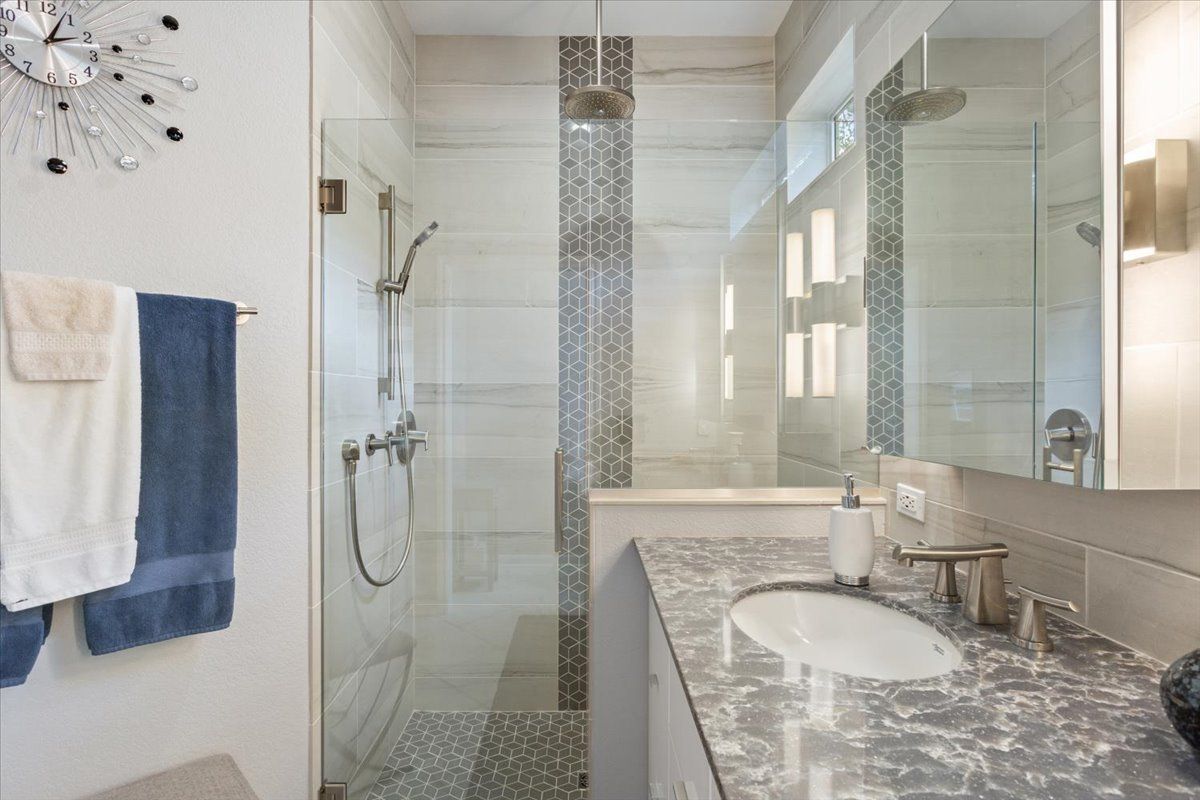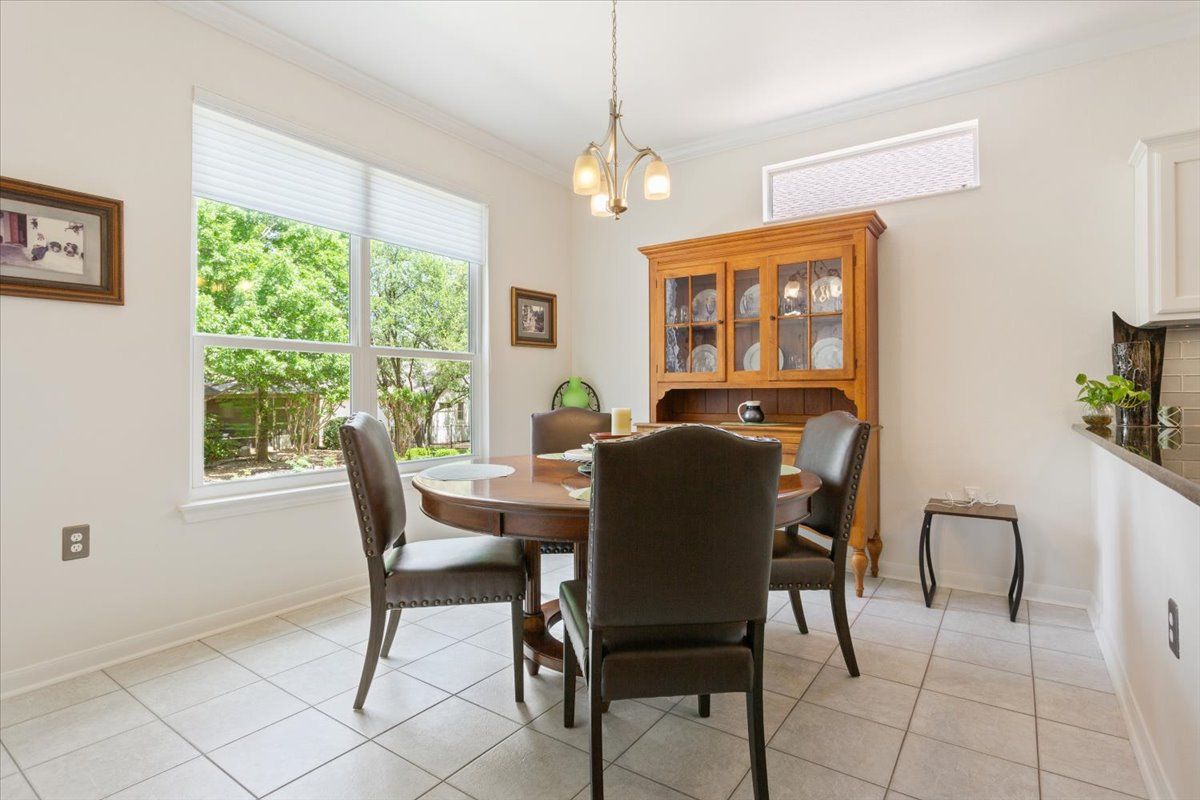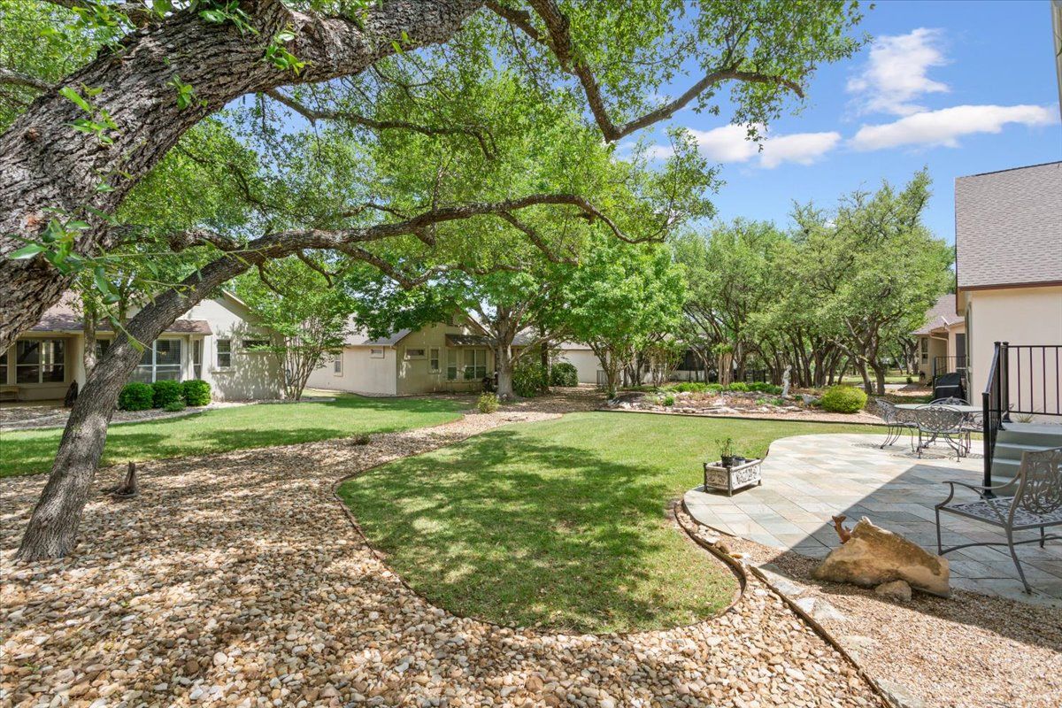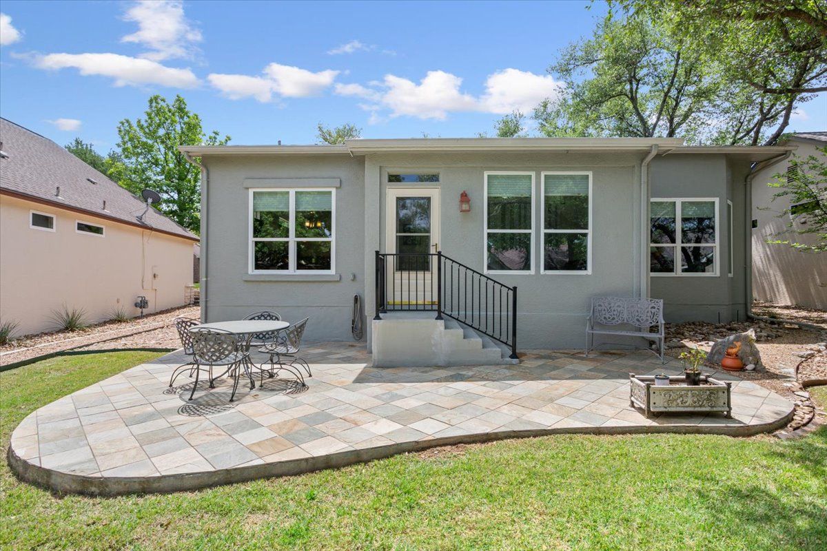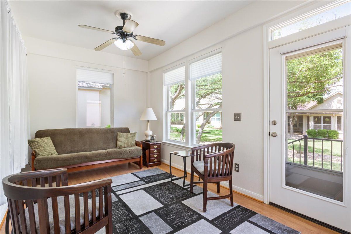 Thoughtfully designed and impeccably maintained, this modified Angelina floor plan offers an open, airy feel with elevated finishes and a highly desirable split bedroom layout in the heart of Sun City Texas. Designed for both comfort and style, the main living area features crown molding and a seamless flow ideal for everyday living and entertaining. The kitchen has been tastefully updated with granite countertops and pendant lighting, creating a warm and inviting centerpiece of the home. A fully enclosed 10x16 back porch extends the living space year-round, while a large tiled patio provides the perfect setting for outdoor relaxation. The primary suite offers a true retreat with a fully remodeled spa-like bath, including a walk-in shower, floating dual vanity with quartz countertop, upscale lighting, and dual mirrored medicine cabinets. The guest bath is equally well-appointed with a tiled shower, quartz countertop, and updated lighting. A charming window seat in the guest bedroom and a bay window in the primary bedroom add character and natural light. Additional highlights include an epoxy-coated garage floor, garage sink with cabinet, hot water recirculator pump, insulated garage door, and roof replaced in 2021. This immaculately cared-for home blends thoughtful design, quality upgrades, and a refined yet comfortable Sun City lifestyle.