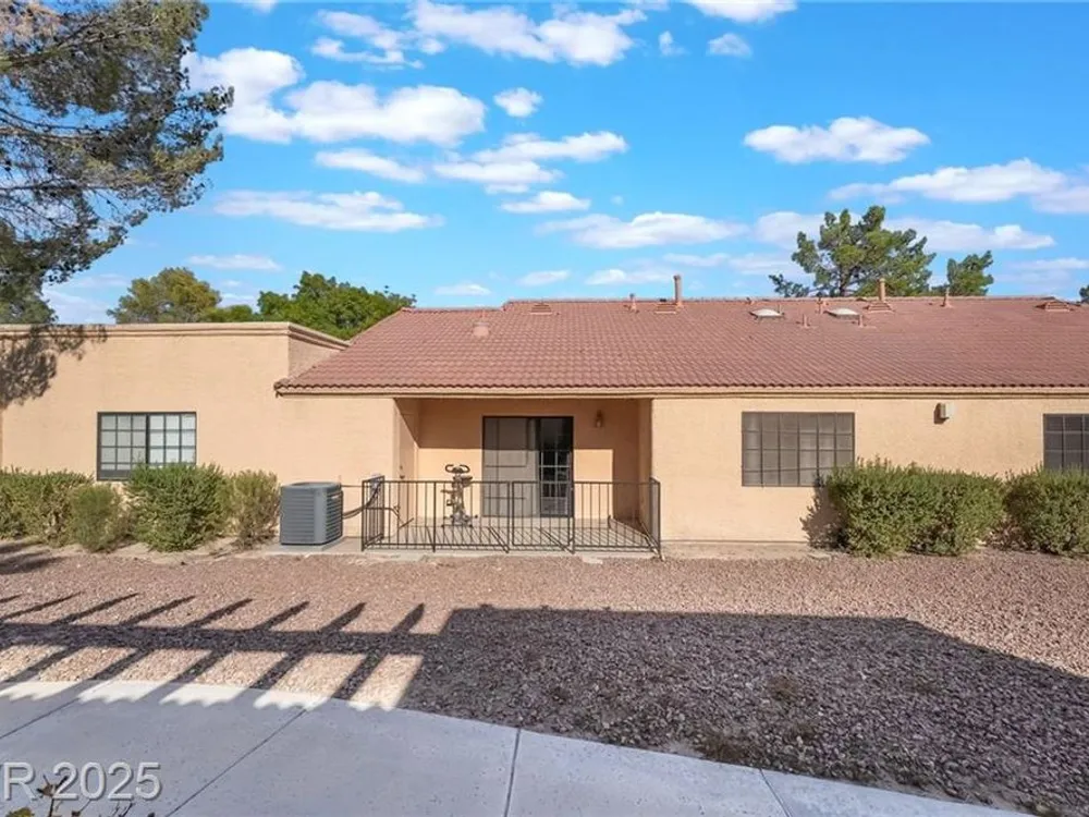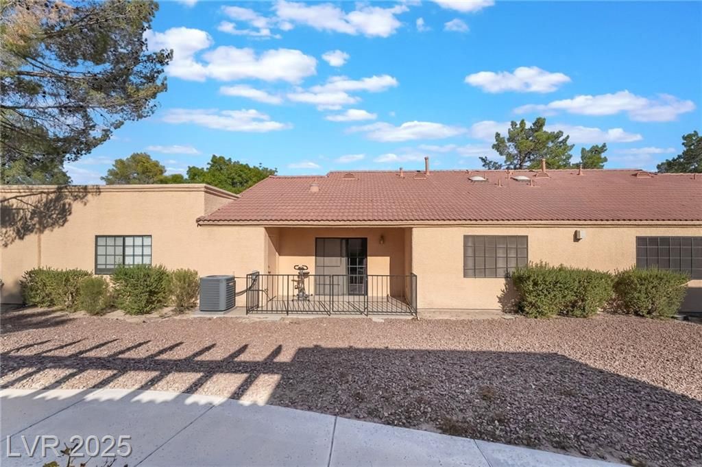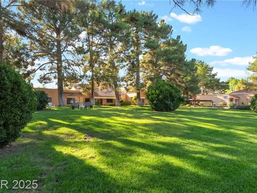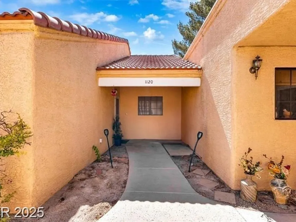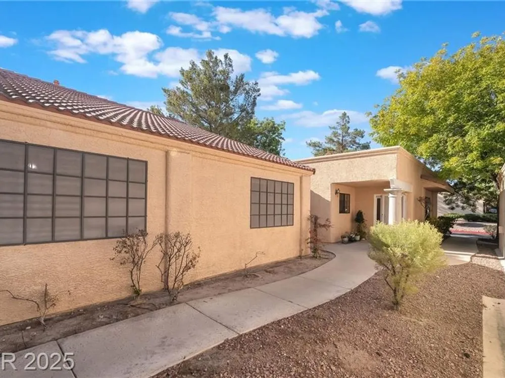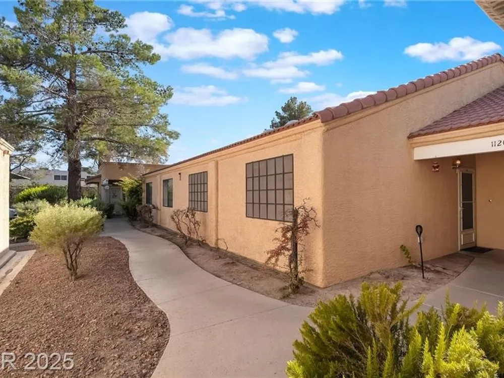 Located in a desirable 55+ gated community in the center of town, this charming one-story townhouse is filled with natural light, vaulted ceilings, and attractive flooring. The spacious living room is the perfect place to unwind, while the kitchen offers custom cabinets, beautiful countertops, and well-maintained appliances. The primary suite features an ensuite bath, and two guest bedrooms include roomy closets and stylish flooring. Enjoy cocktails on the quiet patio, with desert landscaping that adds great curb appeal. Washer & dryer are located in a separate laundry room for added convenience. Assigned covered parking + ample guest parking. Just minutes from the Strip and Hwy 15 — a perfect blend of comfort and location!