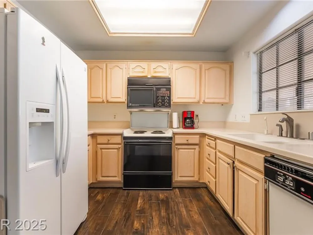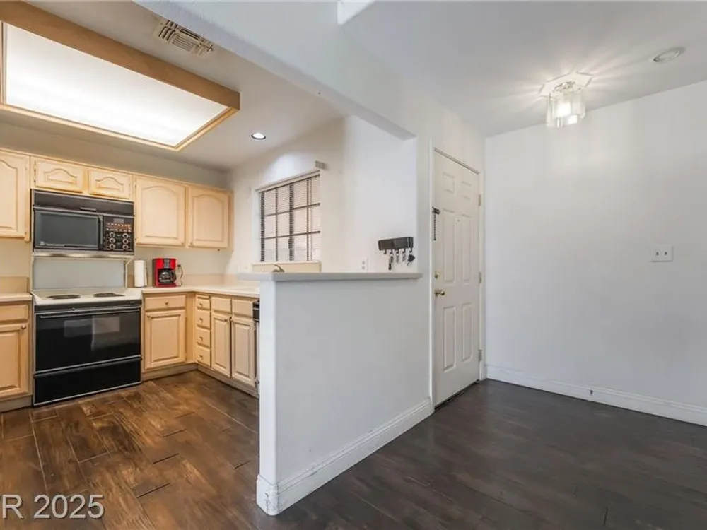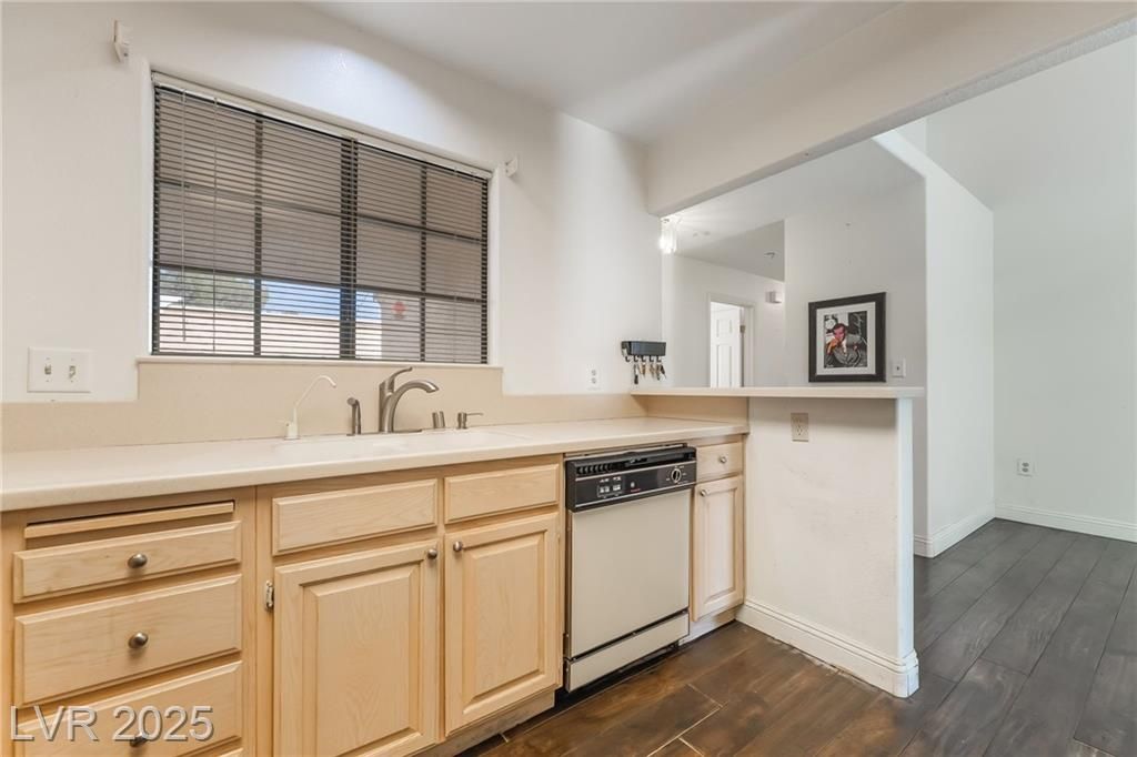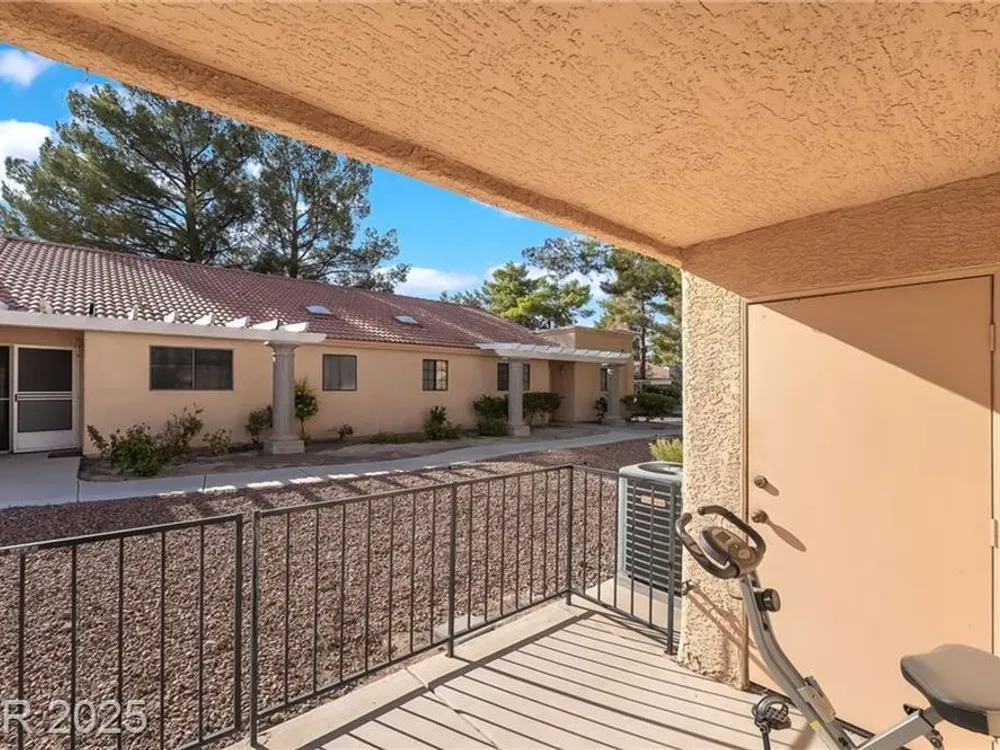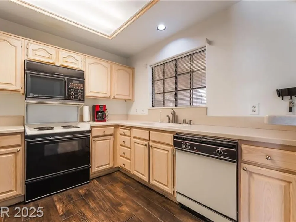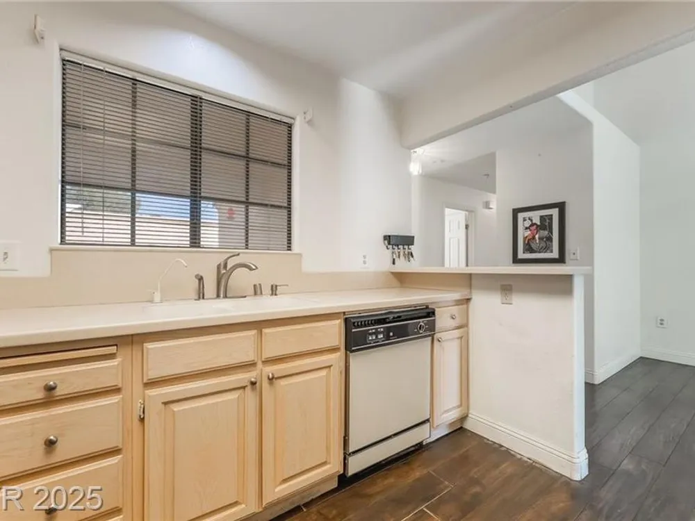 Located in a desirable 55+ gated community in the center of town, this charming one-story townhouse is filled with natural light, vaulted ceilings, and attractive flooring. The spacious living room is the perfect place to unwind, while the kitchen offers custom cabinets, beautiful countertops, and well-maintained appliances. The primary suite features an ensuite bath, and two guest bedrooms include roomy closets and stylish flooring. Enjoy cocktails on the quiet patio, with desert landscaping that adds great curb appeal. Washer & dryer are located in a separate laundry room for added convenience. Assigned covered parking + ample guest parking. Just minutes from the Strip and Hwy 15 — a perfect blend of comfort and location!