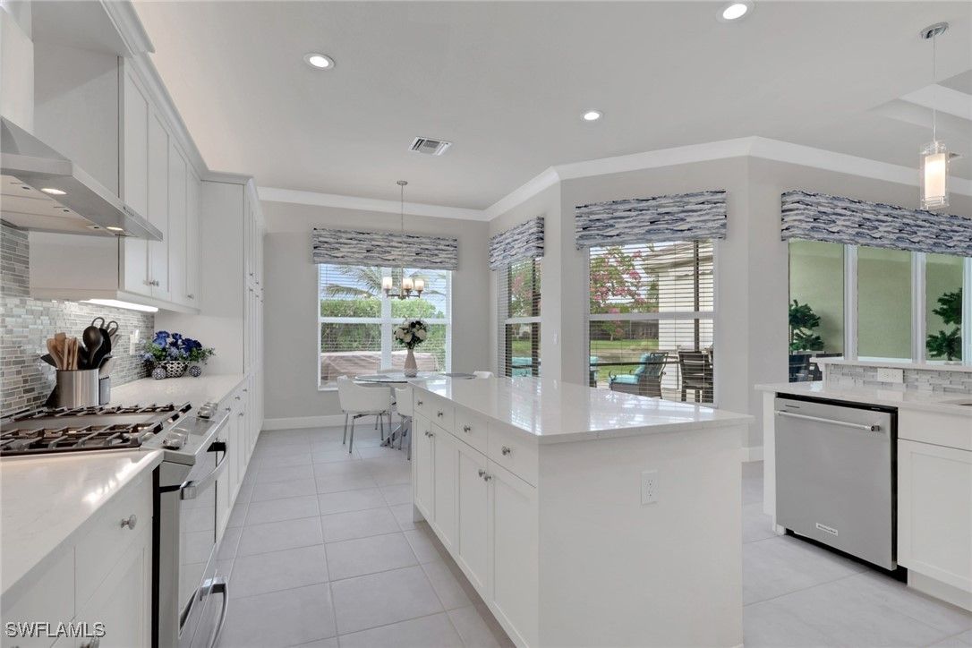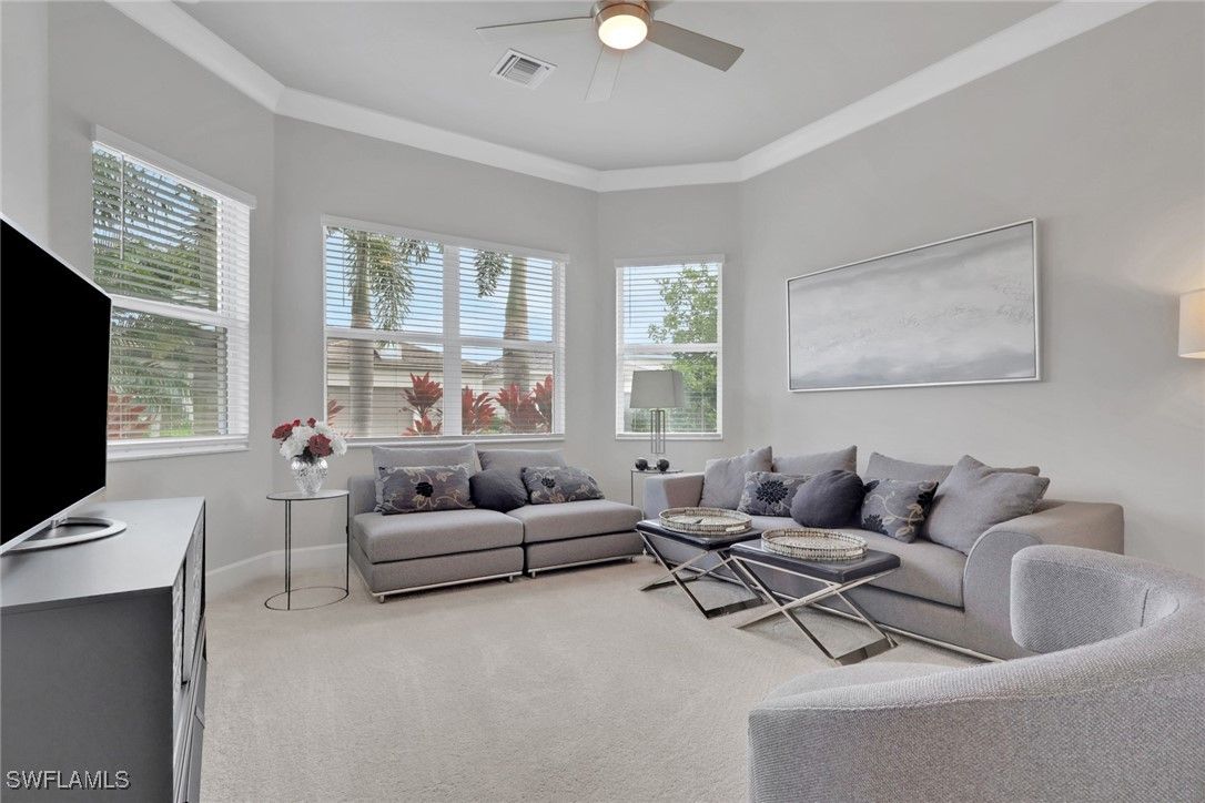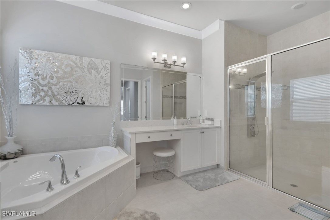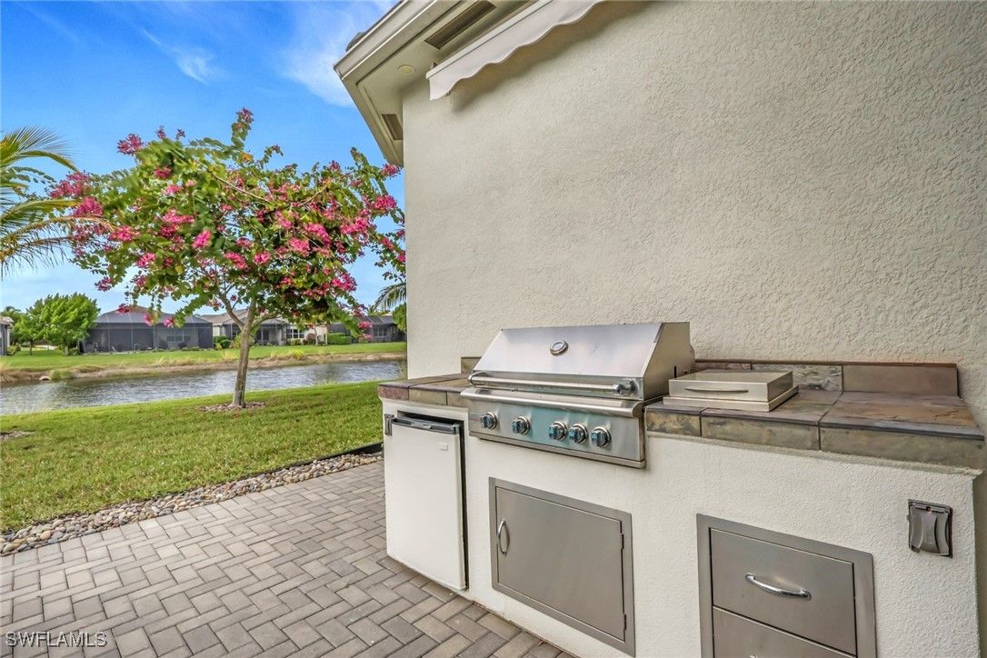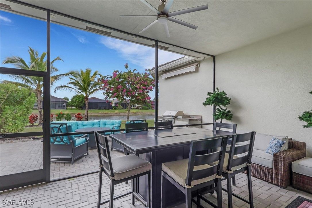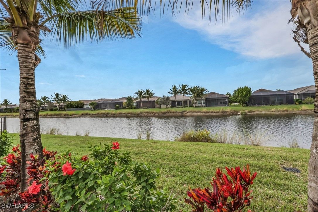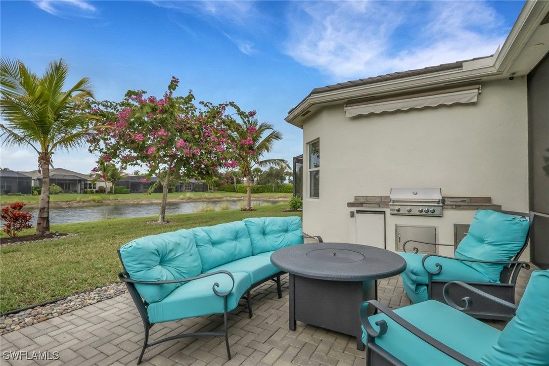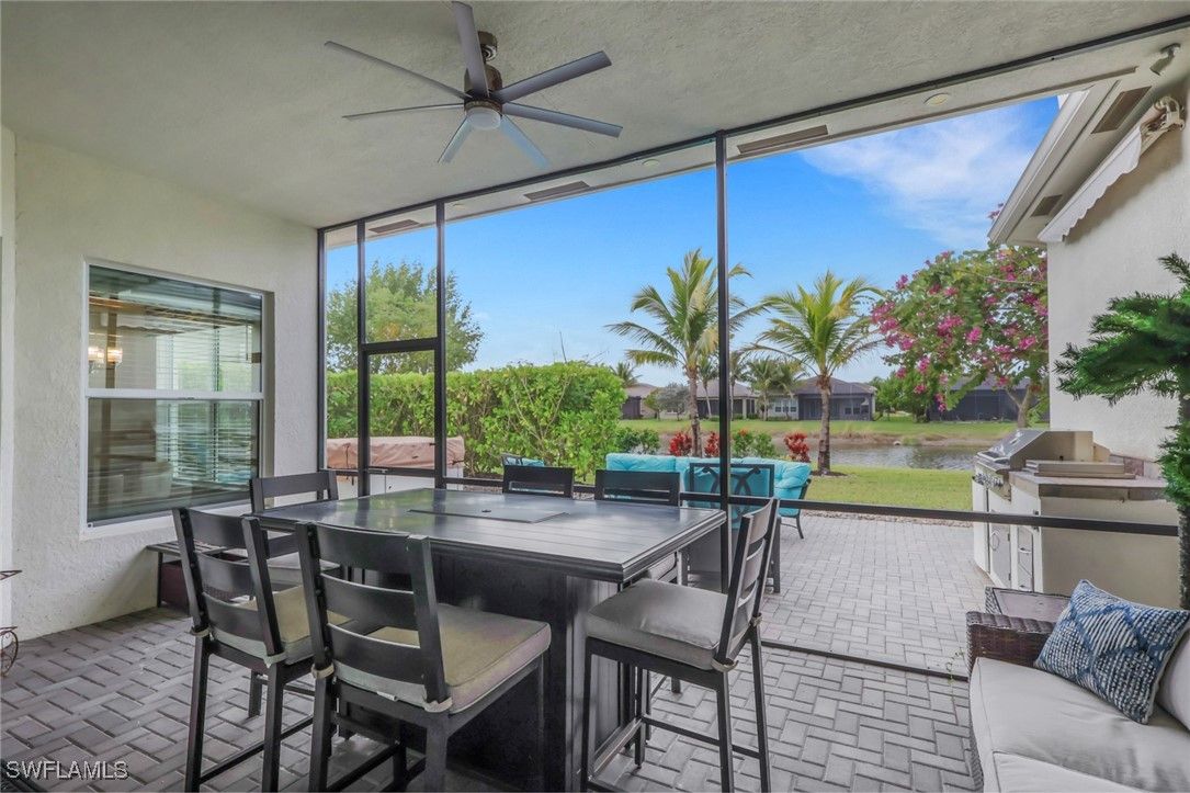 This large one-story Julia model is impeccably maintained on a lakefront lot featuring landscape lighting and sunset views. The home features 3 bedrooms + den, 3.5 baths, and a 3-car insulated garage, with epoxy floors, storage cabinets, a work bench, additional lighting, and 3 additional overhead storage racks. Enjoy impact-rated windows and doors, a one-year-old 22KW whole-house generator, a whole-house water filtration and softener, and solar panels that reduce the electric bill to $30 a month. The gourmet kitchen includes upgraded appliances (new extra quiet dishwasher), natural gas cooking, abundant cabinetry, upgraded LED lighting, and a spacious eat-in area, opening to a generous great room and a formal dining room. All rooms are furnished with blinds, while the great room has a motorized Hunter Douglas shade for the 3 sliders. The large primary suite is a luxurious retreat with two walk-in closets that include built-in shelves and clothing bars, and a spa-style bath with soaking tub, oversized shower with an upgraded jet system, and dual vanities. There is a second en-suite bedroom and bath for your guests, along with a third en-suite bedroom and bath, and an office/den (possible 4th bedroom). The tile flooring with newly resealed grout throughout, with carpet in the bedrooms, crown molding, and the open-concept layout, is ideal for entertaining and relaxing. The screened-in lanai includes a high-top fire pit table and chairs. The extended outdoor patio includes a built-in grill with a refrigerator, a fire pit with surrounding furniture, and a private Jacuzzi spa (recently replaced pump). An easy walk to the magnificent 45,000 sq ft clubhouse where Valencia Bonita residents enjoy SWFL's premier Active Adult community with the outstanding Oasis restaurant, Spa/Salon, several pools, tennis and pickleball courts, bocce courts, a fitness center, exercise/fitness programs, 40+ resident clubs, card rooms, and a social hall featuring entertainment and concerts.