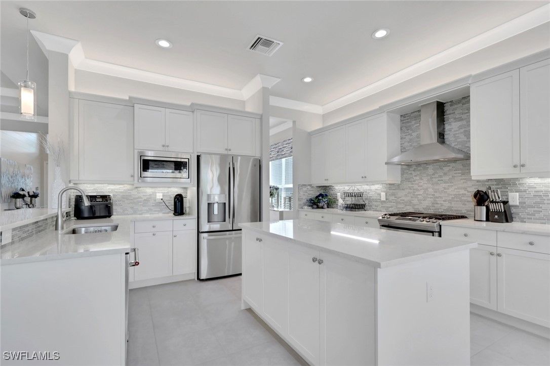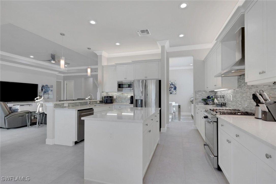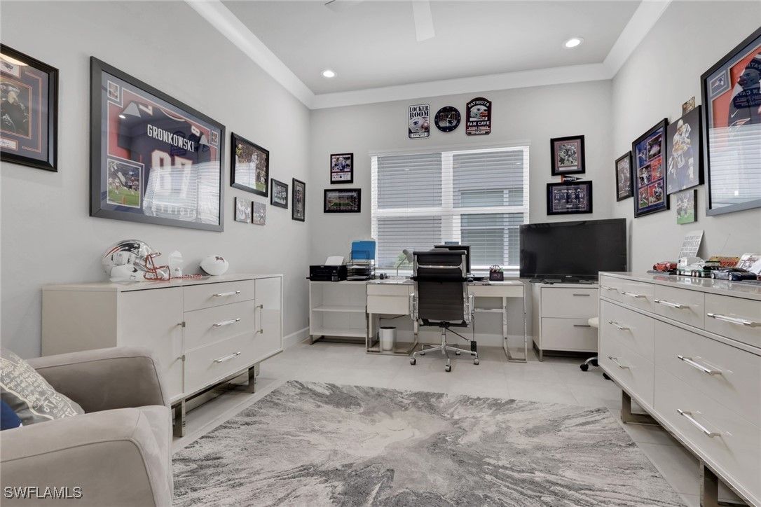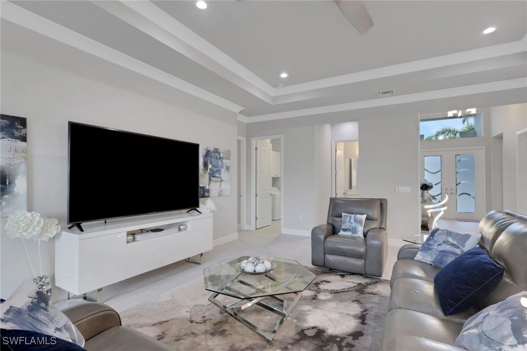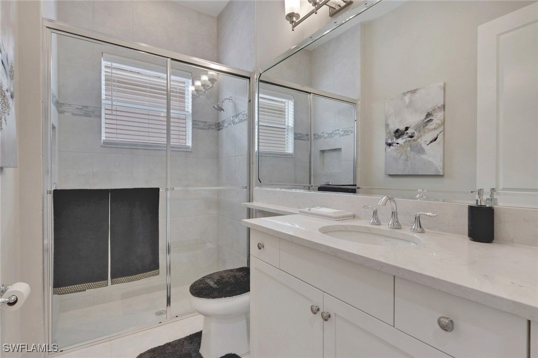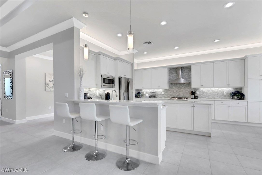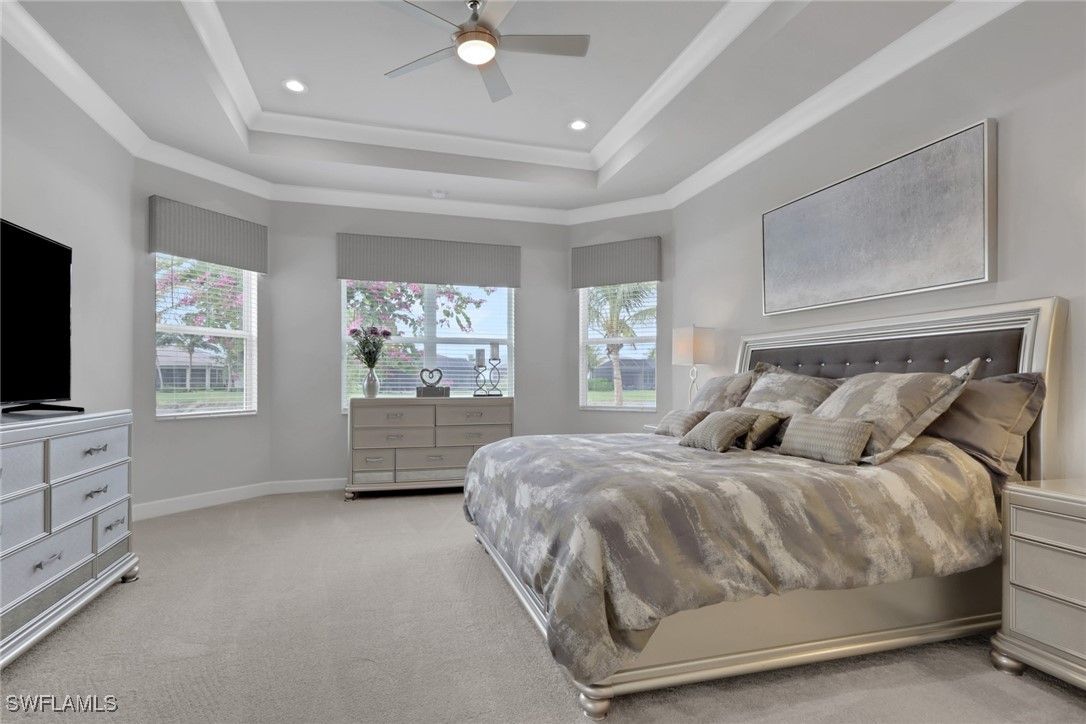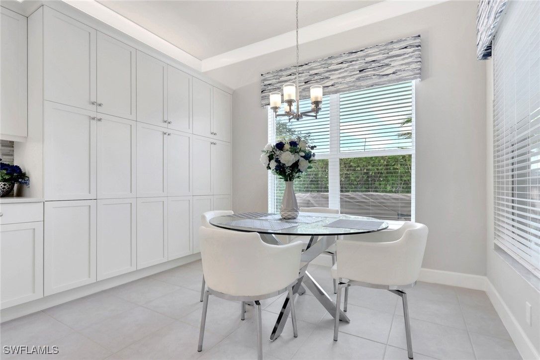 This large one-story Julia model is impeccably maintained on a lakefront lot featuring landscape lighting and sunset views. The home features 3 bedrooms + den, 3.5 baths, and a 3-car insulated garage, with epoxy floors, storage cabinets, a work bench, additional lighting, and 3 additional overhead storage racks. Enjoy impact-rated windows and doors, a one-year-old 22KW whole-house generator, a whole-house water filtration and softener, and solar panels that reduce the electric bill to $30 a month. The gourmet kitchen includes upgraded appliances (new extra quiet dishwasher), natural gas cooking, abundant cabinetry, upgraded LED lighting, and a spacious eat-in area, opening to a generous great room and a formal dining room. All rooms are furnished with blinds, while the great room has a motorized Hunter Douglas shade for the 3 sliders. The large primary suite is a luxurious retreat with two walk-in closets that include built-in shelves and clothing bars, and a spa-style bath with soaking tub, oversized shower with an upgraded jet system, and dual vanities. There is a second en-suite bedroom and bath for your guests, along with a third en-suite bedroom and bath, and an office/den (possible 4th bedroom). The tile flooring with newly resealed grout throughout, with carpet in the bedrooms, crown molding, and the open-concept layout, is ideal for entertaining and relaxing. The screened-in lanai includes a high-top fire pit table and chairs. The extended outdoor patio includes a built-in grill with a refrigerator, a fire pit with surrounding furniture, and a private Jacuzzi spa (recently replaced pump). An easy walk to the magnificent 45,000 sq ft clubhouse where Valencia Bonita residents enjoy SWFL's premier Active Adult community with the outstanding Oasis restaurant, Spa/Salon, several pools, tennis and pickleball courts, bocce courts, a fitness center, exercise/fitness programs, 40+ resident clubs, card rooms, and a social hall featuring entertainment and concerts.