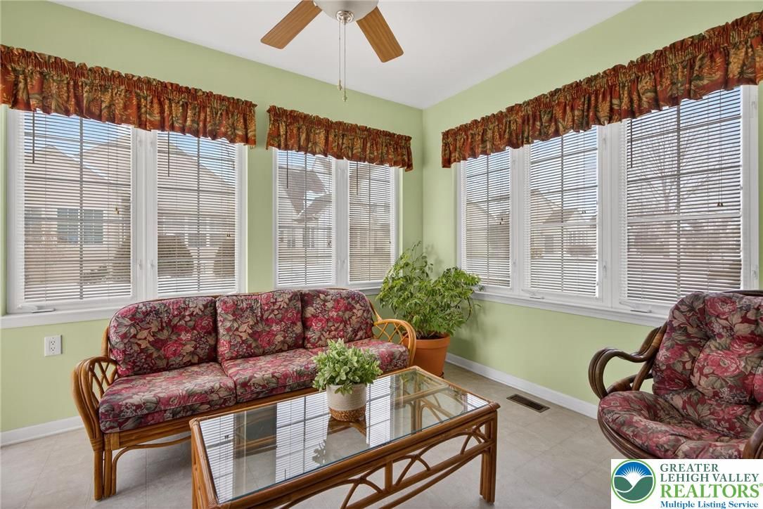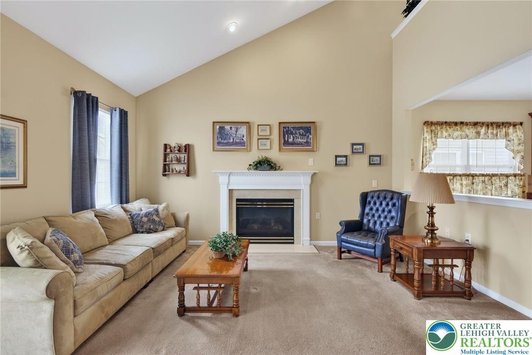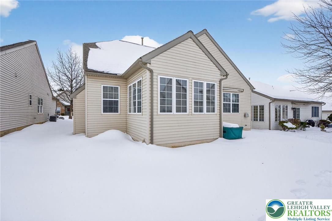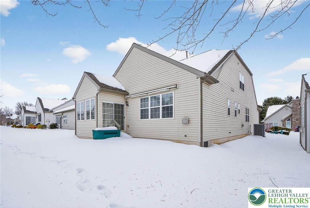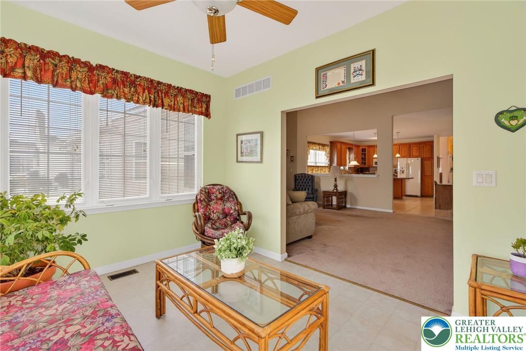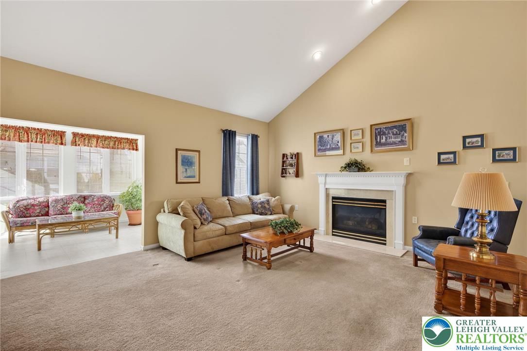 Welcome to Legacy Oaks, a 55+ community in Lower Macungie Township. This well maintained home offers 3 bedrooms and 3 bathrooms and is one of the larger models in the neighborhood. The property includes driveway parking and a 2 car garage. Inside, the foyer opens to hardwood floors and an open flow into the living and dining rooms. The kitchen features updated appliances, tile flooring, quartz countertops, a center island, and an eat in area. Open to the kitchen, the family room includes a gas fireplace and provides a comfortable gathering space. The family room opens directly to a bright four season sunroom, which offers access to the rear patio. The first floor includes a spacious primary suite with two closets, including a walk in closet with organizers, along with an en suite bath featuring a Jacuzzi tub. A second bedroom and a conveniently located half bath are also on this level. The laundry room is located on the main floor and provides direct access to the garage. Upstairs, a clean and open loft overlooks the main living space and is complemented by a finished walk in storage room, an additional bedroom, and a full bathroom. The full basement offers substantial storage and flexibility for future use. Residents of Legacy Oaks have access to community amenities including a swimming pool, tennis and pickleball courts, walking paths, a library, and an exercise room.