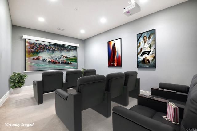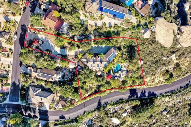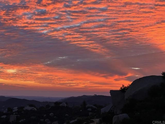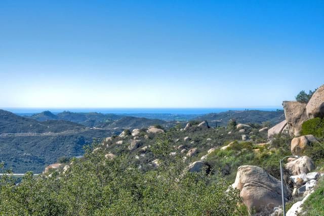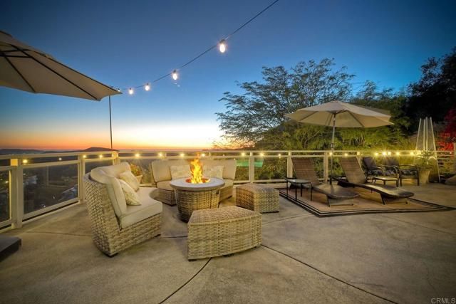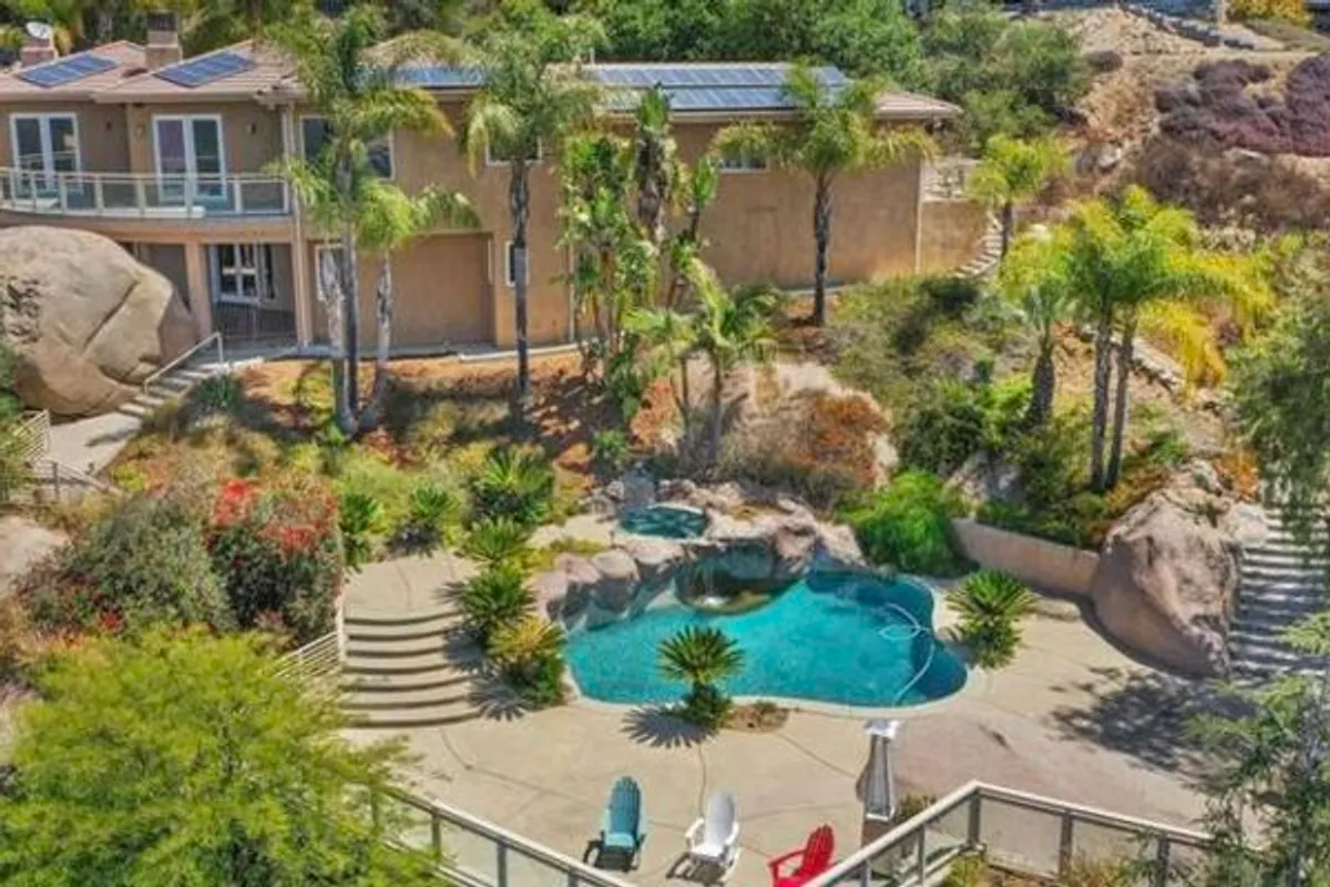Perched high in the boulders of Hidden Meadows, this custom home feels like you’re living above it all—literally. From sunrise to sunset, the soaring panoramic views stretch across rolling hills to the ocean and islands beyond. These are the kind of huge views that make every day at this incredible Propertunity feel like a vacation! The stylish and smart floor plan flows effortlessly from room to room. The interior features rich wood flooring, lots of natural sunshine, and recessed lighting. The kitchen and living room open to a large view deck, perfect for morning coffee, sunset dinners, or an evening glass of wine while the sky puts on a show. The living room is anchored by a gorgeous fireplace with modern stone surround, while the kitchen boasts handsome wood cabinetry, granite counters, and gleaming stainless steel appliances. The primary suite is a retreat of its own, complete with private deck access, a romantic fireplace, a spa-like ensuite bath, and the spacious custom closets you’ve always dreamed of having. The lower level boasts a versatile den or office area with its own fireplace, built-in wood shelves, and desk nook, and access to the pool/patio area via elegant glass French doors. Two large ensuite bedrooms (primary-like in size, with walk-in closets) and an additional theatre room (currently configured as an office and home gym, could be optional 4th bedroom) on this level offer extra flexibility for guests or multi-gen living. Outdoors, you'll be living the entertainer’s dream with a resort-style pool featuring a tranquil view spa, plus a waterfall you can actually sit beneath—equal parts fun, relaxing, and unforgettable. The property is fully fenced and gated, giving your dogs space to roam and live their best life while you enjoy the privacy of a quiet cul-de-sac location in one of North County's most desirable neighborhoods. Community roads have recently been refreshed! The oversized three-car attached garage with epoxy floors and drop-down ladder offers ample storage, while thoughtful details throughout the property reflect quality construction and pride of ownership. The home is on sewer and propane, a major plus for the area, with very low HOA dues. No Mello-Roos! Brand-new 75-gallon water heater just installed! Practicality meets peace of mind with fresh pre-listing property and termite inspections ready to go, along with title, NHD, and seller disclosures available upfront—so you can move forward with ultimate peace of mind. And while the setting feels wonderfully private, you’re just minutes from I-15, connecting you easily to shopping, dining, wineries, and the coast. Whether you’re floating in the pool beneath the waterfall, sipping wine on the deck as the sun dips toward the ocean, or enjoying the quiet calm of this special neighborhood, 28521 Gladstone invites you to slow down, breathe deeper, and live that beautiful North County life!
