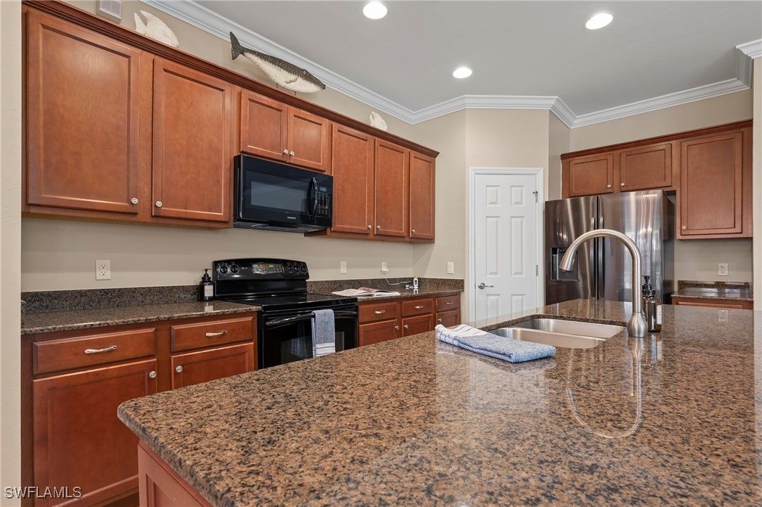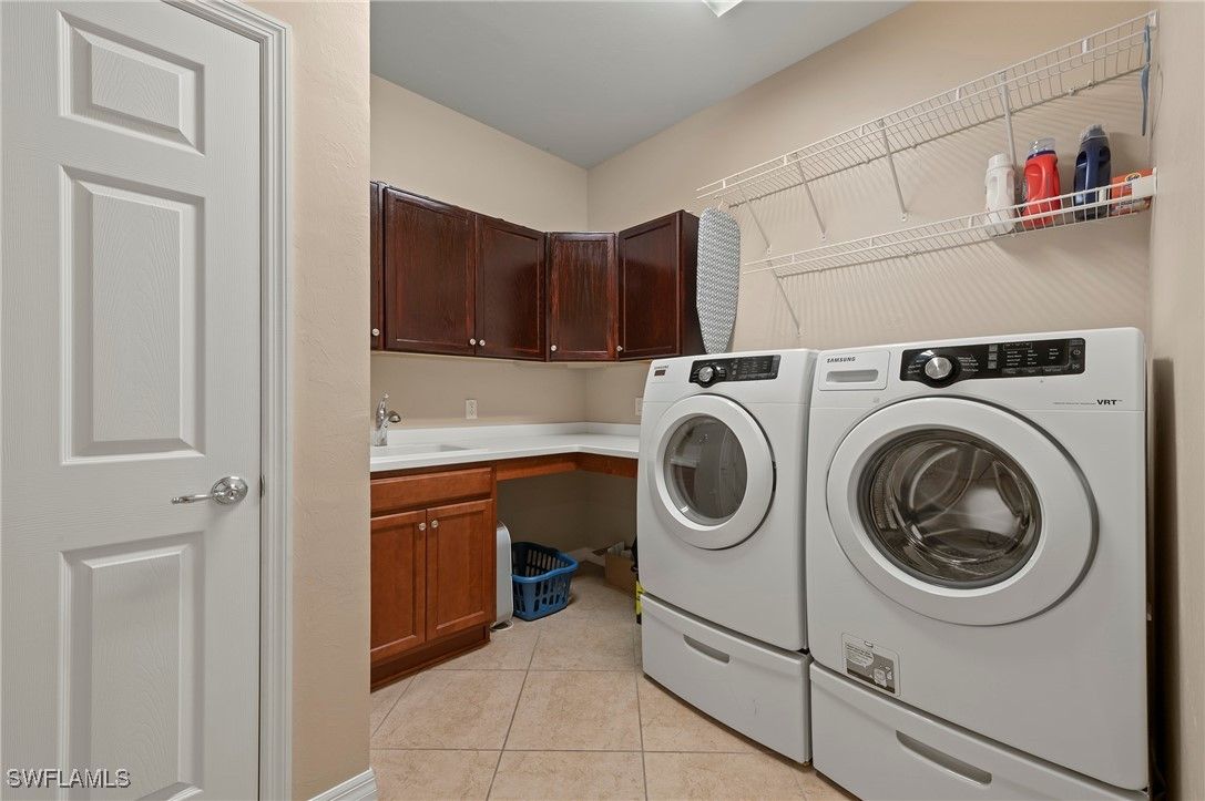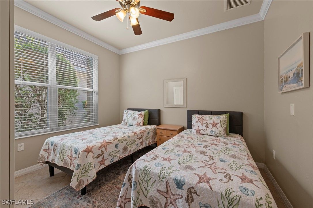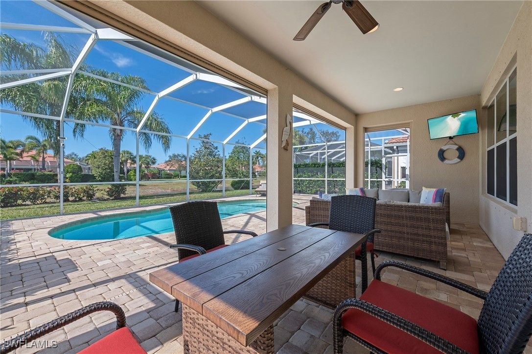This highly sought-after Tifton pool home is now available on a quiet street just two blocks from the Town Center amenity area. The home is fully storm protected, featuring power shutters on the lanai and accordion shutters on all remaining windows for peace of mind. The versatile floor plan offers 2 bedrooms plus a den and a flex room, perfect for an office, providing plenty of space to suit your lifestyle. The open kitchen is ideal for both casual and formal dining, with seating at the island as well as a spacious dining area. Thoughtful features include a microwave, range, island end cabinets for small appliances, and a walk-in pantry, making this kitchen a true chef’s delight. A split-bedroom layout places guest or family bedrooms toward the front of the home with a shared bath, while the owner’s suite offers privacy and stunning views through three large triple windows overlooking the pool and lake. The laundry room is generously sized and includes a utility sink with space to accommodate an ironing board and drying rack. Step outside to the covered lanai, which provides ample room for both an outdoor seating area and dining table—perfect for entertaining or relaxing by the saltwater pool. Recent updates include pool solar panels replaced in 2024, pool pump replaced in 2024, and a water heater replaced in 2022. VillageWalk is a vibrant community of mostly lakefront homes, connected by scenic Riverwalks leading to the Town Center. Amenities include a bagel shop, VillageWalk Bar & Grill, post office, hair salon, spa, ice cream shoppe, as well as bocce, basketball, playground, pickleball, tennis, two pools, and a full-time activities director. Conveniently located near Coconut Point, Gulf Coast Town Center, Logan Landings, Tarpon Bay Plaza, and the upcoming Midtown Bonita, this home is just 25 minutes from RSW Airport and minutes from the charm of historic Downtown Bonita Springs and it's new dining and entertainment venues