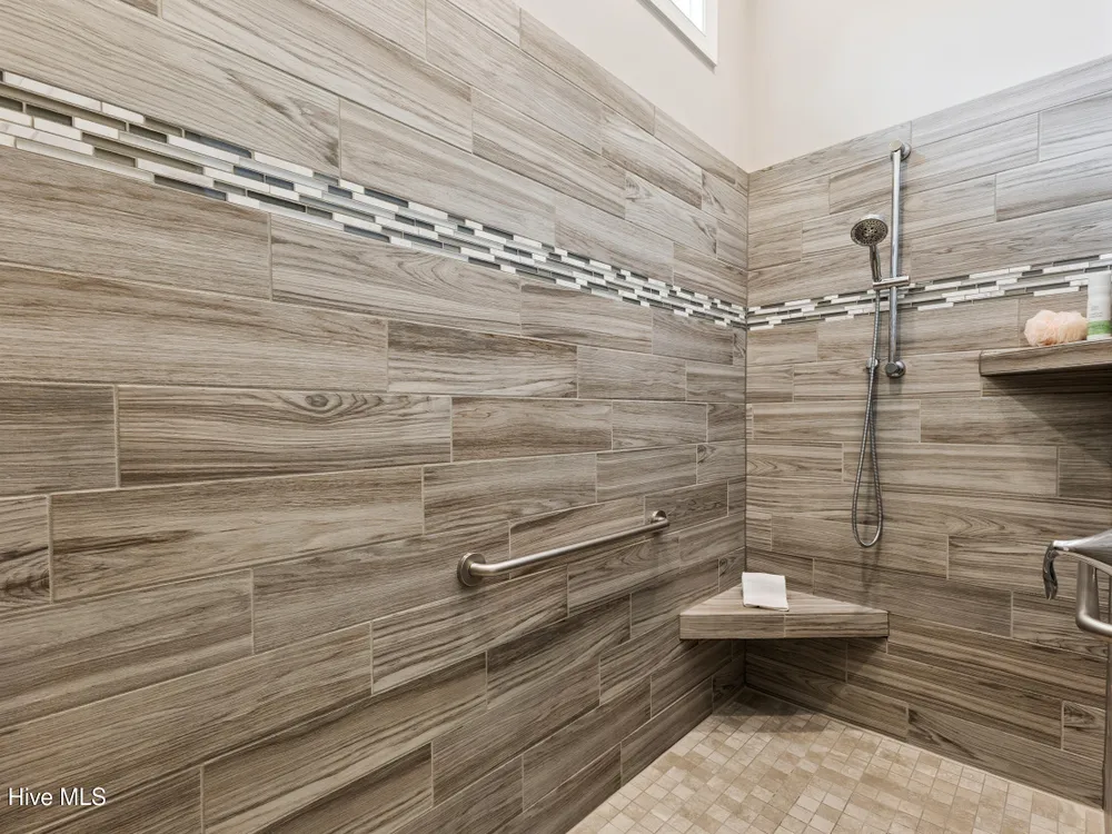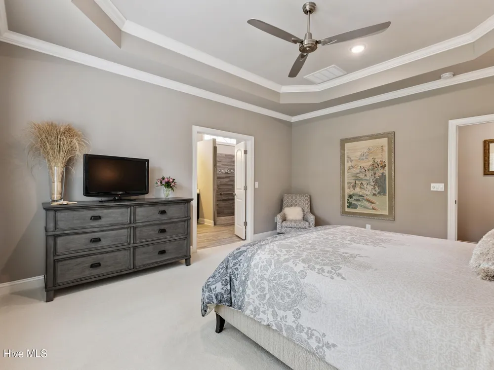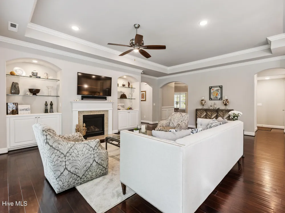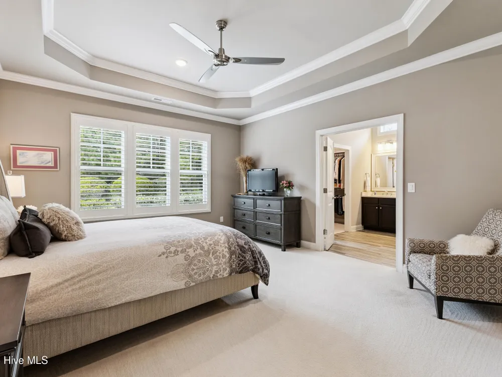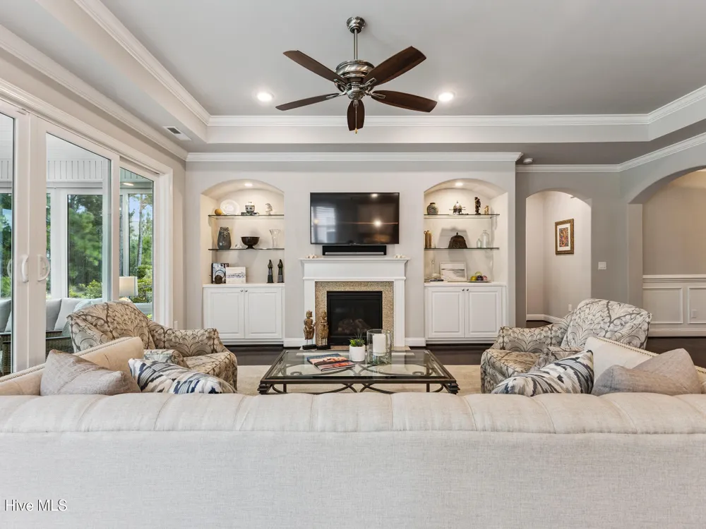 - Blinds/Shades, Tray Ceiling(s), Walk-In Closet(s), Walk-in Shower, Entrance Foyer, Pantry, Master Downstairs, Kitchen Island, High Ceilings, Gas Log, Ceiling Fan(s), Bookcases