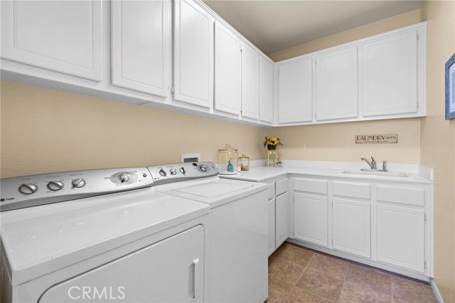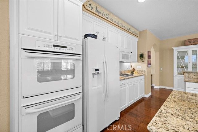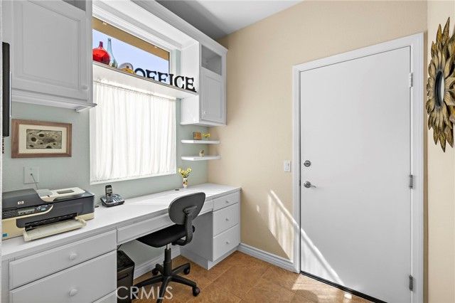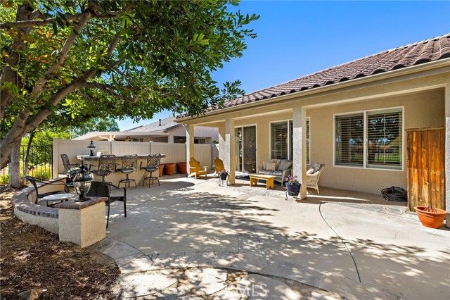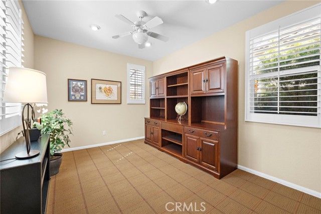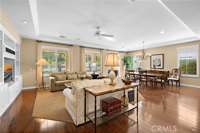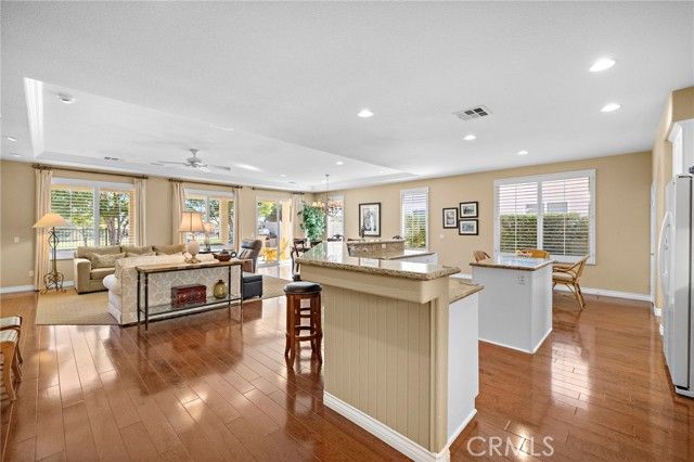 Panoramic GOLF VIEW!! Single Family Home- 3 Bedrooms with office. The Oasis is a vibrant 55+, 24-Hour Guard Gated and Resort Style Community and boasts the Menifee Lake Country Club Golf Course, along with many amenities. Step in this double door freshly painted exterior to the customized entry way with added dramatic arches, wood flooring and can lighting throughout. Custom Bookcase added in the stellar sized Family Room. Open concept with large gourmet kitchen, granite countertops, an extended bar, provides exceptional space and dining options. Formal dining is adjacent to kitchen and family room for optimal entertaining and view of golf course. Primary Bedroom has upgraded custom shelving and a retreat style area. Primary bath has been upgraded with porcelain tile flooring, raised counters and walk- in shower. Secondary Rooms are both spacious: one with wood flooring and one with carpet and shared bath with tub. The office space is a builder upgrade with above desk shelving added. Inside laundry and sink. Patio has built in BBQ plenty of space to relax and freshly painted fencing to enjoy the quiet of the golf course. HOA covers front yard care and trash service.