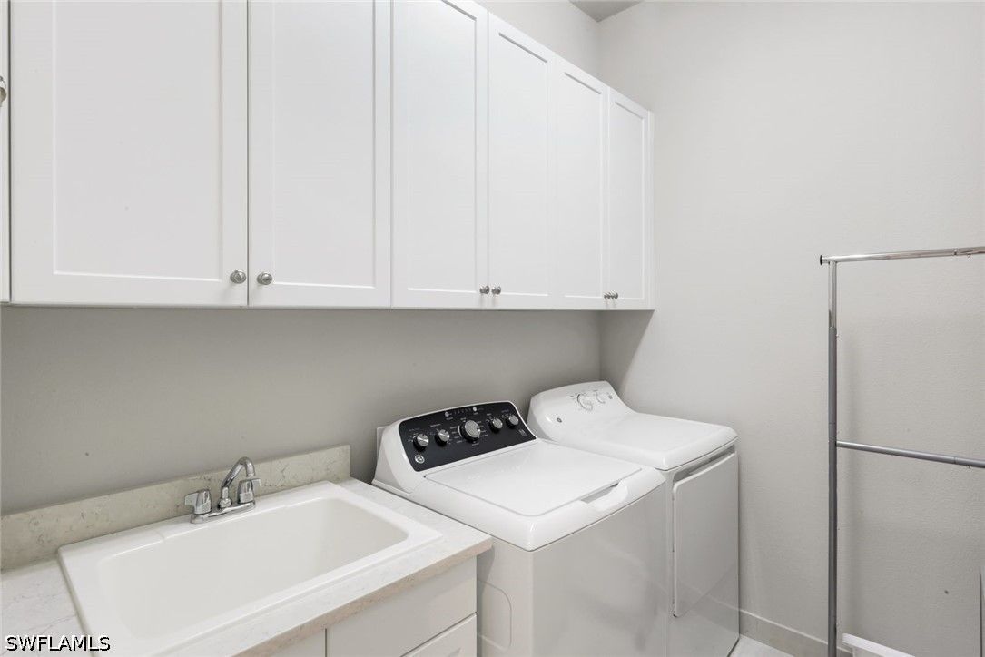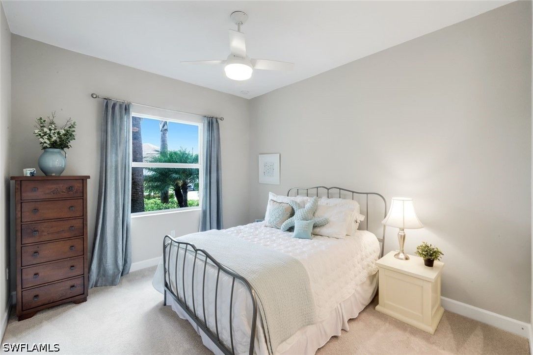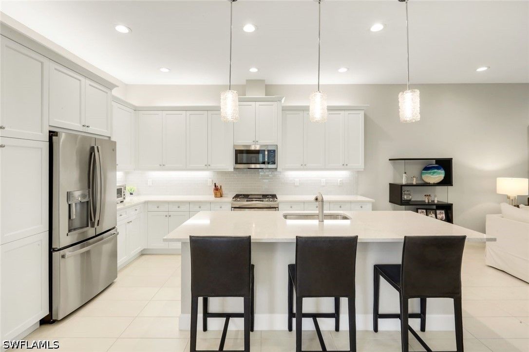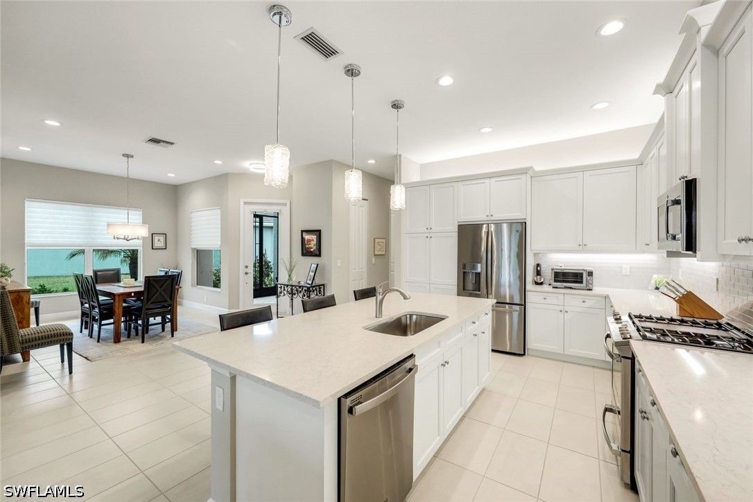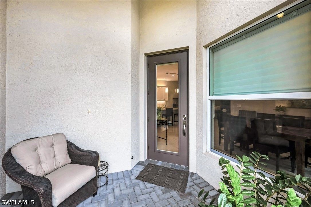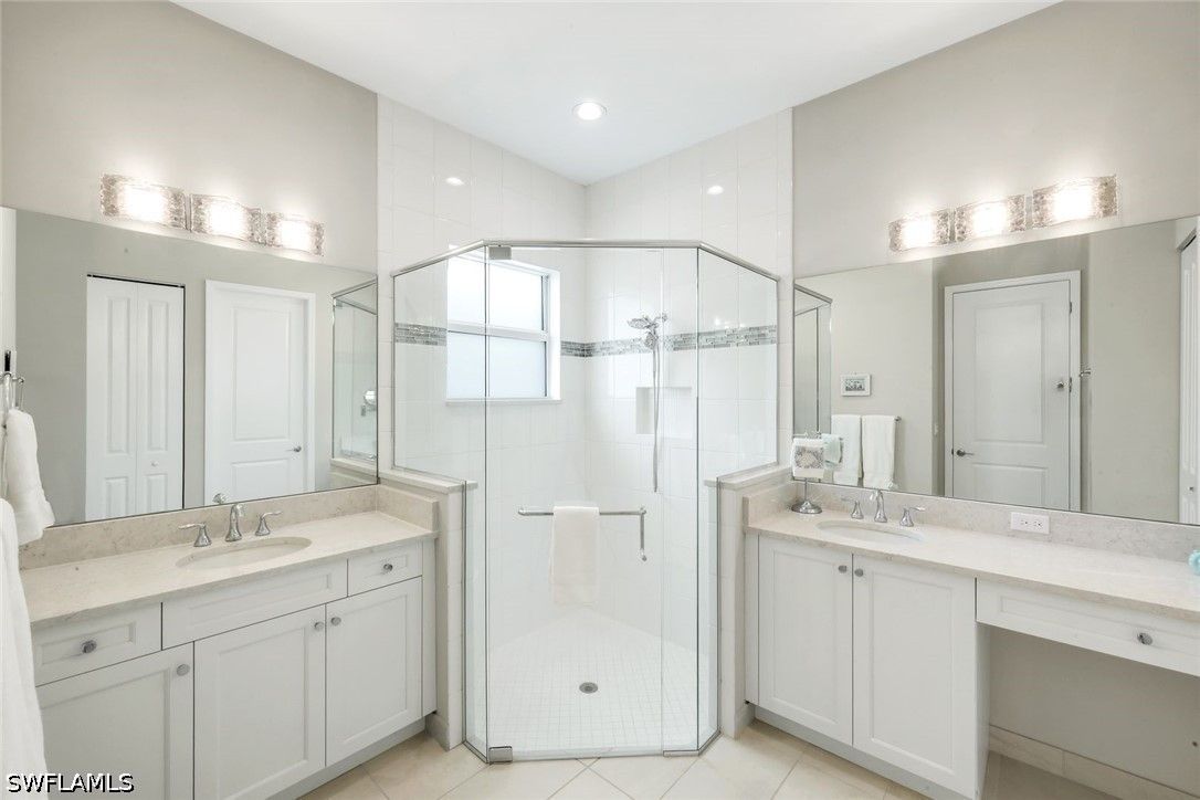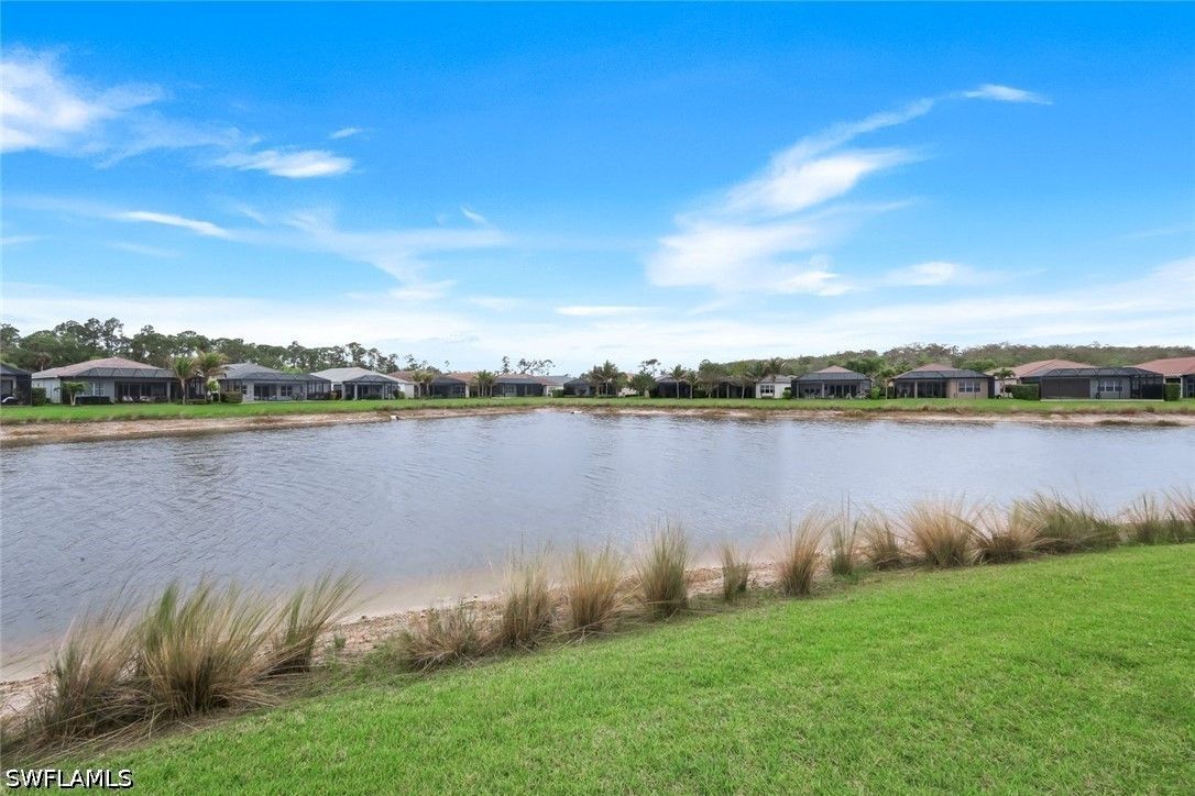 SPECTACULAR VILLA, HOMESITE AND VIEW! This attached villa, the very popular York plan is sitting on a pie shaped homesite providing that additional space between your neighbors. You will also have the benefit of a beautiful lake view and sunsets. This home provides you with an open layout with 2 Bedrooms, large den, 2 full Bathrooms, half bath along with a 2 car garage. The kitchen features white raised panel shaker cabinets with large built in pantry, above & below cabinet lighting, quartz countertops, glass subway tile backsplash, large stainless steel undermount sink, GE stainless steel appliances which includes a natural gas range, GE Profile Series Refrigerator, microwave which is vented out. 12” X 24” tiled floors throughout the main living space. More upgrades include a screened front entry and lanai no-seeum screen and top down / bottom up large cell shades for heat protection and flexibility for privacy and view of the property. The owner installed a fantastic light fixture package along with ceiling fans. The bathrooms come with white raised panel wood cabinets, large floor tile that includes large wall tile with listello accents at the bathtub and shower enclosures along with quartz countertops and luxury height toilets. Other additions through the builder were upgraded recessed lighting package, laundry room sink with base cabinet and upper cabinets, IMPACT GLASS WINDOWS, glass front entry door and an extended paver patio. Step outside onto your covered paver patio with the additional patio deck where this space provides ample room to entertain or just relax when looking at that beautiful lake view. All of this is located within Valencia Bonita, a vibrant 55+ community offering unmatched amenities including a spectacular clubhouse, resort-style pools, state-of-the-art fitness center, pickleball and tennis courts, full-service salon, restaurant and outdoor bar, and an active calendar of social events and clubs. Don’t miss your chance to own this impeccably upgraded, move-in-ready home. Schedule your private tour today and experience the best of Southwest Florida living.