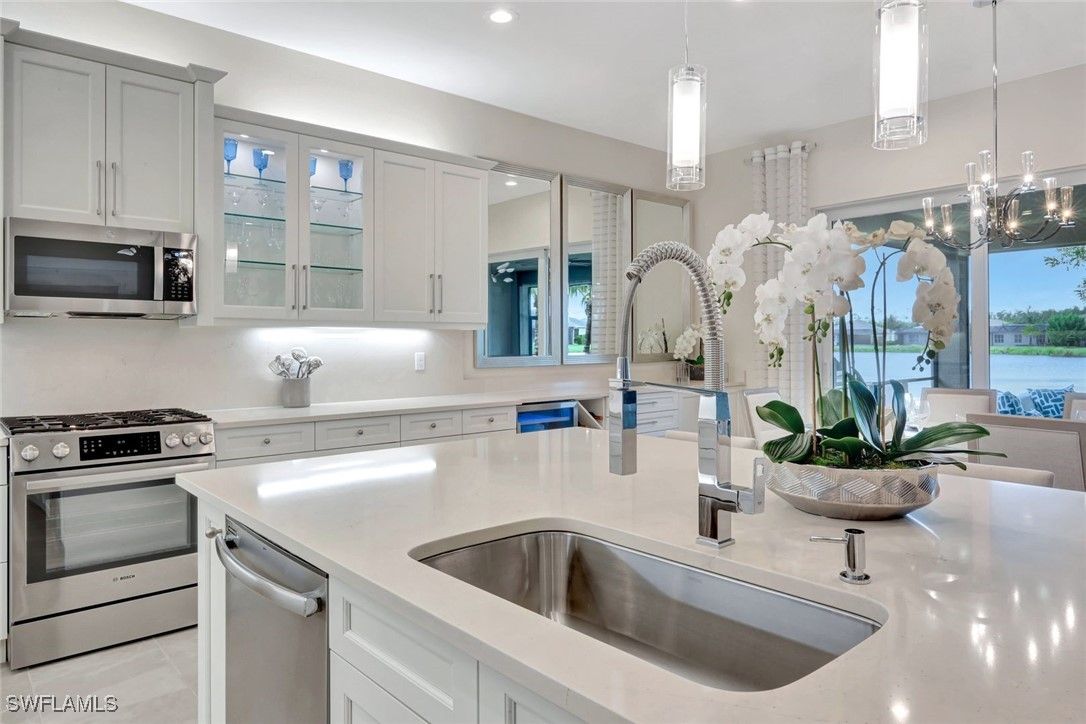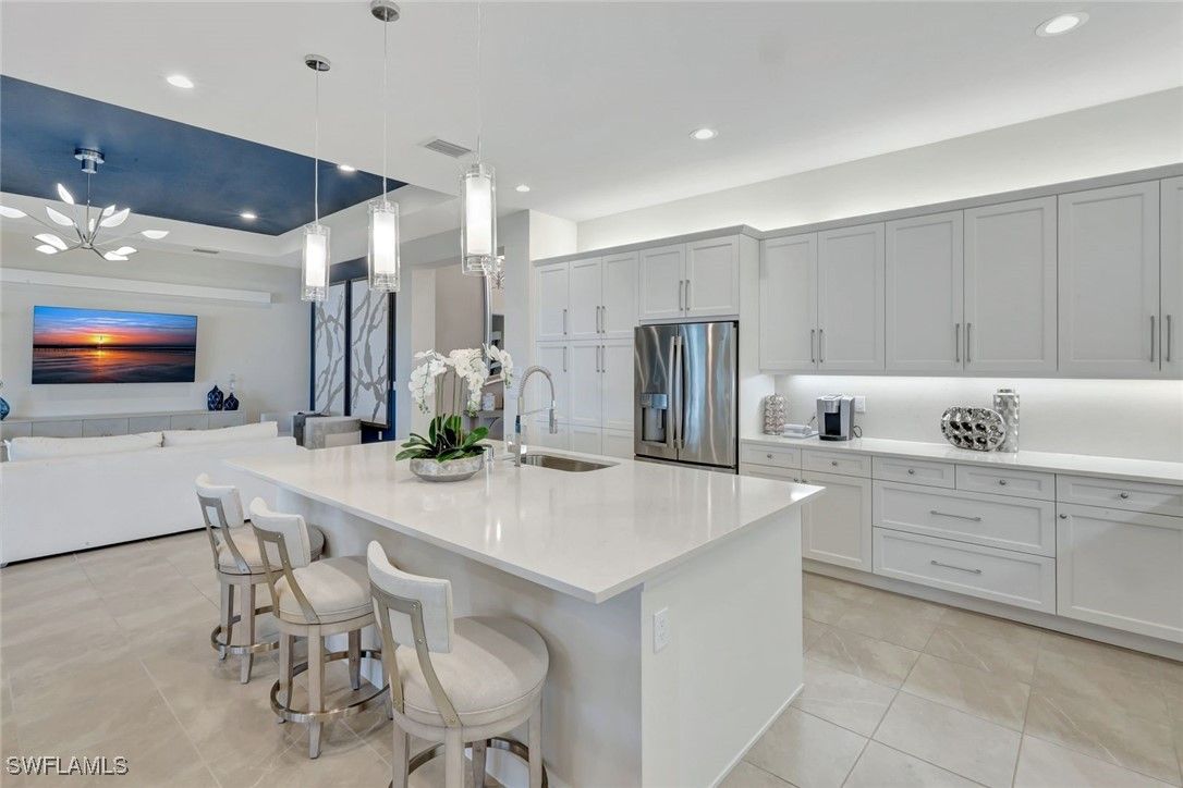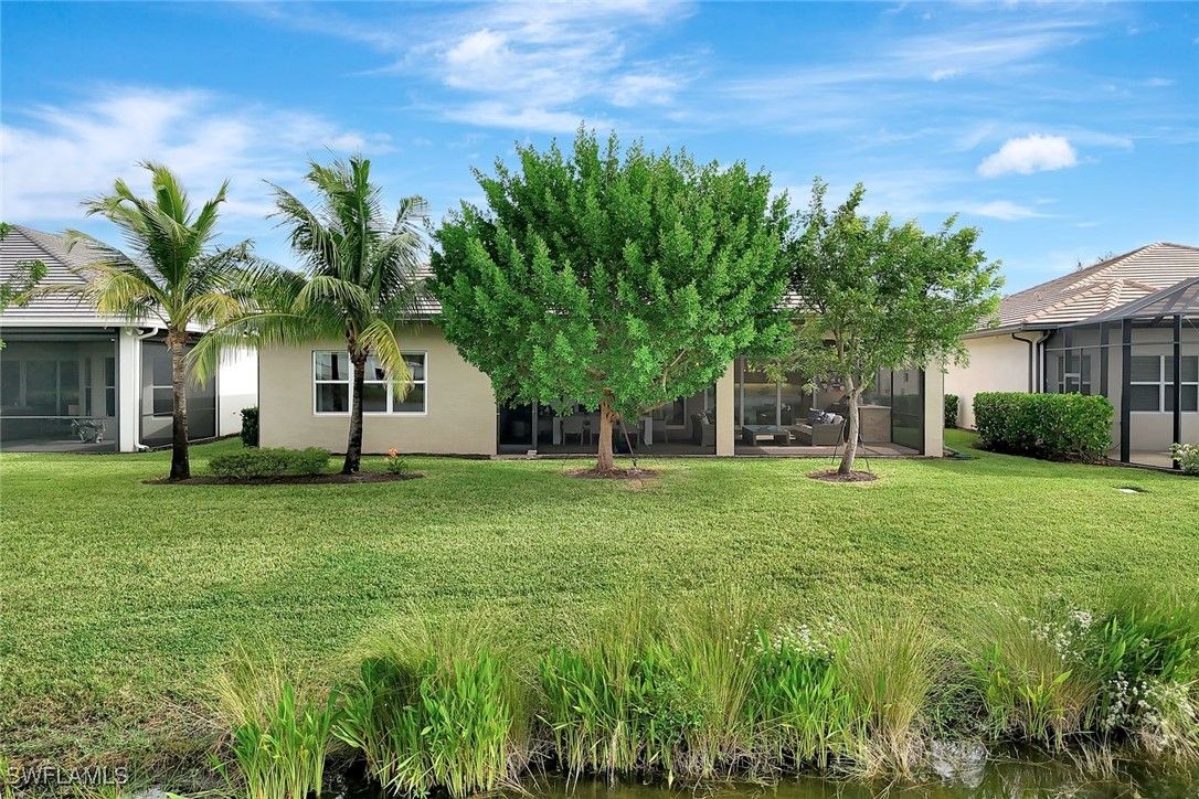 JUST REDUCED! This top selling NAPA floor plan for GL Homes is located in Valencia Bonita, a 55+ Active Adult manned gated community which provides resort living at its best. As you enter the home through the upgraded glass front doors, the first thing you notice is one of the best lake views in the community. This view on the largest lake, is really appreciated when relaxing or entertaining on the oversized covered back patio watching the beautiful sunset. There is no pool but there is room for the addition of a pool. Pool drawing available. At the clubhouse, you have access to all the resort amenities, including the 45,000 sq. ft. clubhouse with indoor and outdoor restaurants, bars, many pools & more. This desired floor plan was designed to offer a bright open great room concept with 4 bedrooms each with their own private bathrooms plus a versatile den along with a half bath and a spacious 3-car epoxied floored garage. This well appointed home with many upgrades and striking designer chandeliers provides the ultimate Florida lifestyle. Highlights include a custom outdoor kitchen with a four season outdoor refrigerator, impact glass, custom built-ins in the den & dining area, providing pull out lower drawers, quartz countertop with wine chiller, upgraded 17” tile flooring in main living area and den, large walk-in customize closets in the primary bedroom along with new carpeting and motorized shades on all windows. The gourmet kitchen boasts upgraded appliances with a BOSCH natural gas range, upgraded sparkling quartz countertops, 42” upper white wood cabinetry with above & undercabinet lighting, along with molding and valence on cabinets, pull out base drawers along with upper glass cabinet fronts with lighting & a large cabinet pantry. Also provided is a large single bowl stainless steel undermount sink with a modernized chrome faucet and expanded overhead LED lighting. The primary suite bathroom offers dual vanities, white wood raised panel cabinets, quartz countertops, large walk-in shower, soaking tub, a custom cabinet linen closet & builder upgraded tile package for flooring and shower walls. All other bathrooms come appointed with quartz countertops, white wood raised panel cabinets, banjo feature on senior height toilets and builder upgraded tile packages. Valencia Bonita is a top selling Active Adult 55+ community in Bonita Springs with a spectacular clubhouse and amenities! The clubhouse is located on a 10-acre complex offering a resort style swimming pool, 60 ft. lap swimming pool, resistance exercise pool, grandchildren wading pool, racket center pro shop, tennis courts, pickelball courts, bocce courts, dog park & fire pit. Residents also enjoy performances and social events in the grand ballroom, fully equipped fitness center, spa with treatment rooms & nail salon, restaurant with indoor and outdoor bars, card rooms, sports lounge, arts and crafts room, yoga/exercise, studio, ping-pong, massage rooms & so much more!
