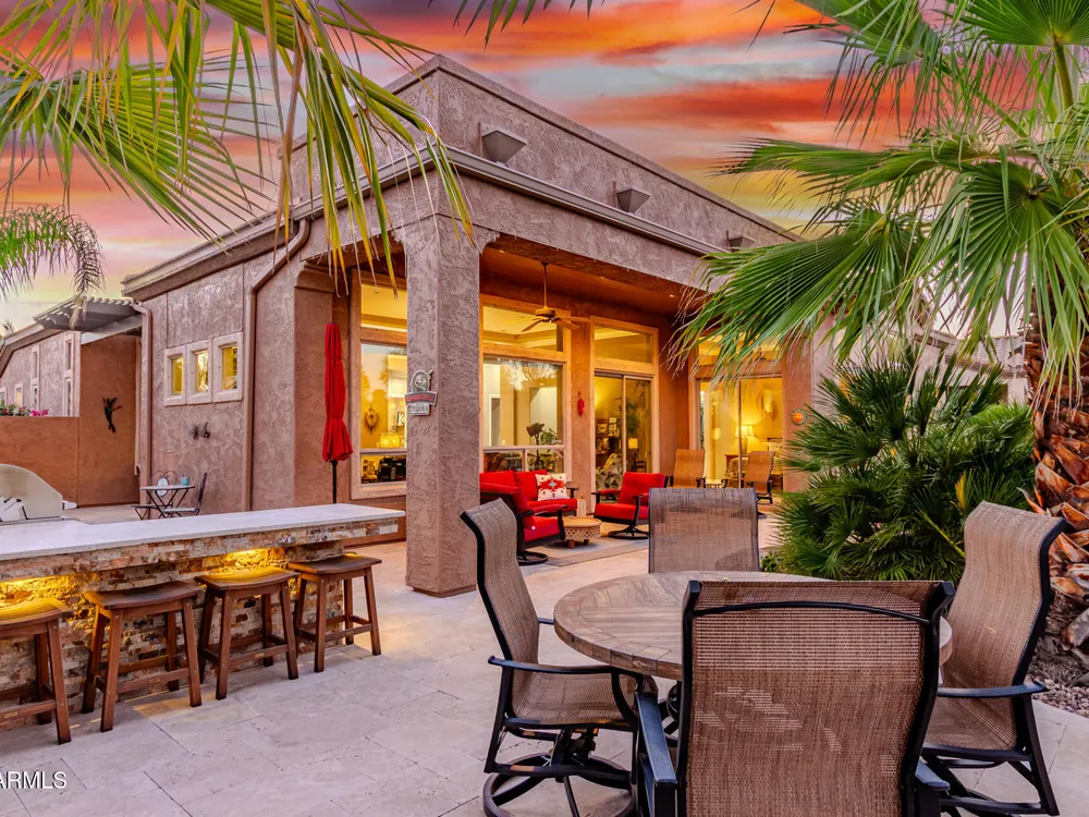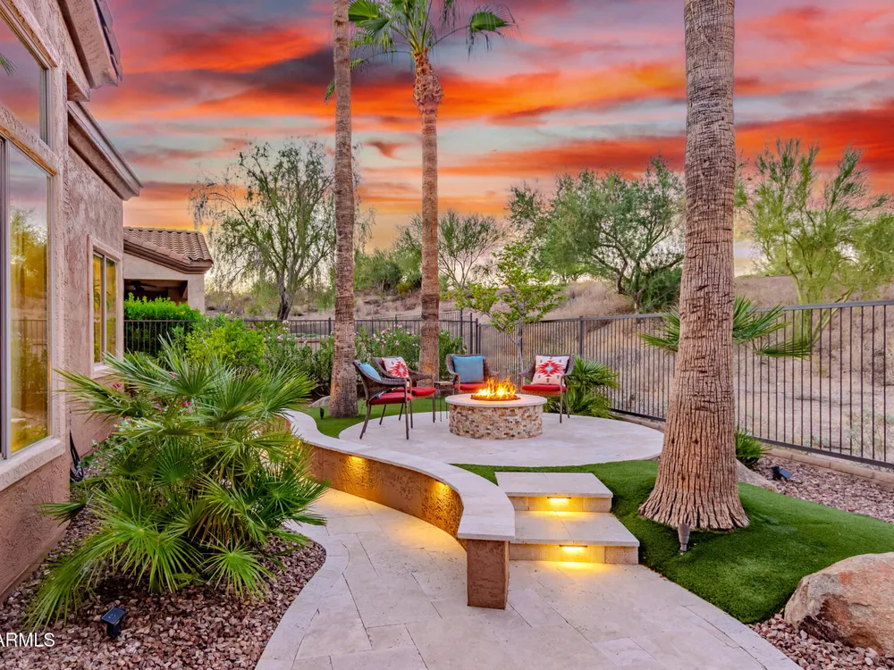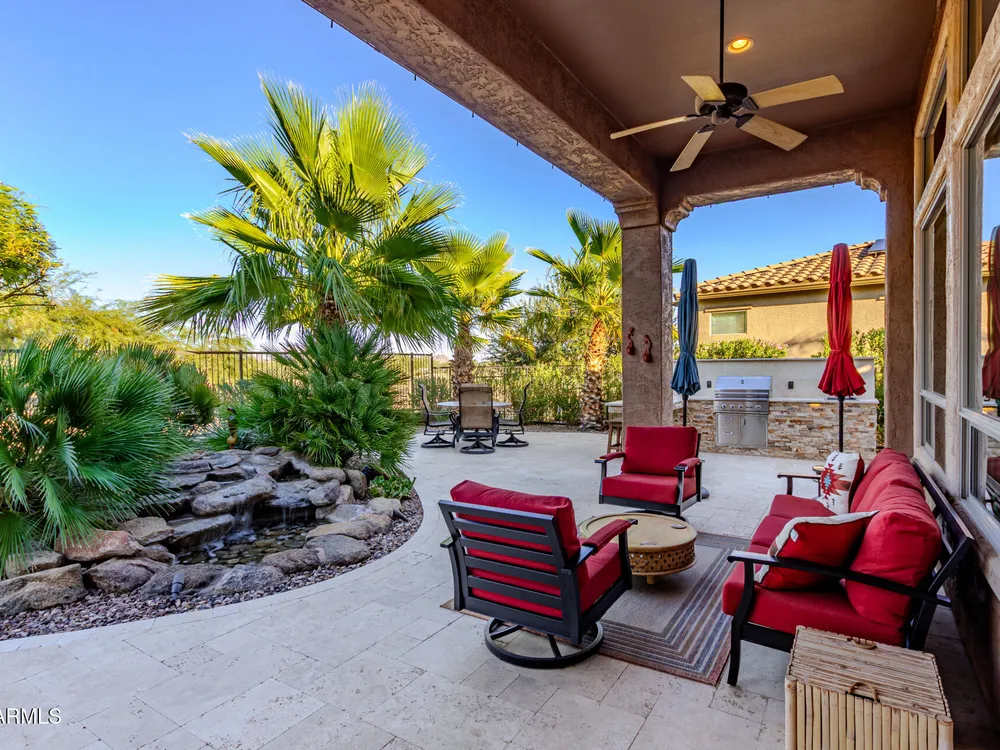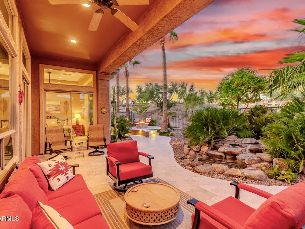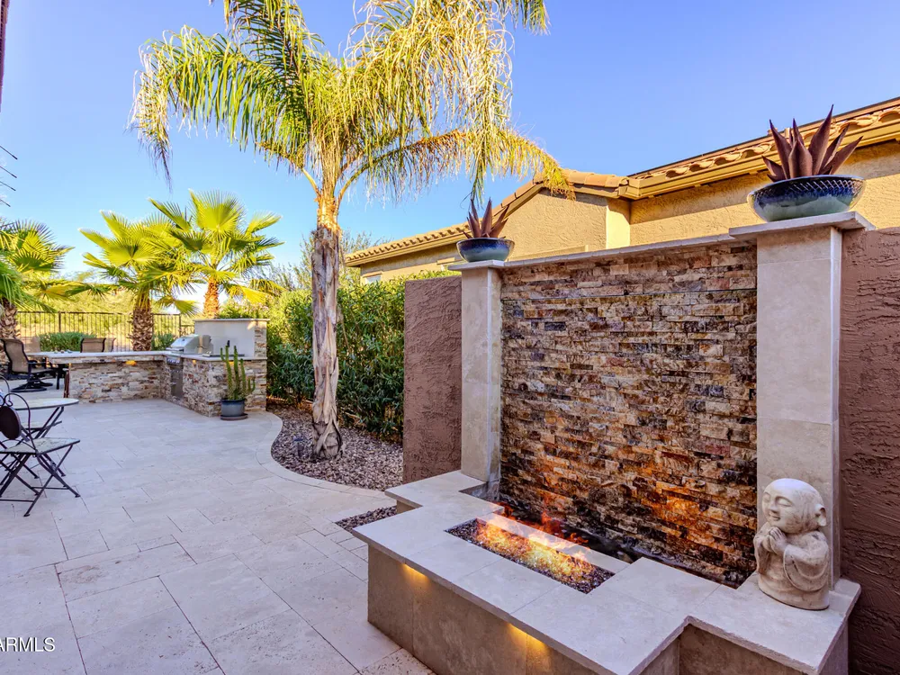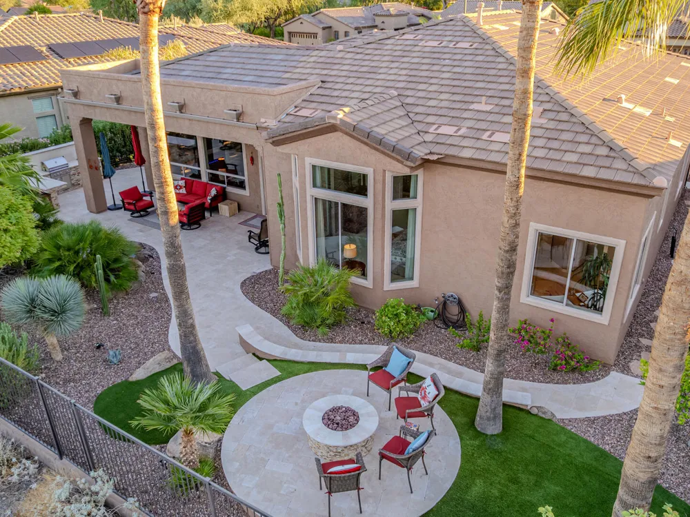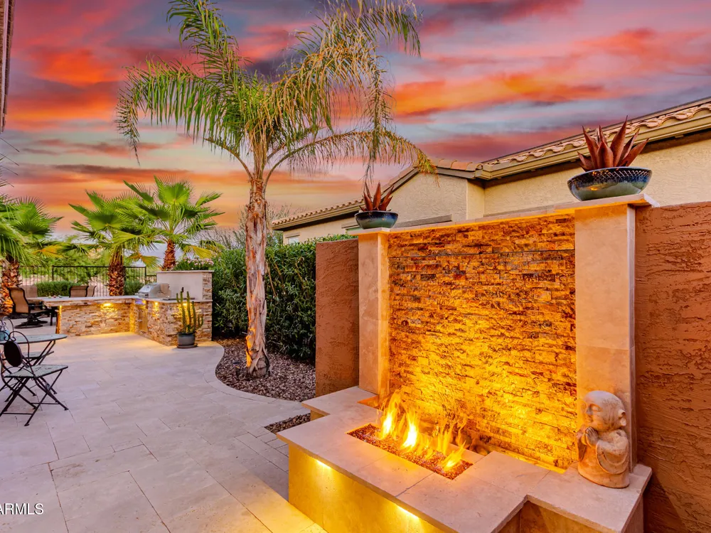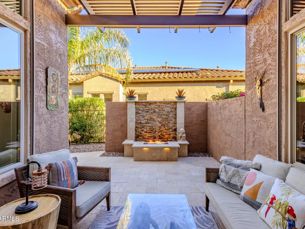 Beautifully updated Aurora floorplan on the golf course with stunning mountain views, an east-facing backyard for incredible sunrises, and over $140K in recent improvements & upgrades! This spacious home features soaring 12' ceilings, crown molding in all major rooms, and an open, versatile layout with a front den, formal dining/flex space, and a light-filled family room with gas fireplace & option to change flame colors, stacked stone entertainment wall, and expansive windows framing the views. The chef's kitchen showcases quartzite counters and backsplash, dual islands, pendant lighting, and access to a private courtyard just steps away. The primary suite offers a remodeled bath with quartzite counters, soaking tub, and two generous walk-in closets, while the guest bath and laundry room also feature quartzite countertops. Both bedrooms have new carpet (2024). Custom sliding glass doors provide privacy to the den/office, creating an ideal workspace. Extensive upgrades include two new A/C units (2021 & 2025), new roof with transferrable warranty (2025), Rainsoft water treatment system, fresh exterior paint (2024), and countless designer touches throughout. Step outside to a fully redesigned courtyard and backyard oasis featuring travertine hardscape, a soothing water wall with fireplace, outdoor seating area with custom built-in BBQ grill, stand-alone firepit, additional water feature, and misting system all perfect for entertaining or relaxing with friends. Welcome to the active adult community of Trilogy at Vistancia where you will find outstanding amenities, including 2 clubhouses, pickleball, tennis, bocce ball, fitness centers, swimming & golf, just to name a few! Trilogy is part of the community of Vistancia, a master-planned development that includes beautiful homes, parks & hiking trails, award-winning community centers & golf courses, commercial & retail shops, along with incredible rolling hills & desert landscape all around! The future 320-acre 5 North at Vistancia commercial core is coming soon, home to the new ALA K-12 charter school. Vistancia has ranked as the #1 Master Planned Community in AZ for 12 years in a row (2013-2024)! Resort-style living at its best. Come & see why!