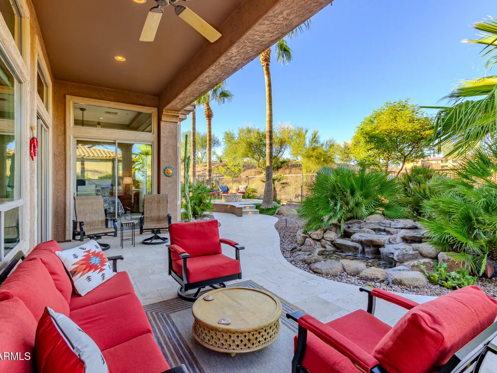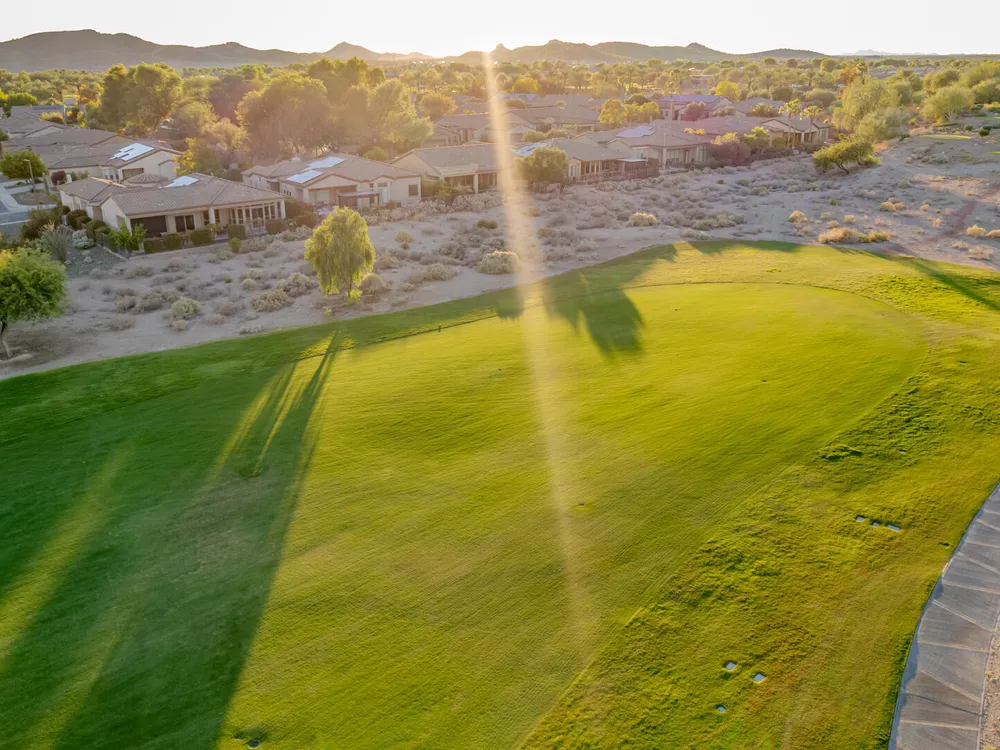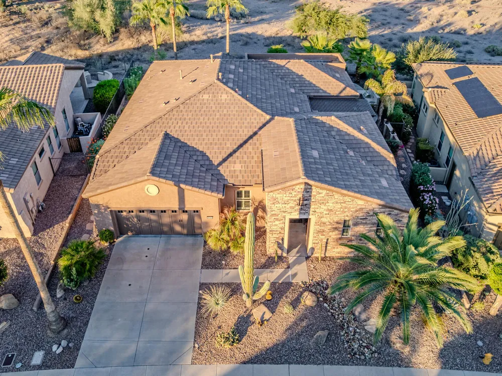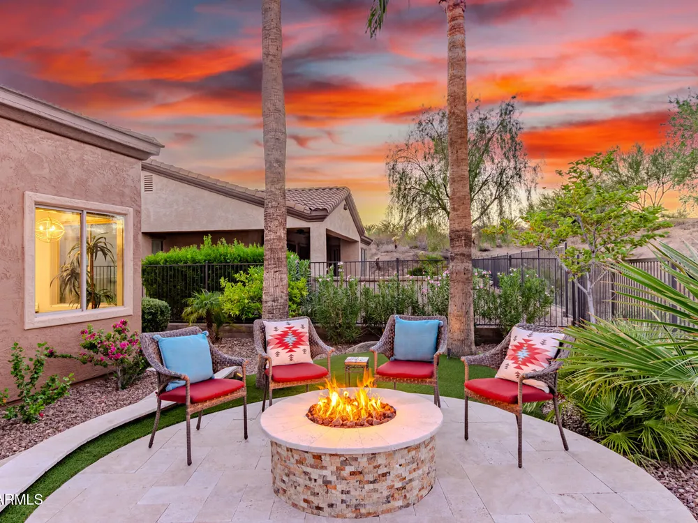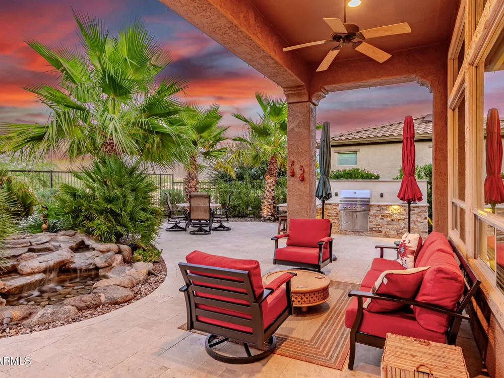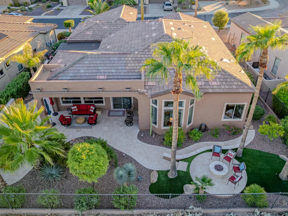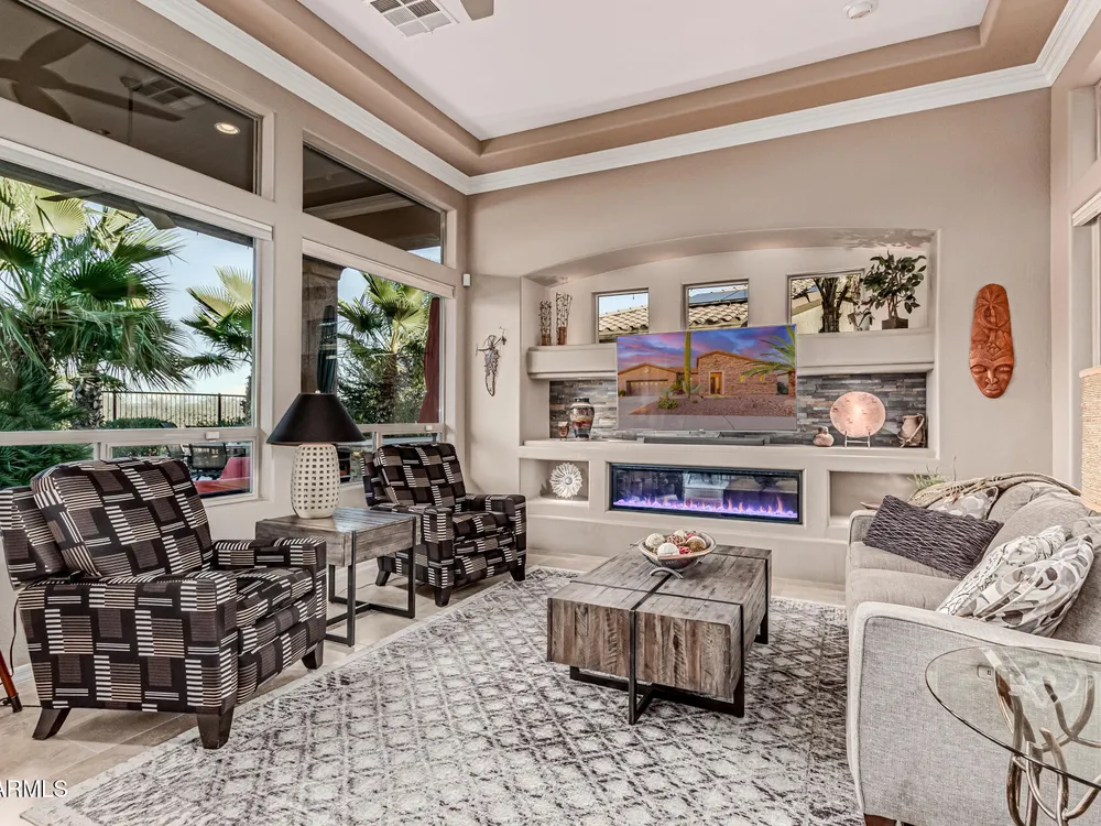 Beautifully updated Aurora floorplan on the golf course with stunning mountain views, an east-facing backyard for incredible sunrises, and over $140K in recent improvements & upgrades! This spacious home features soaring 12' ceilings, crown molding in all major rooms, and an open, versatile layout with a front den, formal dining/flex space, and a light-filled family room with gas fireplace & option to change flame colors, stacked stone entertainment wall, and expansive windows framing the views. The chef's kitchen showcases quartzite counters and backsplash, dual islands, pendant lighting, and access to a private courtyard just steps away. The primary suite offers a remodeled bath with quartzite counters, soaking tub, and two generous walk-in closets, while the guest bath and laundry room also feature quartzite countertops. Both bedrooms have new carpet (2024). Custom sliding glass doors provide privacy to the den/office, creating an ideal workspace. Extensive upgrades include two new A/C units (2021 & 2025), new roof with transferrable warranty (2025), Rainsoft water treatment system, fresh exterior paint (2024), and countless designer touches throughout. Step outside to a fully redesigned courtyard and backyard oasis featuring travertine hardscape, a soothing water wall with fireplace, outdoor seating area with custom built-in BBQ grill, stand-alone firepit, additional water feature, and misting system all perfect for entertaining or relaxing with friends. Welcome to the active adult community of Trilogy at Vistancia where you will find outstanding amenities, including 2 clubhouses, pickleball, tennis, bocce ball, fitness centers, swimming & golf, just to name a few! Trilogy is part of the community of Vistancia, a master-planned development that includes beautiful homes, parks & hiking trails, award-winning community centers & golf courses, commercial & retail shops, along with incredible rolling hills & desert landscape all around! The future 320-acre 5 North at Vistancia commercial core is coming soon, home to the new ALA K-12 charter school. Vistancia has ranked as the #1 Master Planned Community in AZ for 12 years in a row (2013-2024)! Resort-style living at its best. Come & see why!