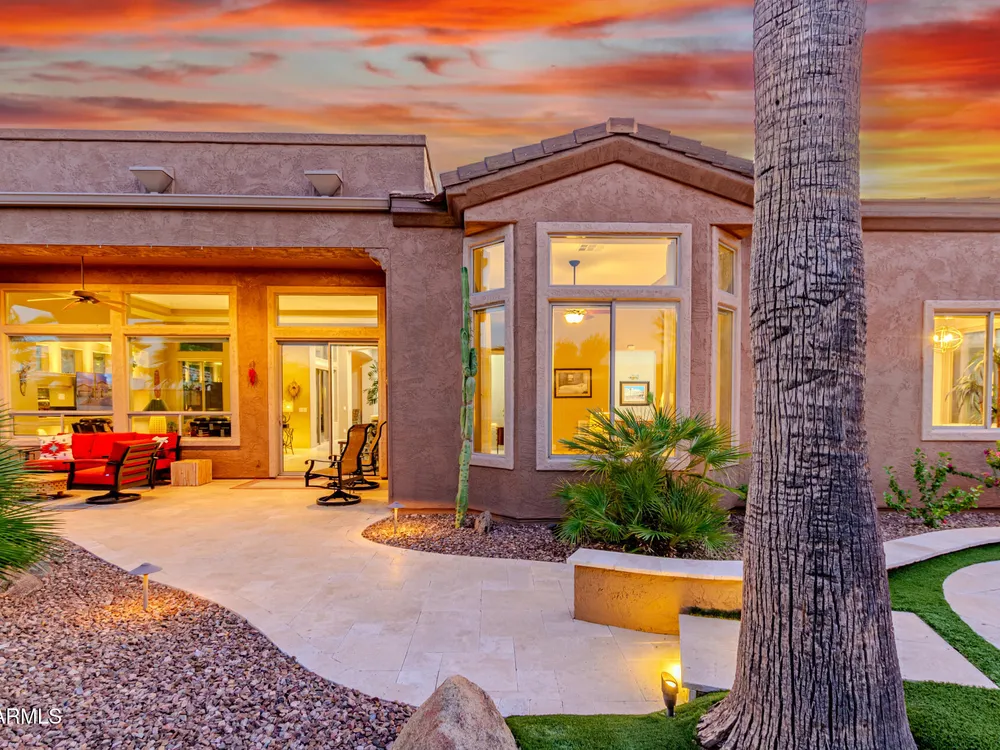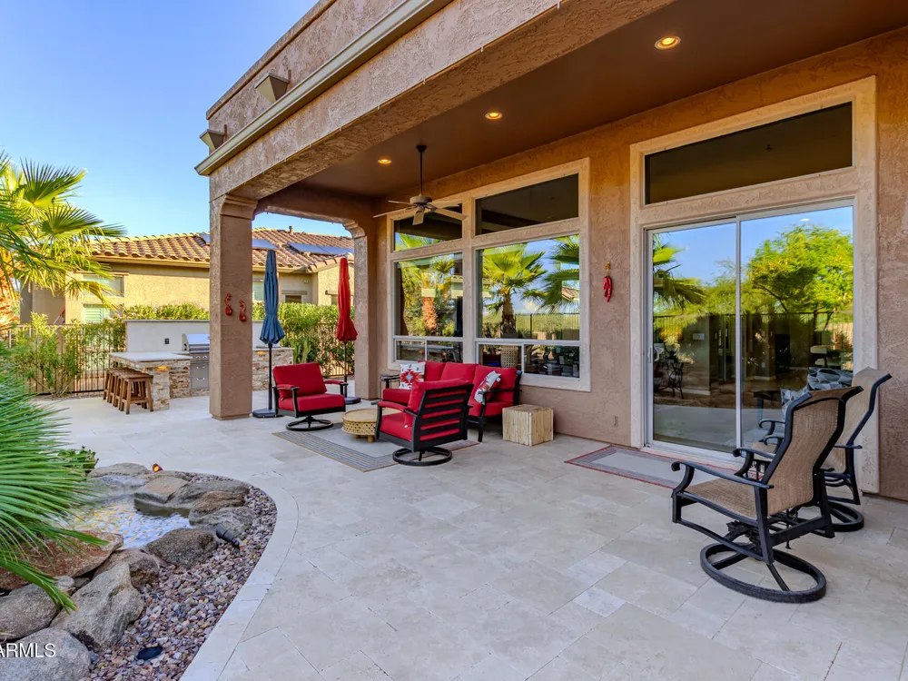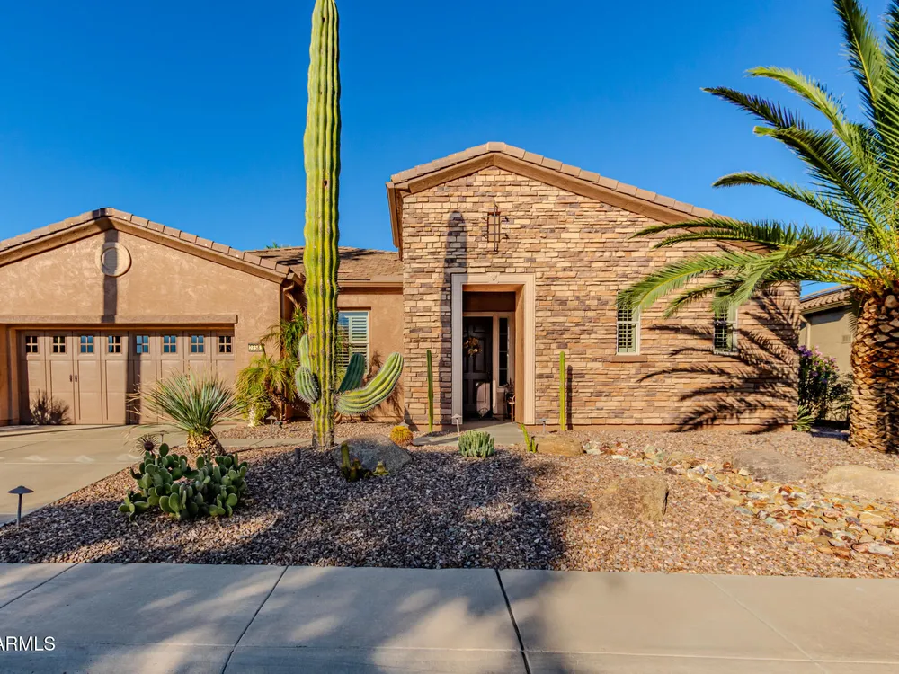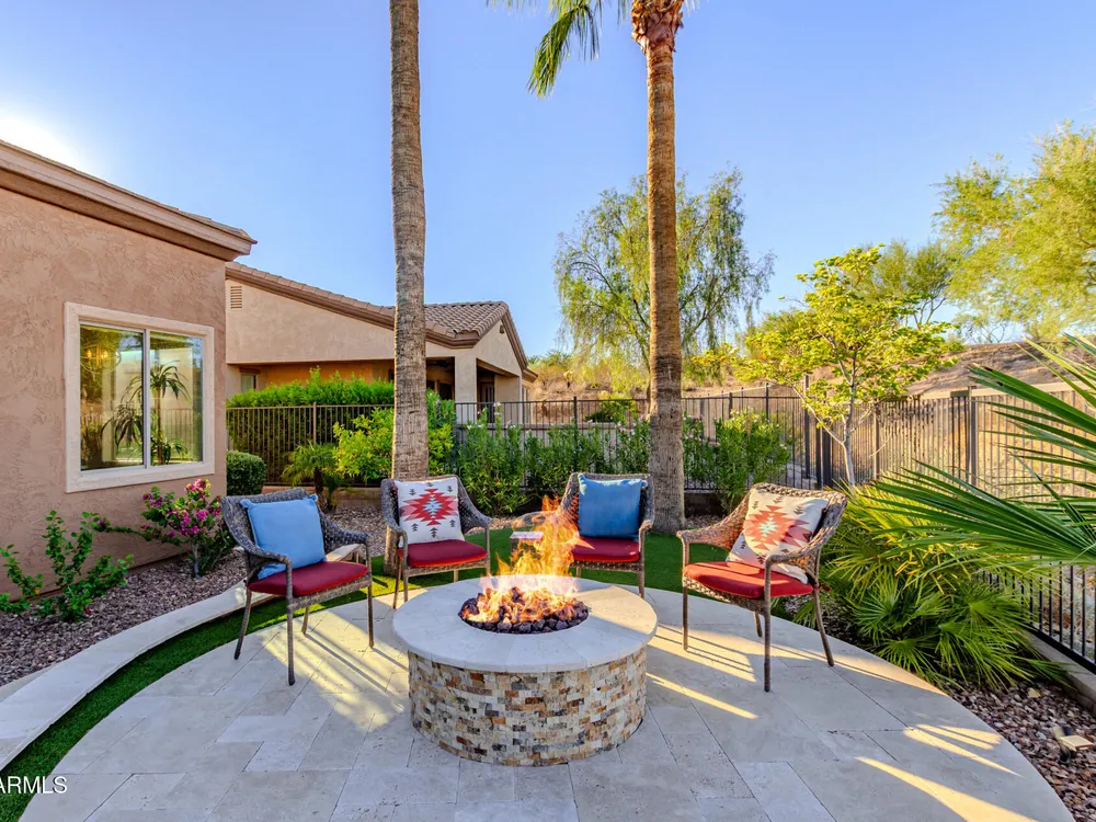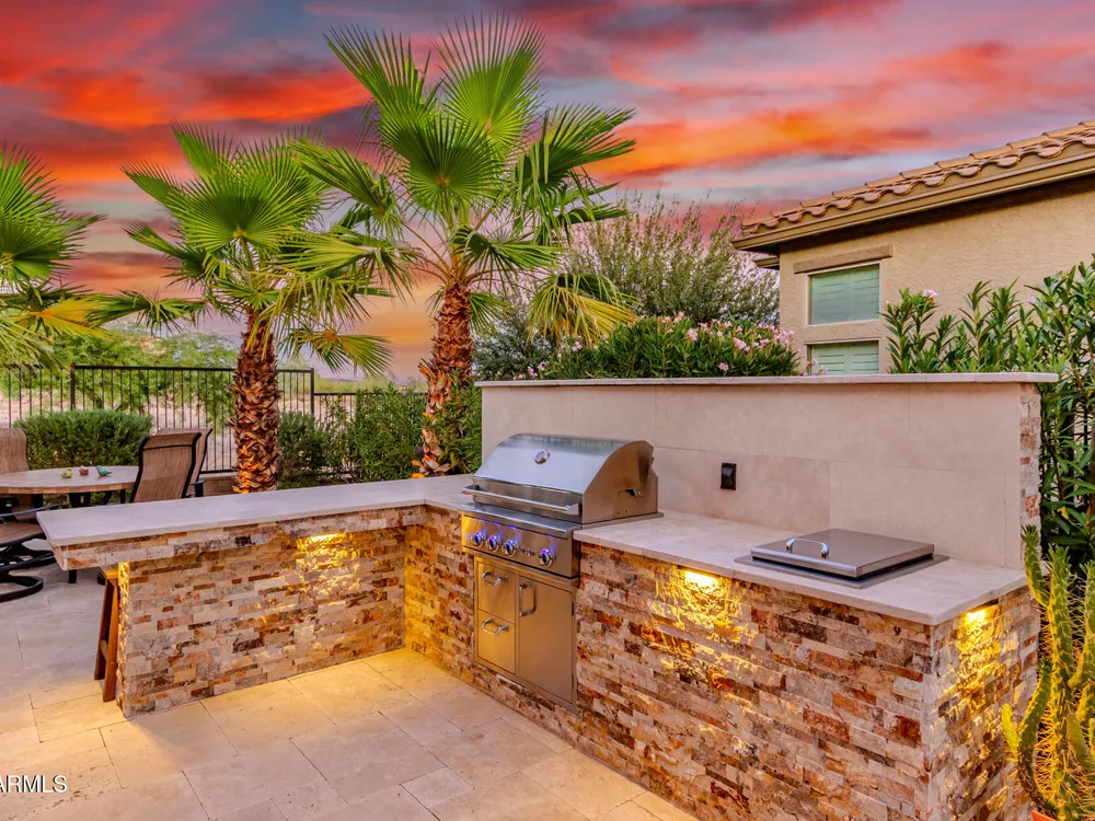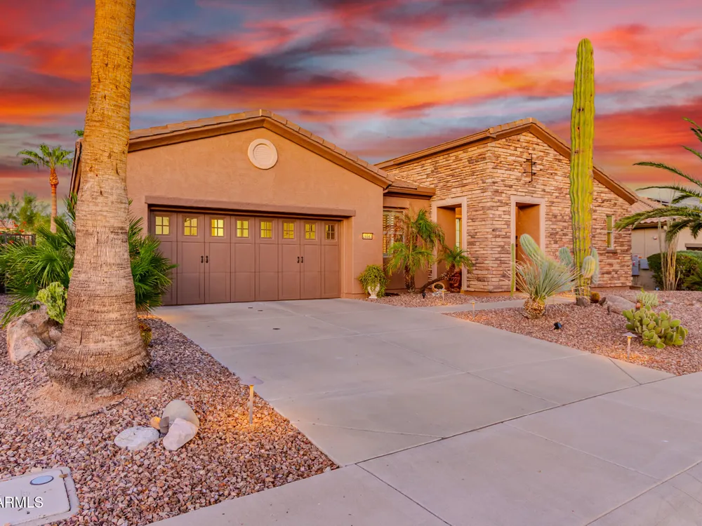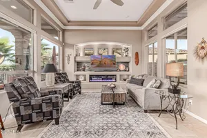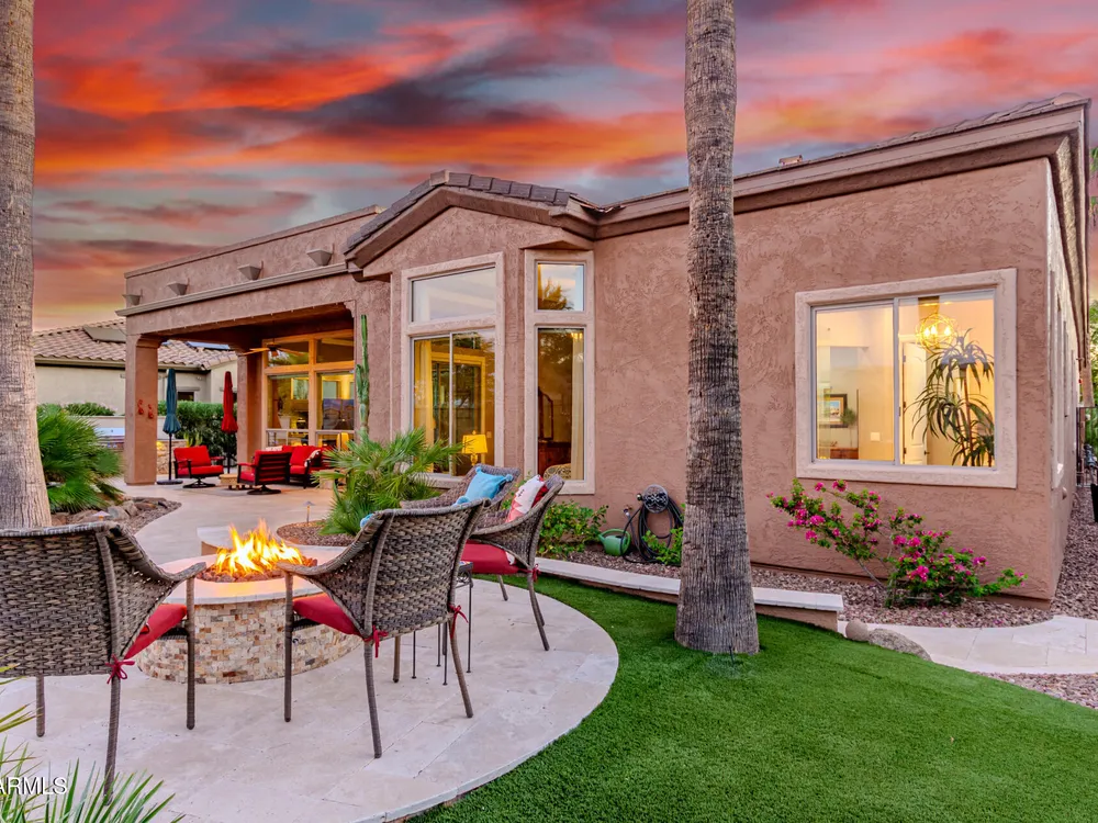 Beautifully updated Aurora floorplan on the golf course with stunning mountain views, an east-facing backyard for incredible sunrises, and over $140K in recent improvements & upgrades! This spacious home features soaring 12' ceilings, crown molding in all major rooms, and an open, versatile layout with a front den, formal dining/flex space, and a light-filled family room with gas fireplace & option to change flame colors, stacked stone entertainment wall, and expansive windows framing the views. The chef's kitchen showcases quartzite counters and backsplash, dual islands, pendant lighting, and access to a private courtyard just steps away. The primary suite offers a remodeled bath with quartzite counters, soaking tub, and two generous walk-in closets, while the guest bath and laundry room also feature quartzite countertops. Both bedrooms have new carpet (2024). Custom sliding glass doors provide privacy to the den/office, creating an ideal workspace. Extensive upgrades include two new A/C units (2021 & 2025), new roof with transferrable warranty (2025), Rainsoft water treatment system, fresh exterior paint (2024), and countless designer touches throughout. Step outside to a fully redesigned courtyard and backyard oasis featuring travertine hardscape, a soothing water wall with fireplace, outdoor seating area with custom built-in BBQ grill, stand-alone firepit, additional water feature, and misting system all perfect for entertaining or relaxing with friends. Welcome to the active adult community of Trilogy at Vistancia where you will find outstanding amenities, including 2 clubhouses, pickleball, tennis, bocce ball, fitness centers, swimming & golf, just to name a few! Trilogy is part of the community of Vistancia, a master-planned development that includes beautiful homes, parks & hiking trails, award-winning community centers & golf courses, commercial & retail shops, along with incredible rolling hills & desert landscape all around! The future 320-acre 5 North at Vistancia commercial core is coming soon, home to the new ALA K-12 charter school. Vistancia has ranked as the #1 Master Planned Community in AZ for 12 years in a row (2013-2024)! Resort-style living at its best. Come & see why!