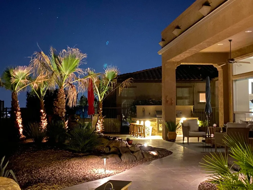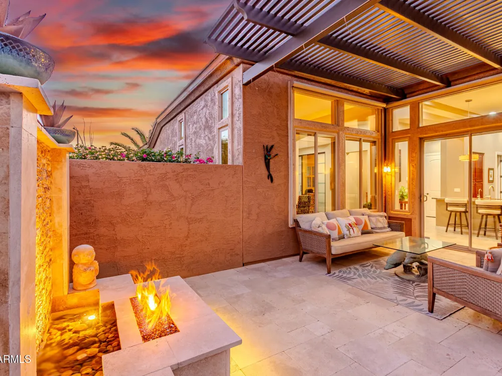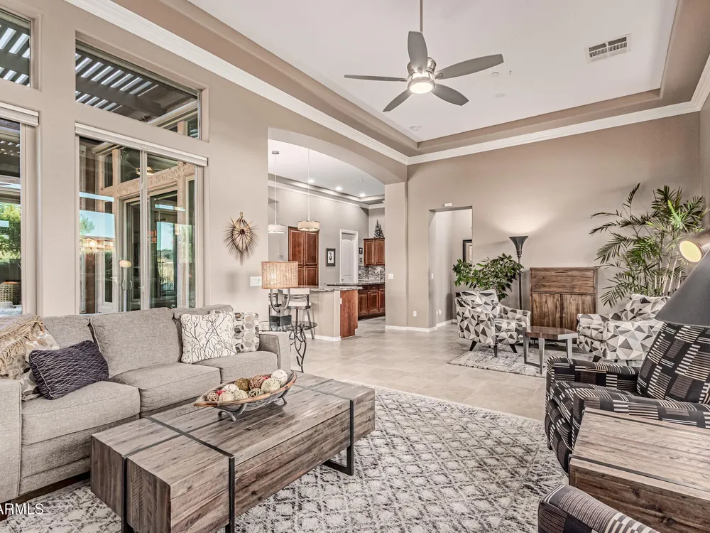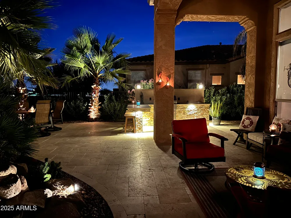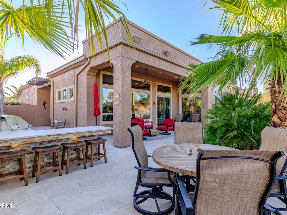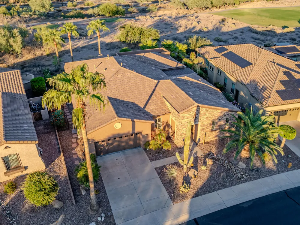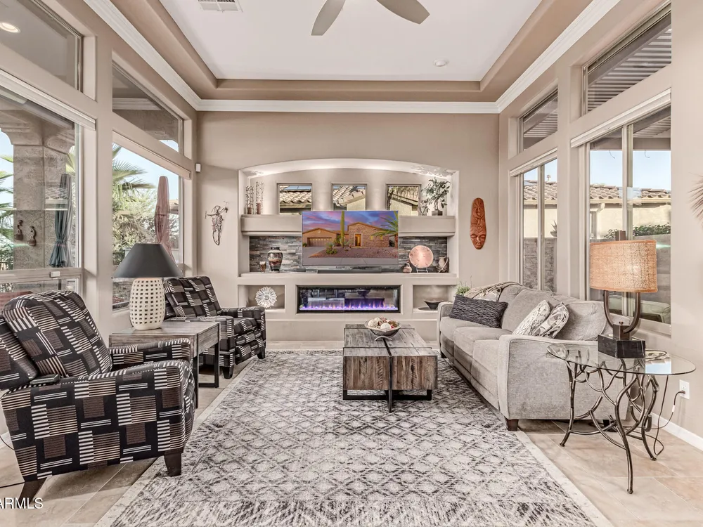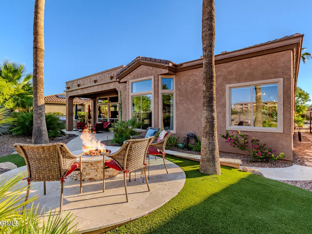 Beautifully updated Aurora floorplan on the golf course with stunning mountain views, an east-facing backyard for incredible sunrises, and over $140K in recent improvements & upgrades! This spacious home features soaring 12' ceilings, crown molding in all major rooms, and an open, versatile layout with a front den, formal dining/flex space, and a light-filled family room with gas fireplace & option to change flame colors, stacked stone entertainment wall, and expansive windows framing the views. The chef's kitchen showcases quartzite counters and backsplash, dual islands, pendant lighting, and access to a private courtyard just steps away. The primary suite offers a remodeled bath with quartzite counters, soaking tub, and two generous walk-in closets, while the guest bath and laundry room also feature quartzite countertops. Both bedrooms have new carpet (2024). Custom sliding glass doors provide privacy to the den/office, creating an ideal workspace. Extensive upgrades include two new A/C units (2021 & 2025), new roof with transferrable warranty (2025), Rainsoft water treatment system, fresh exterior paint (2024), and countless designer touches throughout. Step outside to a fully redesigned courtyard and backyard oasis featuring travertine hardscape, a soothing water wall with fireplace, outdoor seating area with custom built-in BBQ grill, stand-alone firepit, additional water feature, and misting system all perfect for entertaining or relaxing with friends. Welcome to the active adult community of Trilogy at Vistancia where you will find outstanding amenities, including 2 clubhouses, pickleball, tennis, bocce ball, fitness centers, swimming & golf, just to name a few! Trilogy is part of the community of Vistancia, a master-planned development that includes beautiful homes, parks & hiking trails, award-winning community centers & golf courses, commercial & retail shops, along with incredible rolling hills & desert landscape all around! The future 320-acre 5 North at Vistancia commercial core is coming soon, home to the new ALA K-12 charter school. Vistancia has ranked as the #1 Master Planned Community in AZ for 12 years in a row (2013-2024)! Resort-style living at its best. Come & see why!
