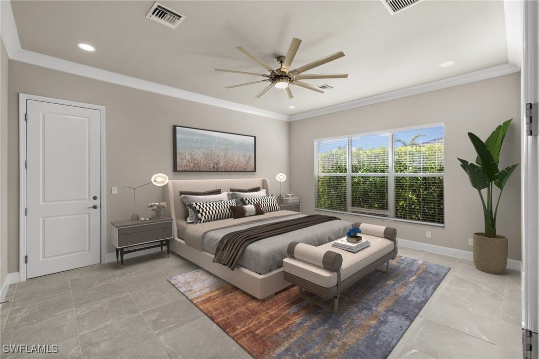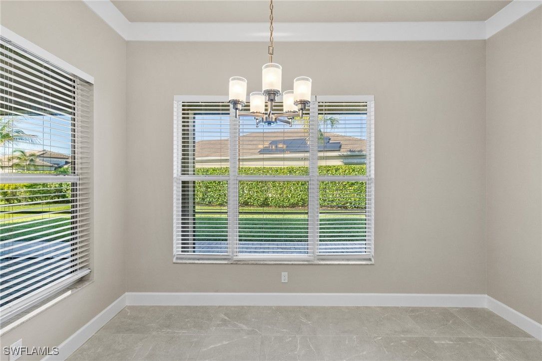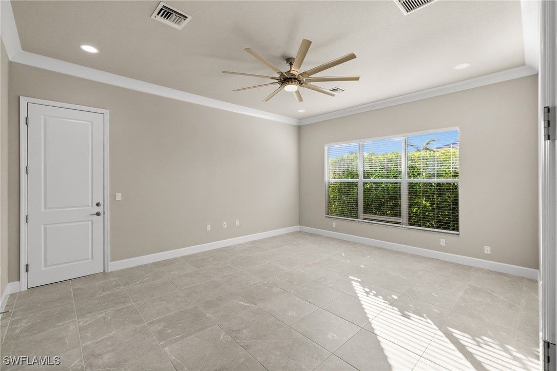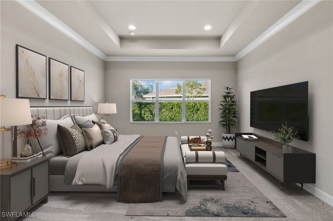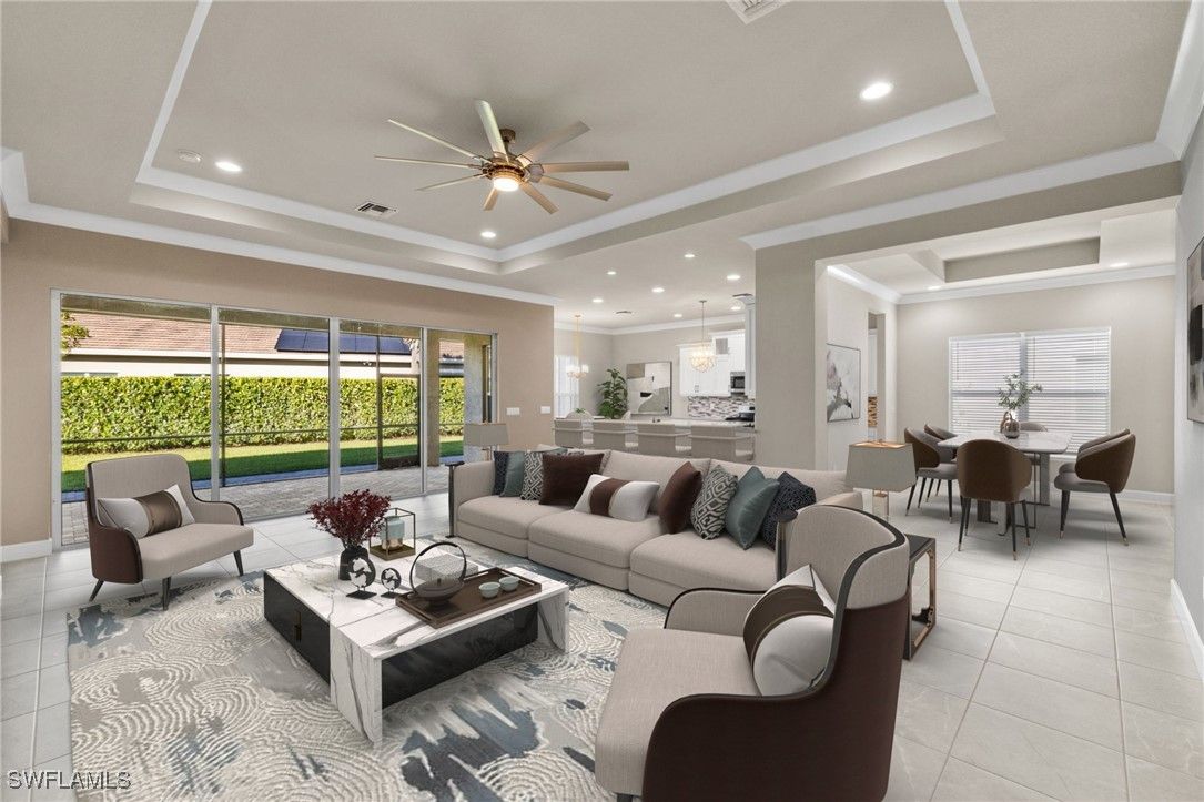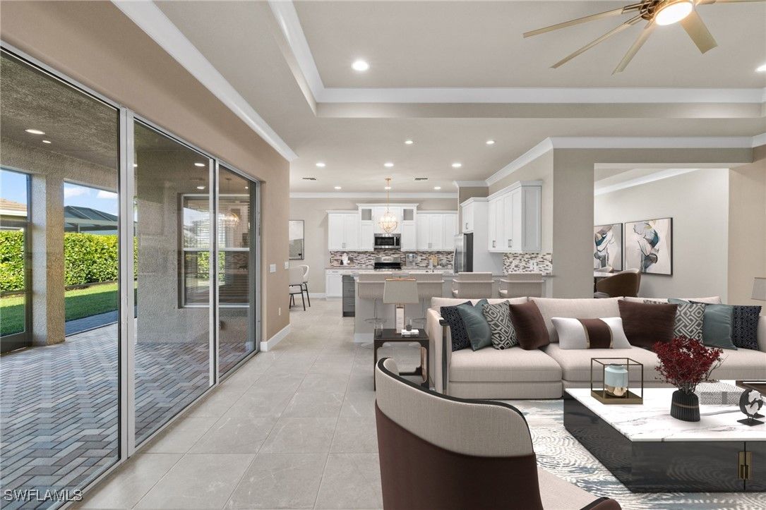Welcome to Valencia Bonita, one of Southwest Florida’s most desired resort communities! This thoughtfully designed Caroline floor plan, features a kitchen that is a chef’s dream, boasting NATURAL GAS cooking, a rarity in most southwest Florida homes. The custom cabinets, two toned, quartz countertops and tiled back splash make the kitchen pop and the large breakfast room off the kitchen is a great place to grab your morning coffee. The large, open concept floor plan opens up to your large lanai surrounded by beautifully manicured landscaping on one of the largest private Corner lots in all of Valencia. Let your imagination run wild as you create the outdoor living space of your dreams with additional electric and outside shower already in place! You’re ready to create your own paradise with a swimming pool and outside kitchen if desired. The expensive primary bedroom with luxury bath offers great space and privacy along with custom master closets. Step through the hall off the foyer into your spacious flex room featuring large double doors entrance, private courtyard entrance and separate garage great for a third bedroom, In-law suite or office. Other areas include an additional bedroom with large walk-in lit closet and custom bathroom. Take advantage of the owners upgrades with plumbing and electric in laundry room for sink and folding table, as well as custom cabinets for additional storage. Upgraded millwork throughout including primary bedroom. Electrical upgrades include additional outlets and high hats for plenty of overhead lighting. The third car garage offers room for storage or a golf cart. This home is Perfect for those seeking a tranquil retreat without sacrificing proximity to all the amenities Valencia has to offer. Valencia is a 55+ community that offers incredible amenities such as a 45,000 sf clubhouse, resort pool, eight pickleball courts, eight tennis courts, pool bar, restaurant, full service spa, resort pool, lap pool, dog park, bocce and an extensive social calendar! Home has been virtually staged.